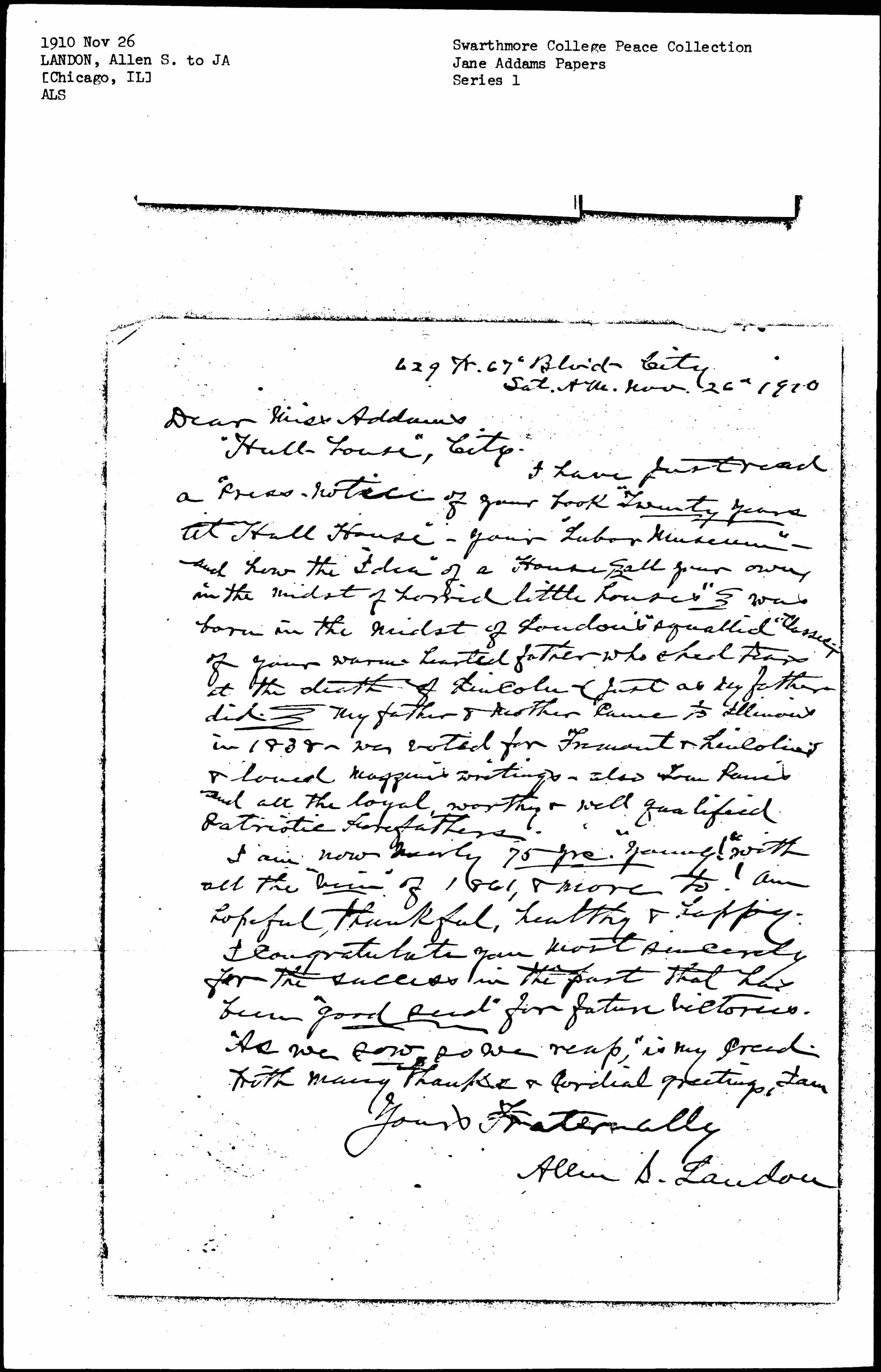 I have just read a press notice of your book "Twenty Years at Hull House" -- your "Labour Museum" -- and how the "Idea" of a House {all your own, in the midst of horrid little houses"} was born in the midst of London's "[squalid]" classes, of your warm hearted father who shed tears at the death of Lincoln (just as my father did.) My father & mother came to Illinois in 1838 -- we voted for Fremont & Lincoln & loved Mazzini's writings, also [Wm. Penn's] and all the loyal, worthy & well qualified patriotic forefathers.