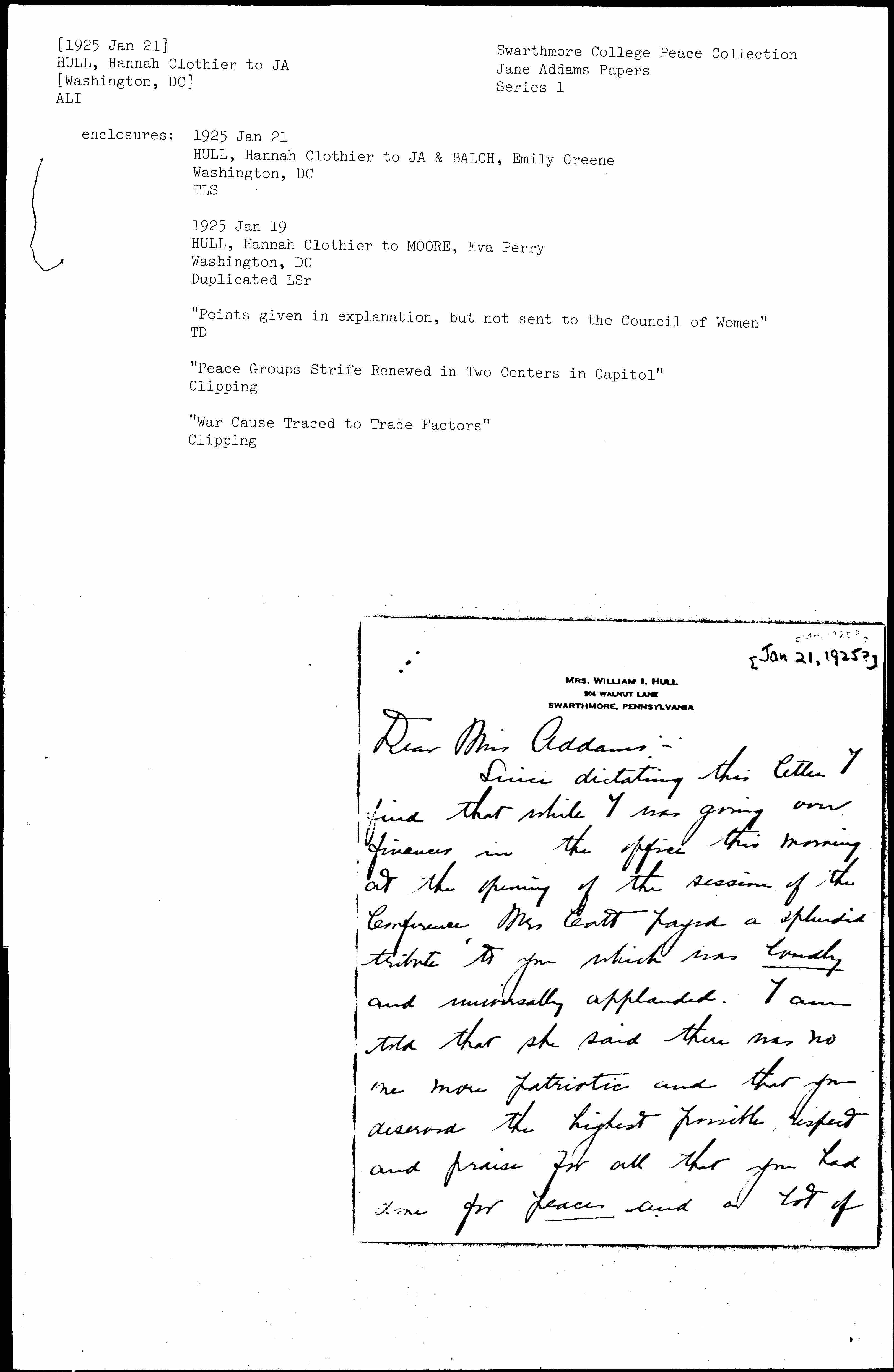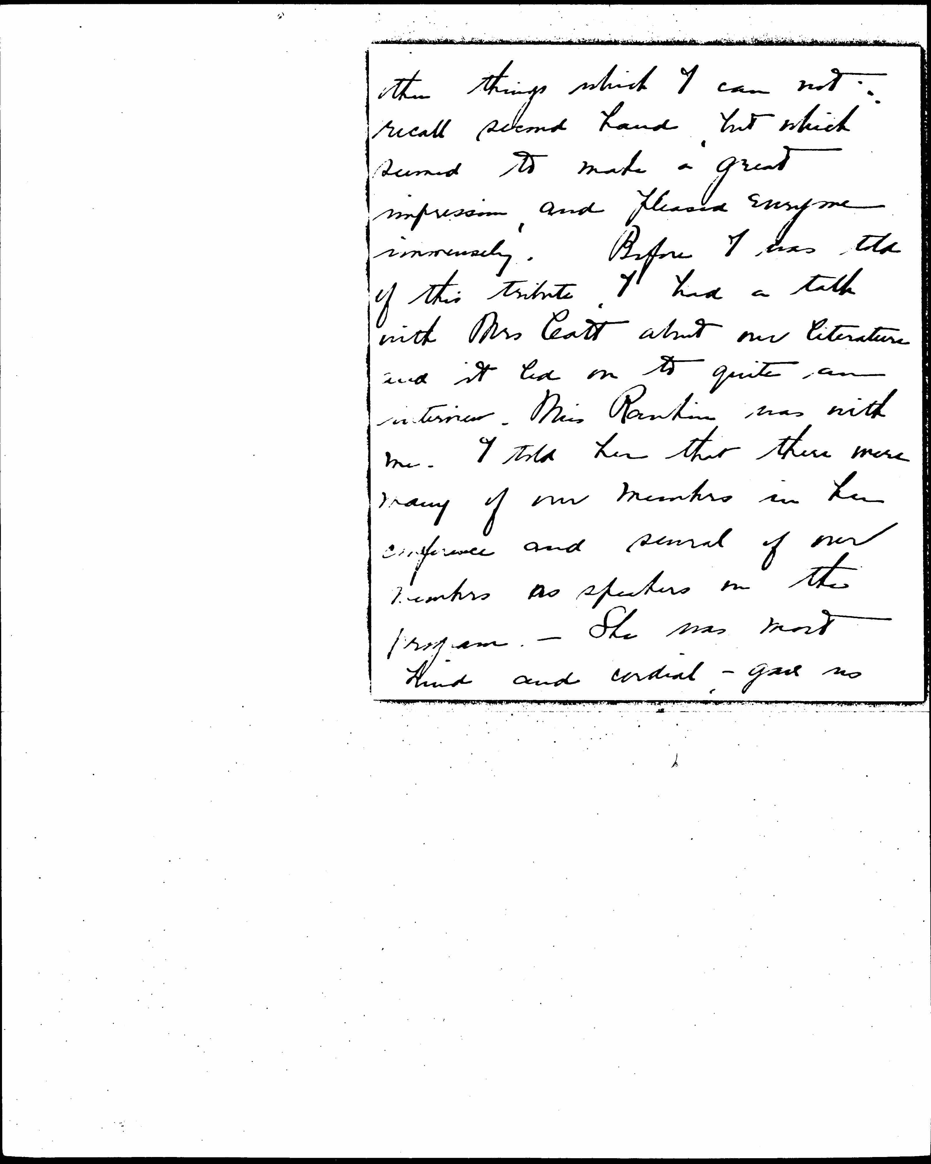 Since dictating this letter I find that while I was going over finances in the office this morning at the opening of the session of the Conference, Mrs Catt [paid] a splendid tribute to you which was lovely and universally applauded. I am told that she said there was no one more patriotic and that you deserved the highest possible respect and praise for all that you had done for peace and a lot of [page 2] other things which I can not recall second hand, but which seemed to make a great impression, and pleased everyone immensely. Before I was told of this tribute, I had a talk with Mrs Catt about our literature and it led on to quite an interview. Miss Rankin was with me. I told her that there were many of our members in her conference and several of our members as speakers on the program. -- She was most kind and cordial -- gave us [page 3] all the time we wanted, and would not be interrupted when others came after her. She thanked us for coming.
