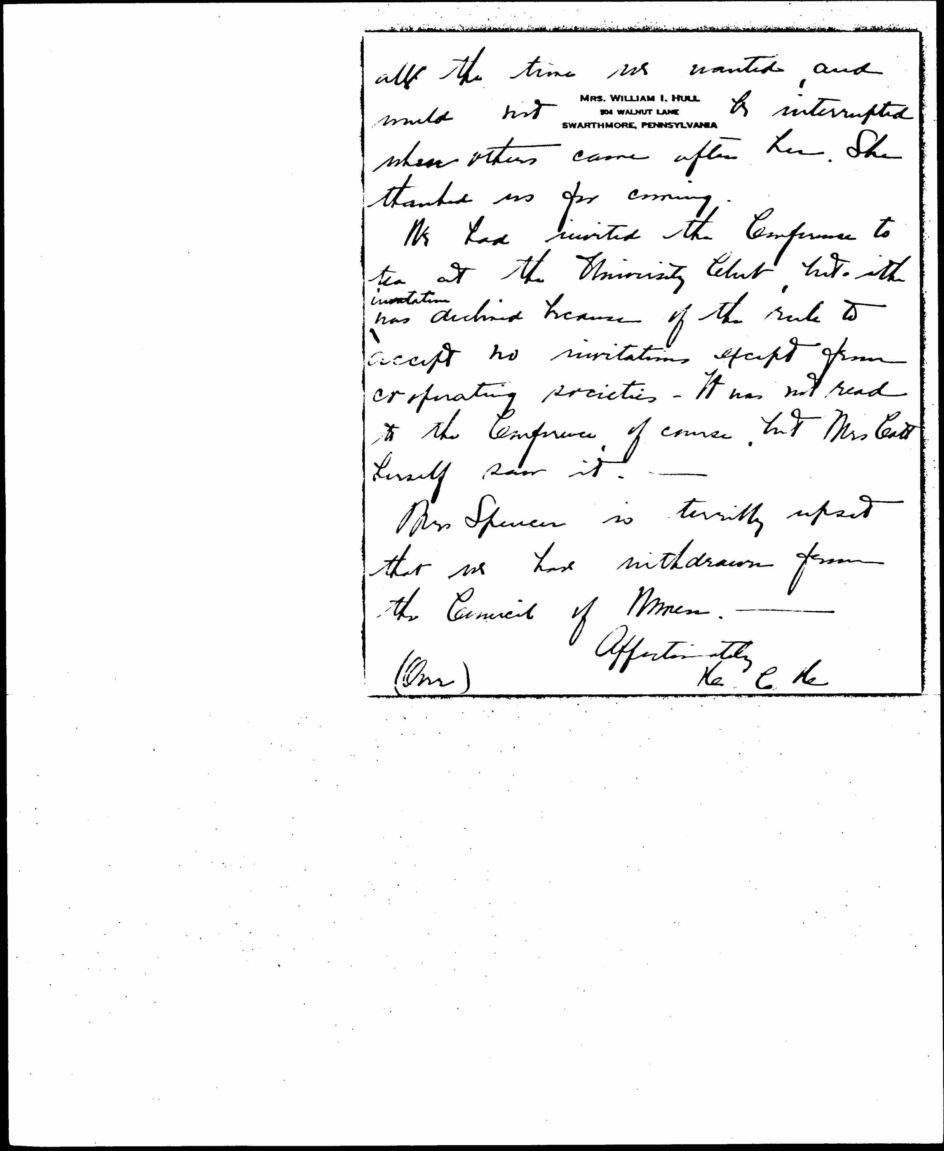 We had invited the Conference to tea at the University Club, but the ↑invitation↓ was declined because of the rule to accept no invitations except from cooperating societies. It was not read to the Conference, of course, but Mrs Catt herself saw it.