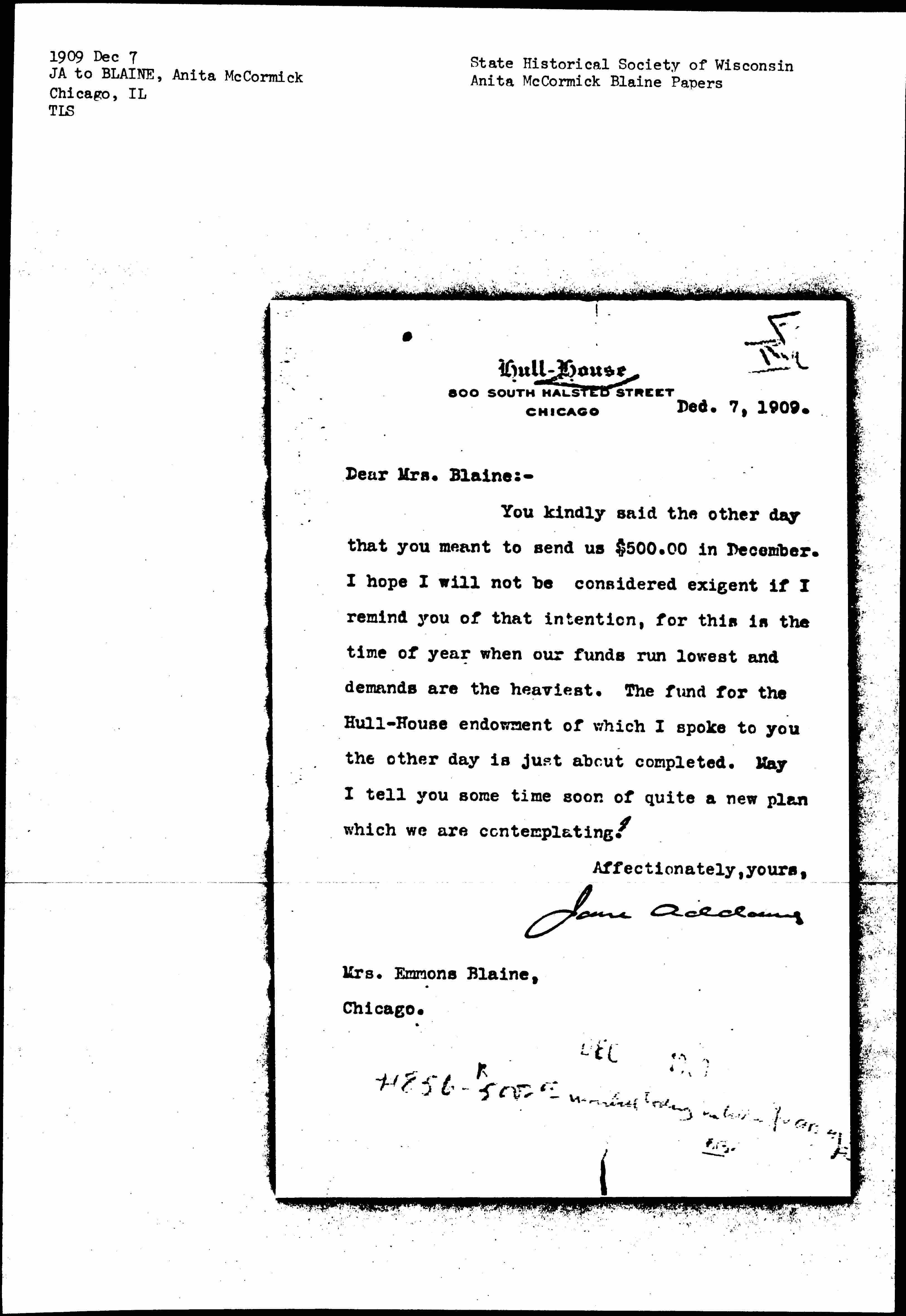 You kindly said the other day that you meant to send us $500.00 in December. I hope I will not be considered exigent if I remind you of that intention, for this is the time of year when our funds run lowest and demands are the heaviest. The fund for the Hull-House endowment of which I spoke to you the other day is just about completed. May I tell you some time soon of quite a new plan which we are contemplating?