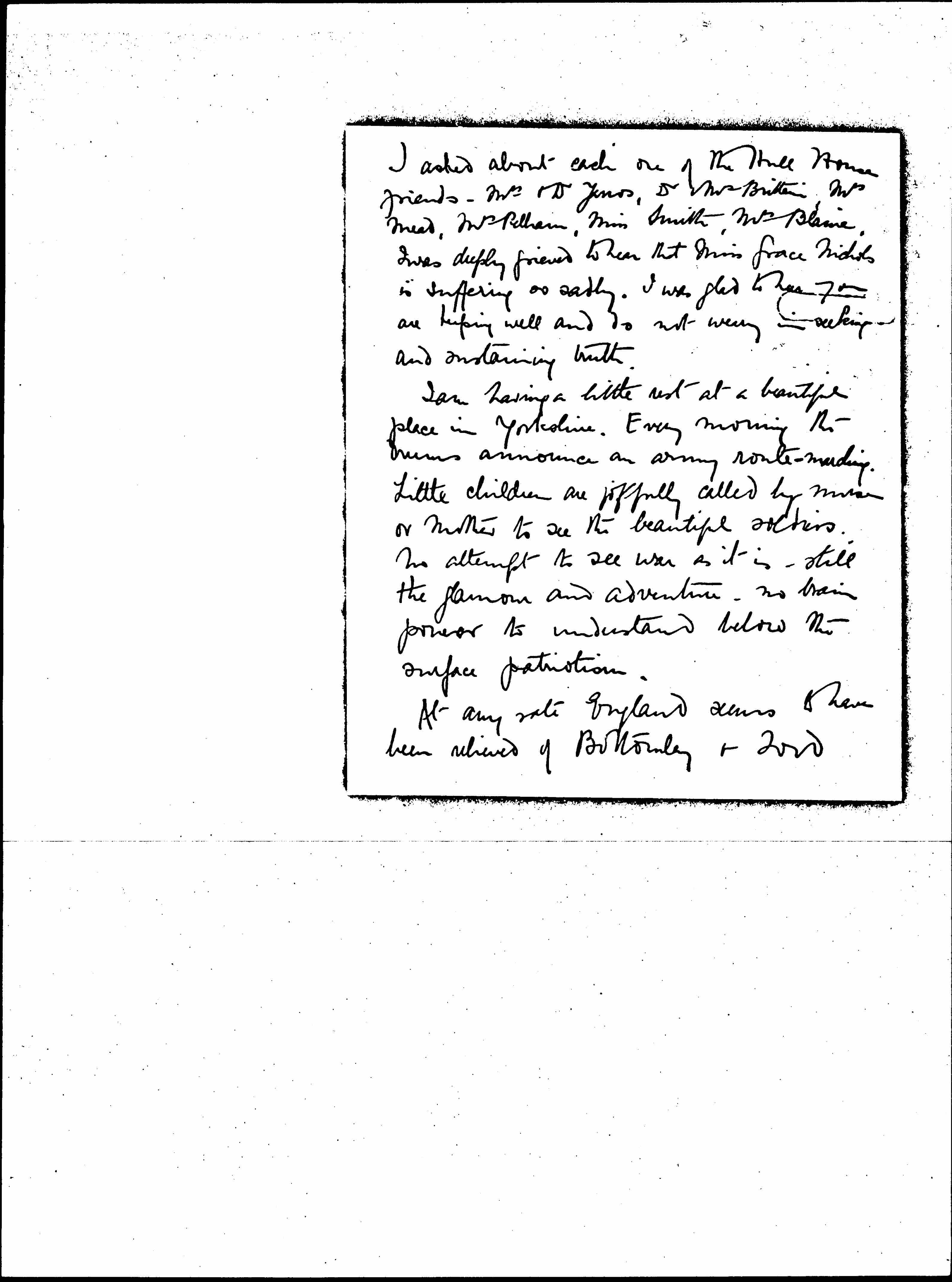 I am having a little rest at a beautiful place in Yorkshire. Every morning the [drums] announce an army route-[marching]. Little children are joyfully called by nurse or mother to see the beautiful soldiers. No attempt to see war as it is -- still the glamour and adventure -- no brain power to understand below the surface patriotism.