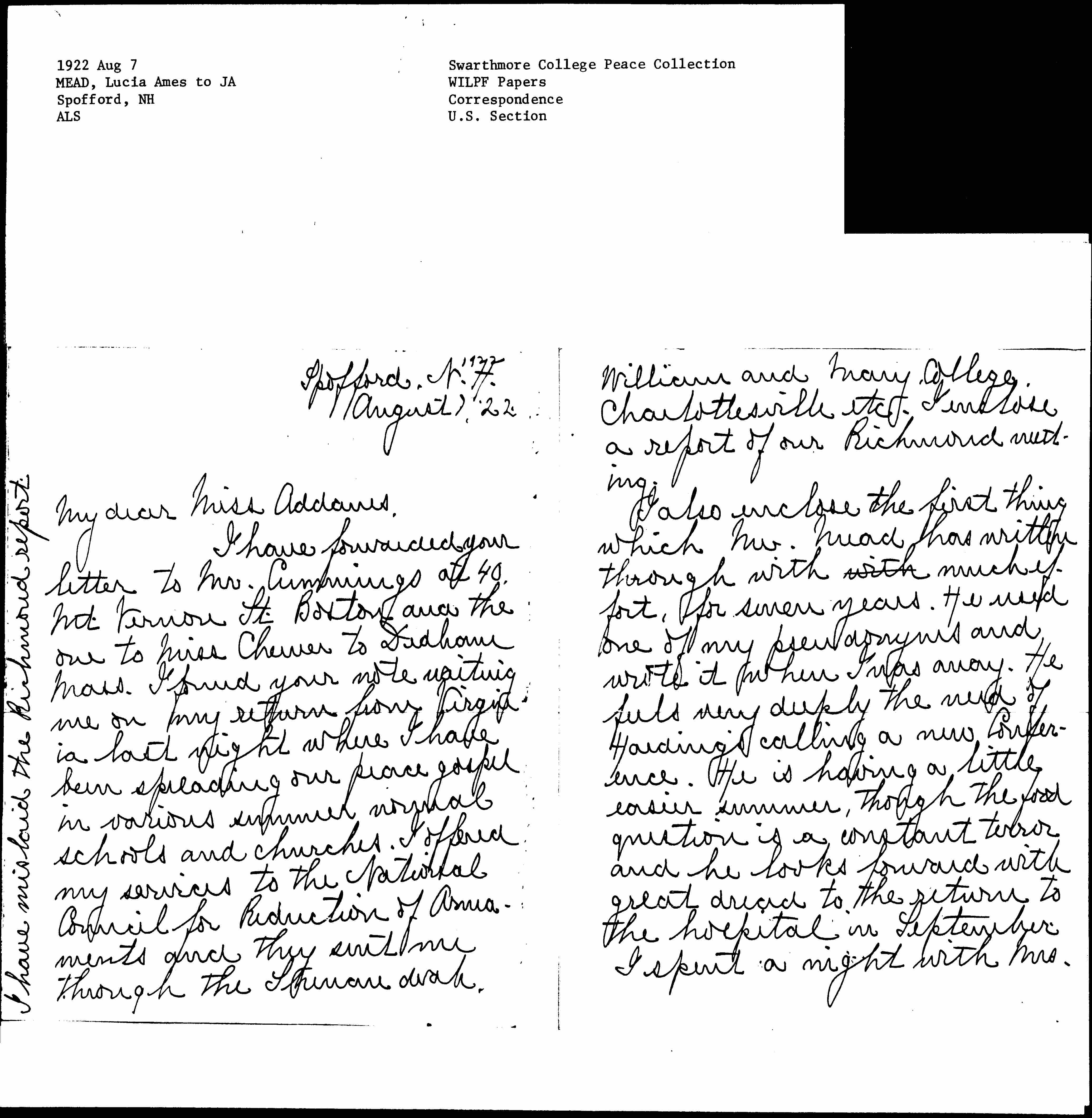 I have forwarded your letter to Mr. Cummings at 40 Mt. Vernon St. Boston and the one to Miss Cheever to Dedham Mass. I found your note waiting me on my return from Virginia last night where I have been spreading our peace gospel in various summer normal schools and churches. I offered my services to the National Council for Reduction of Armaments and they sent me through the Shenandoah, [page 2] William and Mary College, Charlottesville etc. I enclose a report of our Richmond meeting. [written up left margin of page 1] I have mislaid the Richmond report.