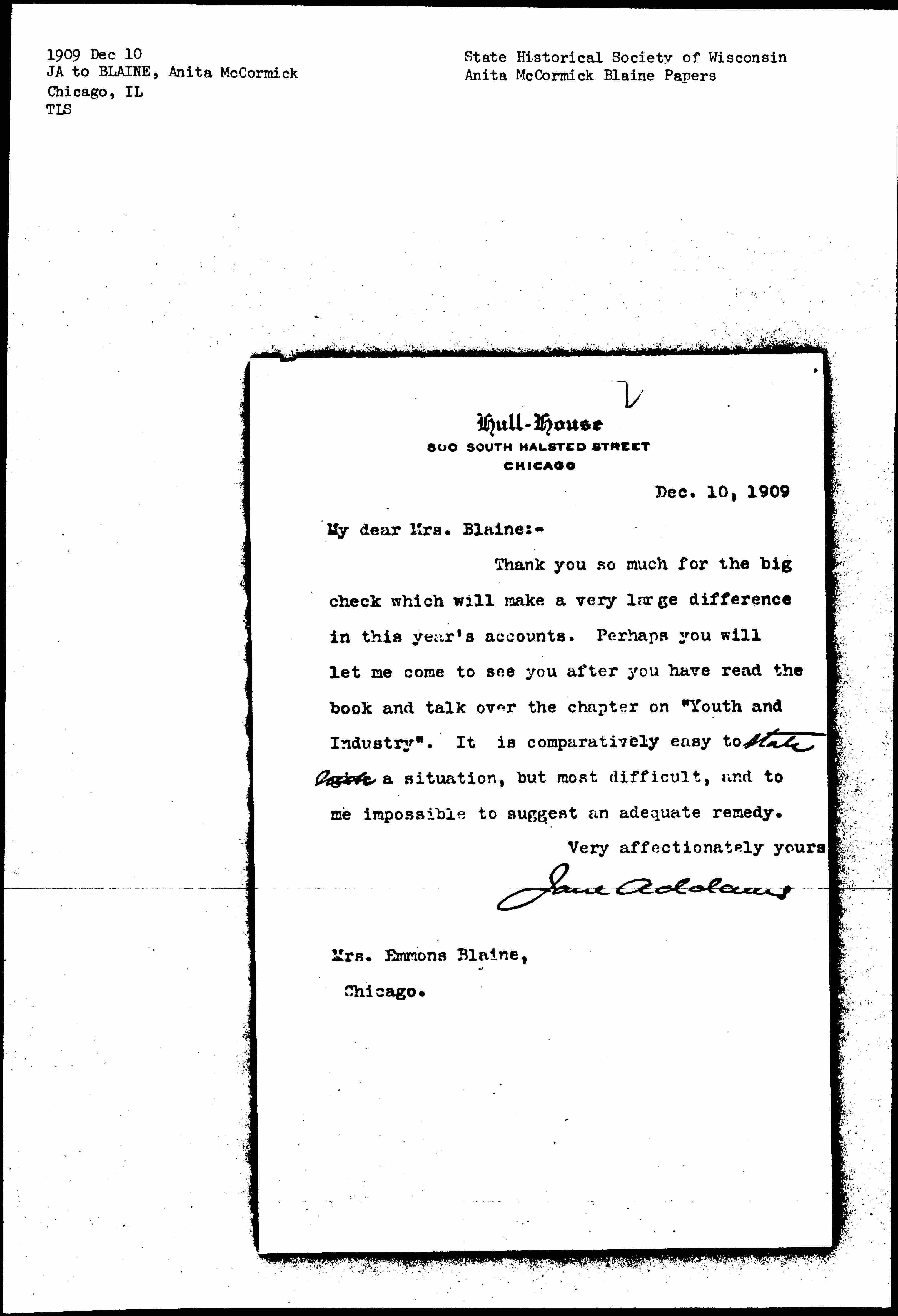 Thank you so much for the big check which will make a very large difference in this year's accounts. Perhaps you will let me come to see you after you have read the book and talk over the chapter "Youth and Industry". It is comparatively easy to ↑state↓ give a situation, but most difficult, and to me impossible to suggest an adequate remedy.