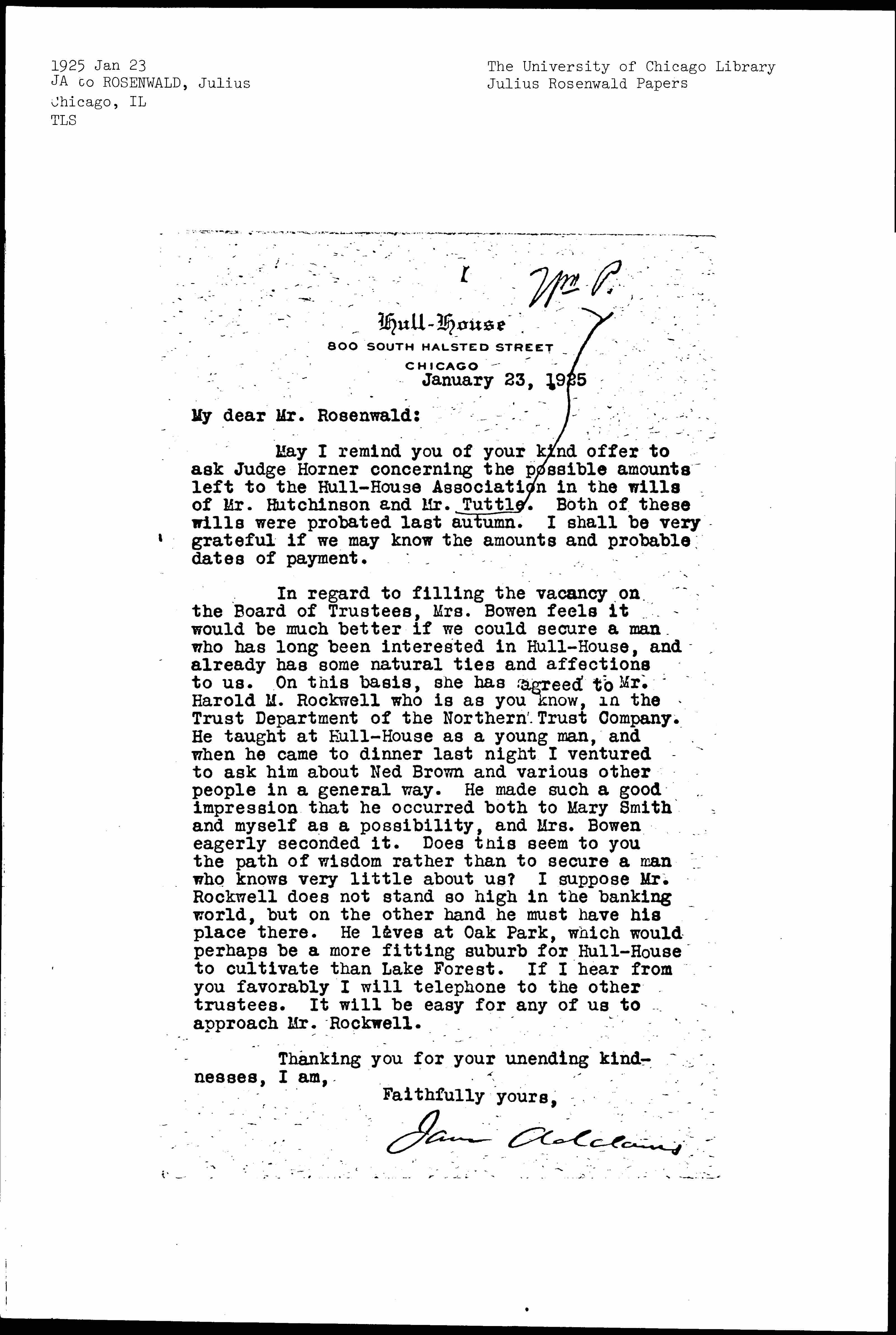 In regard to filling the vacancy on the Board of Trustees, Mrs. Bowen feels it would be much better if we could secure a man who has long been interested in Hull-House, and already has some natural ties and affections to us. On this basis, she has agreed to Mr. Harold [H.] Rockwell who is as you know, in the Trust Department of the Northern Trust Company. He taught at Hull-House as a young man, and when he came to dinner last night I ventured to ask him about Ned Brown and various other people in a general way. He made such a good impression that he occurred both to Mary Smith and myself as a possibility, and Mrs. Bowen eagerly seconded it. Does this seem to you the path of wisdom rather than to secure a man who knows very little about us? I suppose Mr. Rockwell does not stand so high in the banking world, but on the other hand he must have his place there. He lives at Oak Park, which would perhaps be a more fitting suburb for Hull-House to cultivate than Lake Forest. If I hear from you favorably I will telephone to the other trustees. It will be easy for any of us to approach Mr. Rockwell.