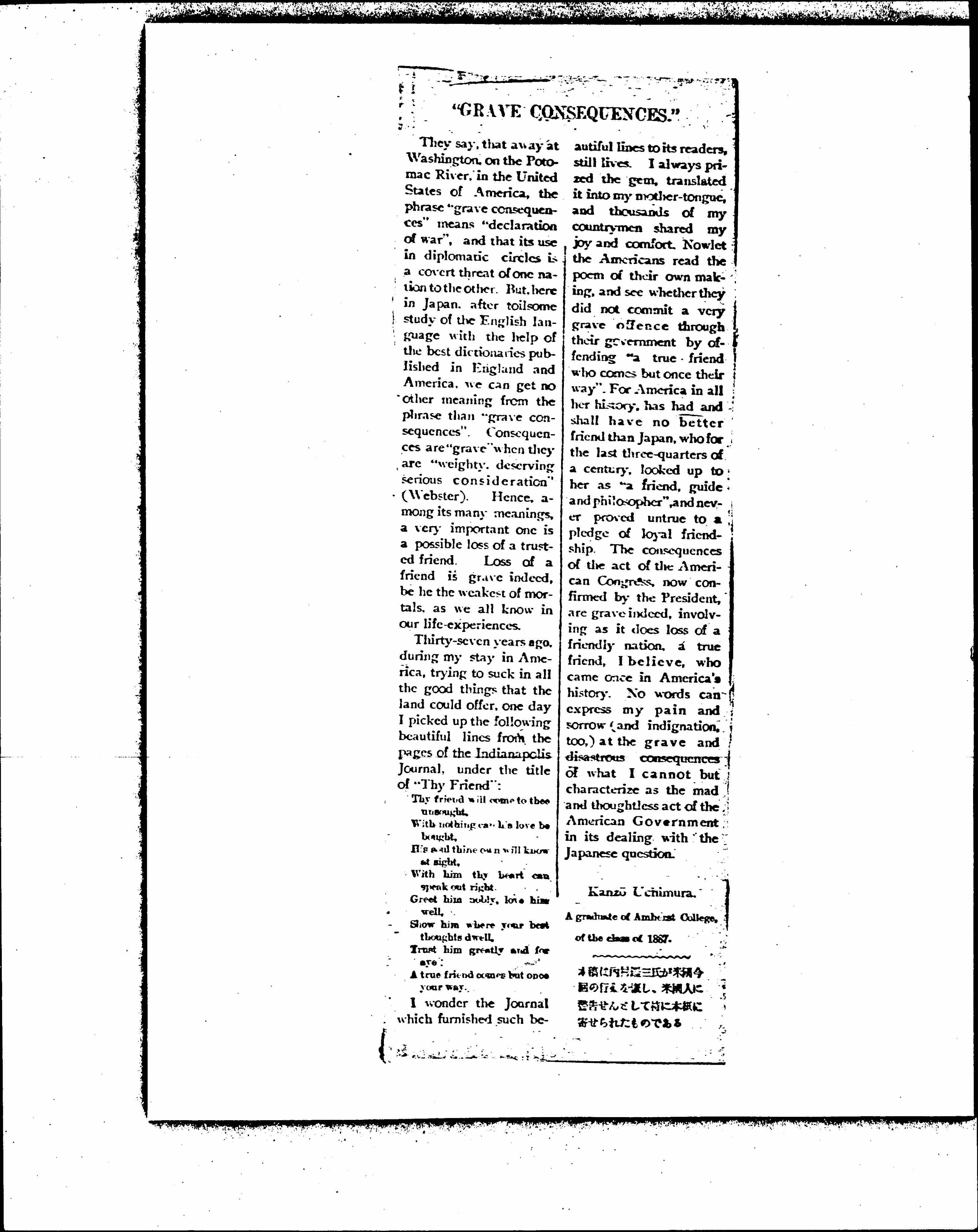 They say, that away at Washington, on the Potomac River, in the United States of America, the phrase "grave consequences" means "declaration of war," and that its use in diplomatic circles is a covert threat of one nation to the other. But, here in Japan, after toilsome study of the English language with the help of the best dictionaries published in England and America, we can get no other meaning from the phrase than "grave consequences." Consequences are "grave" when they are "weighty, deserving serious consideration" (Webster). Hence, among its many meanings, a very important one is a possible loss of a trusted friend. Loss of a friend is grave indeed, be he the weakest of mortals, as we all know in our life-experiences.