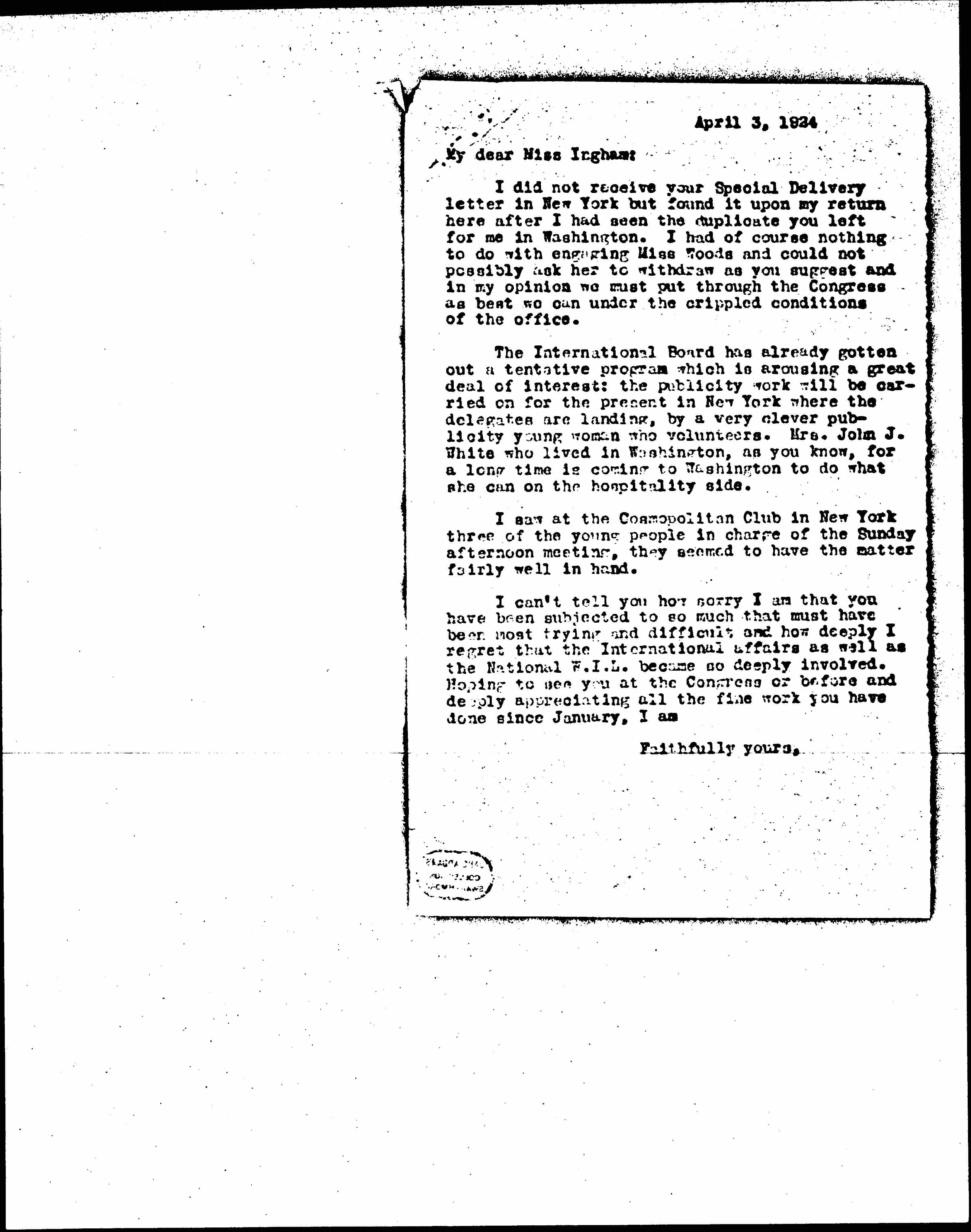 The International Board has already gotten out a tentative program which is arousing a great deal of interest: the publicity work will be carried on for the present in New York where the delegates are landing, by a very clever publicity young woman who volunteers. Mrs. John J. White who lived in Washington, as you know, for a long time is coming to Washington to do what she can on the hospitality side.