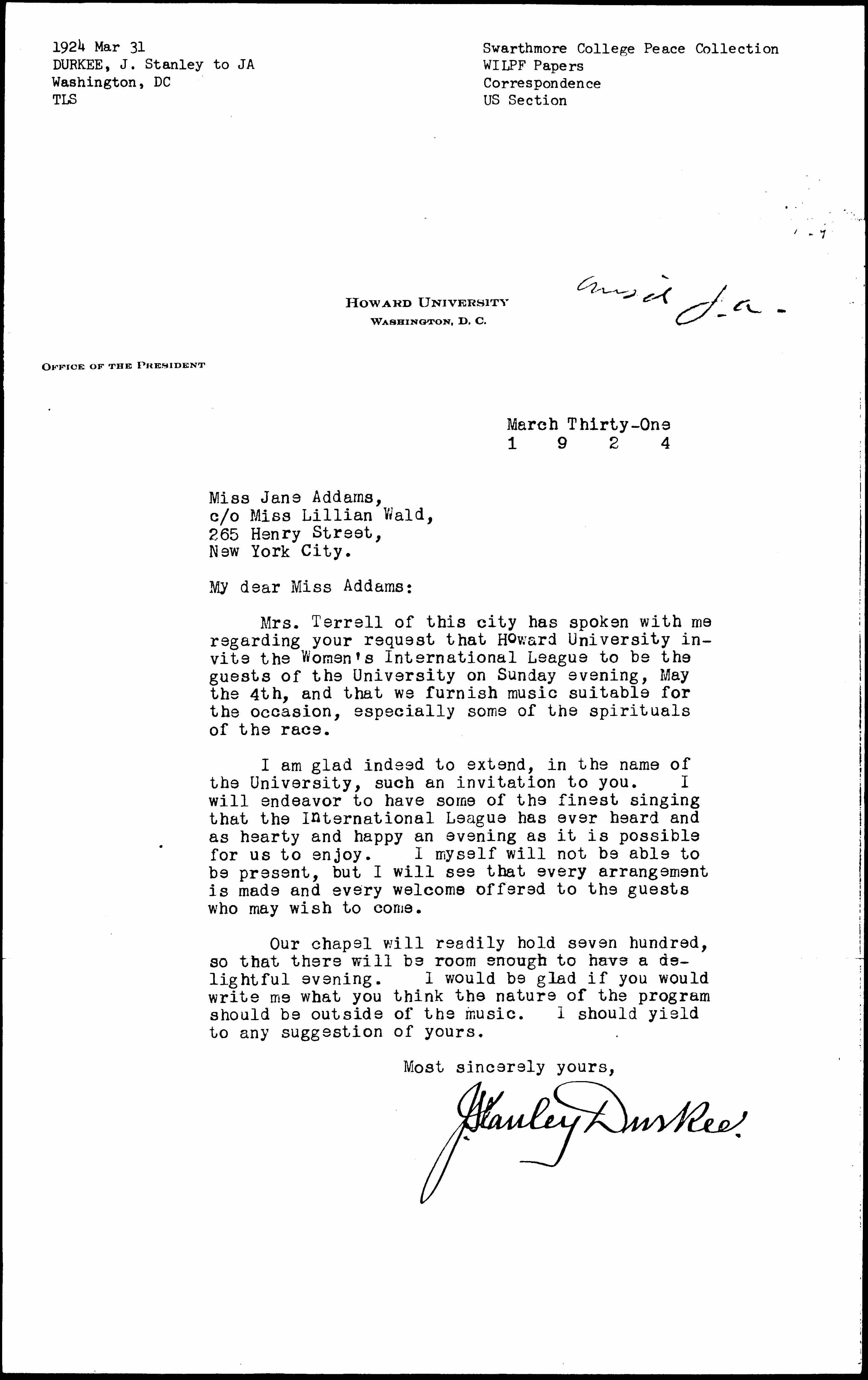 Mrs. Terrell of this city has spoken with me regarding your request that Howard University invite the Women's International League to be the guests of the University on Sunday evening, May the 4th, and that we furnish music suitable for the occasion, especially some of the spirituals of the race.