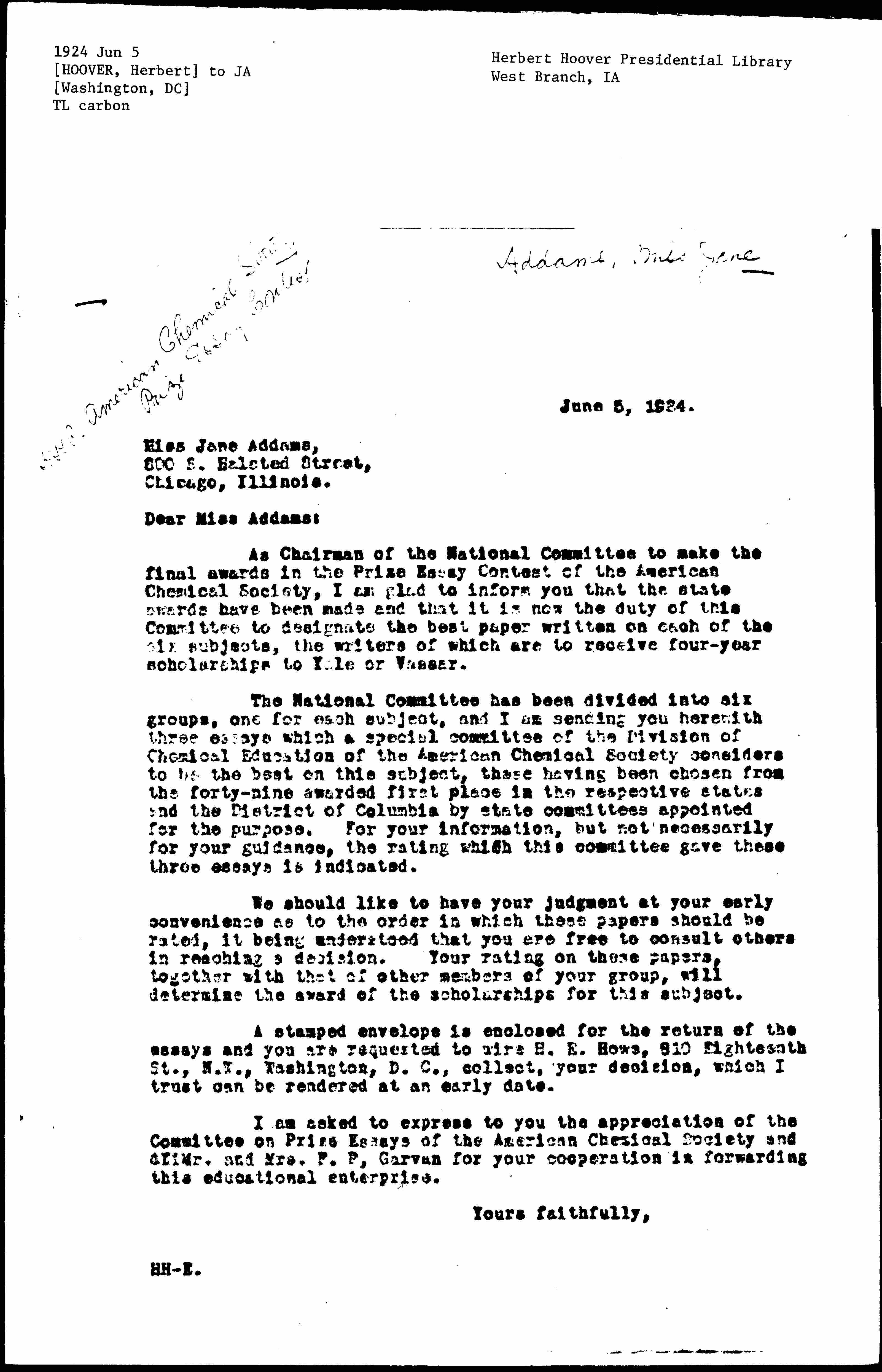 I am asked to express the appreciation of the Committee on Prize Essays of the American Chemical Society and [of] Mr. and Mrs. F. P. Garvan for your cooperation in forwarding this educational enterprise.