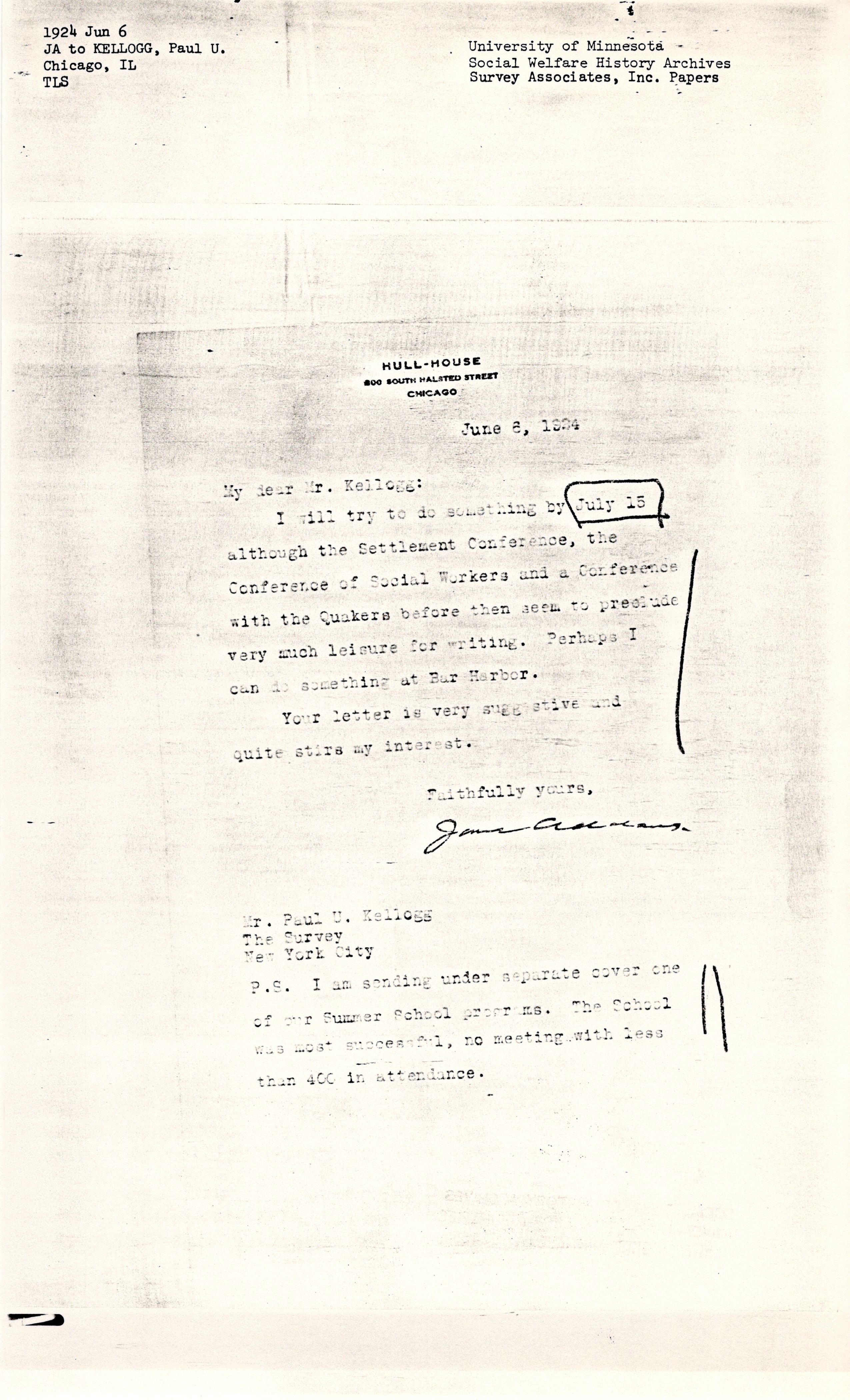 I will try to do something by July 15 although the Settlement Conference, the Conference of Social Workers and a Conference with the Quakers before then seem to preclude very much leisure for writing. Perhaps I can do something at Bar Harbor.