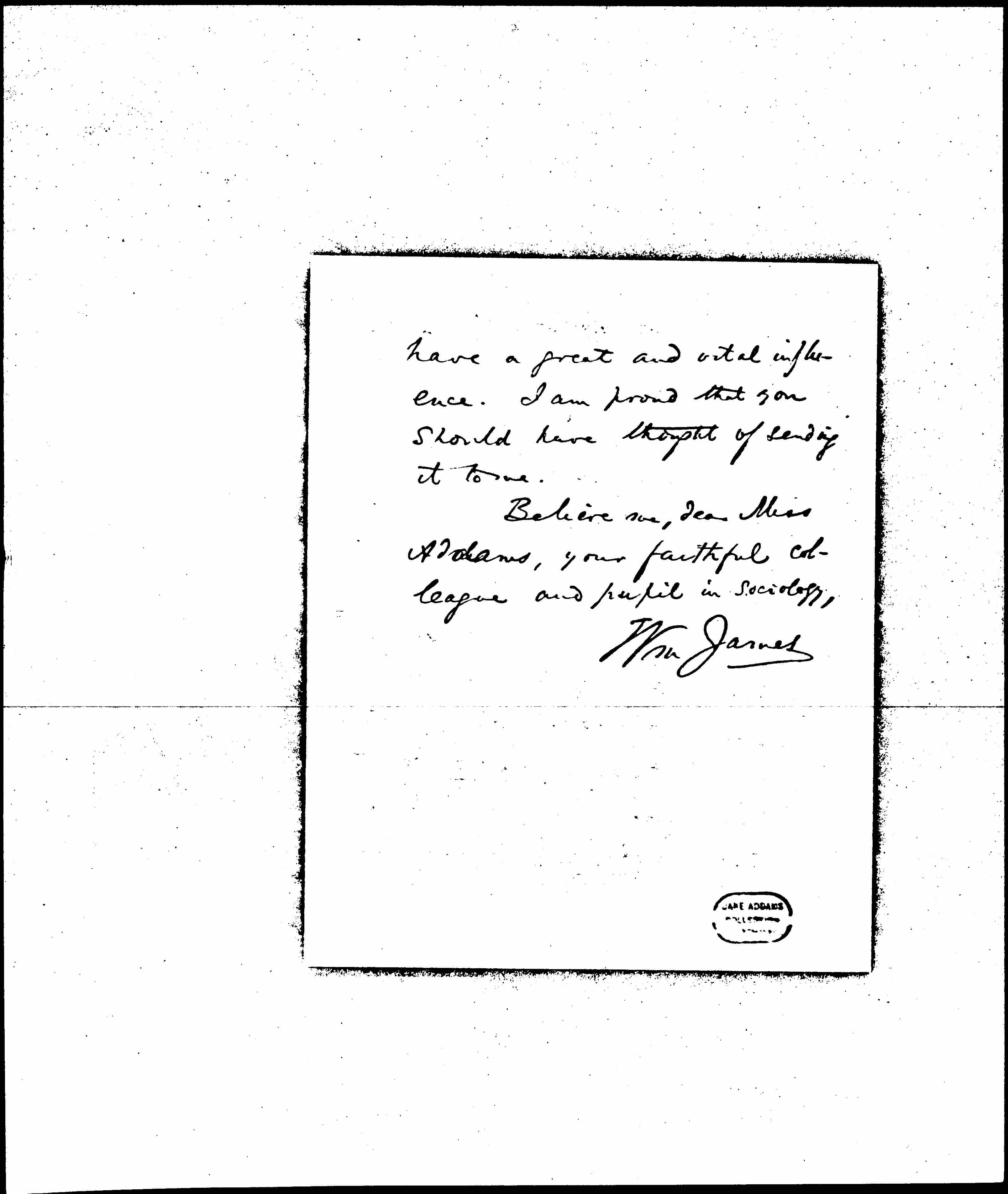 Believe me dear Miss Addams, your faithful colleague and pupil in sociology,