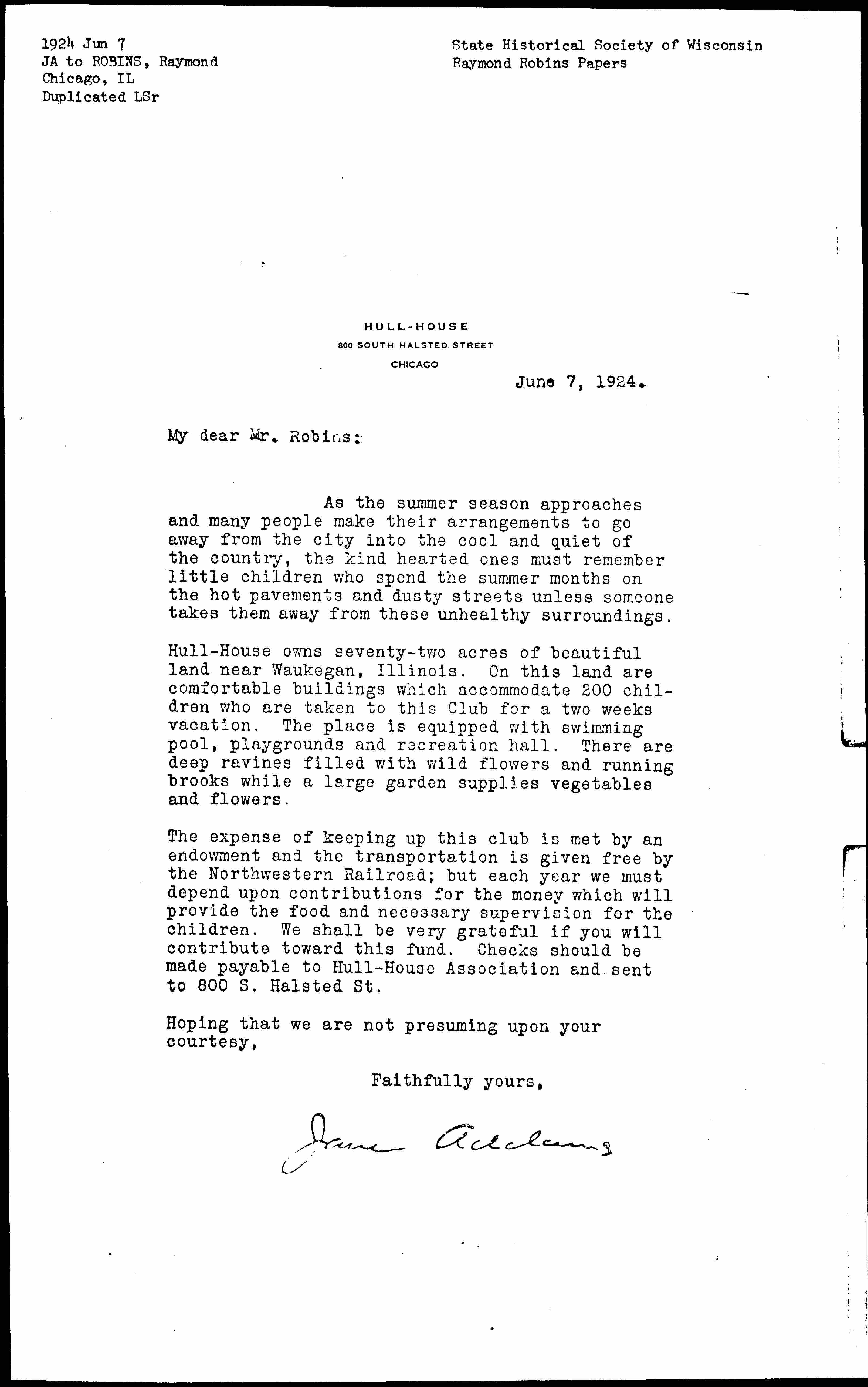 The expense of keeping up this club is met by an endowment and the transportation is given free by the Northwestern Railroad; but each year we must depend upon contributions for the money which will provide the food and necessary supervision for the children. We shall be very grateful if you will contribute toward this fund. Checks should be made payable to Hull-House Association and sent to 800 S. Halsted St.