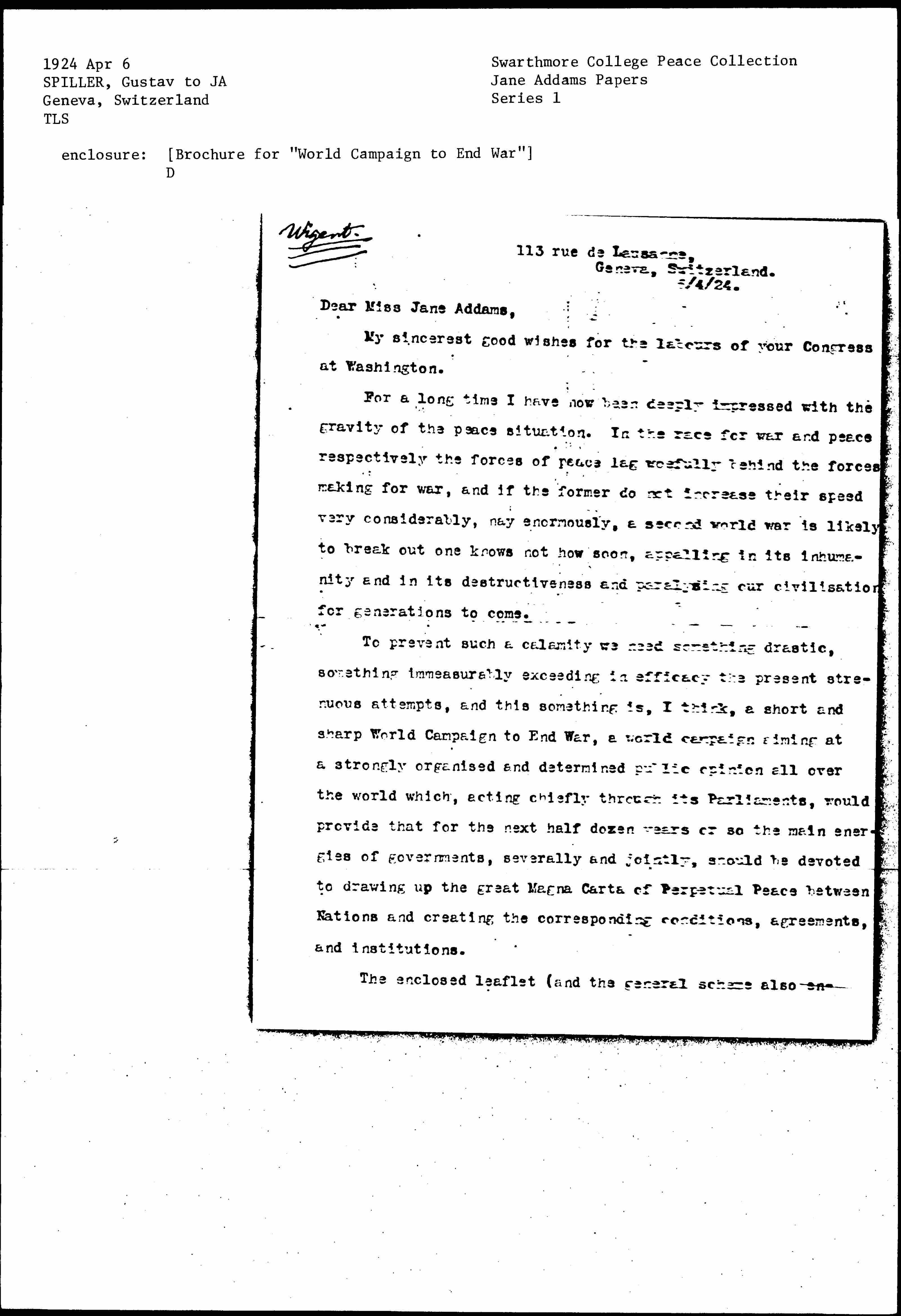 The enclosed leaflet (and general scheme also enclosed [page 2] will tell you how I conceive the plan. Nearly everything depends, of course, whether it can be [realized]; but I worked out the plan as an international [organizer] (as the [organizer] of the First International Moral Education Congress and of the First Universal Races Congress, at each of which all camps were represented as well as over twenty governments), and it is as an international [organizer] that I recommend it. All that experience, keenness, and broadmindedness can contribute, will be at the service of the World Campaign.