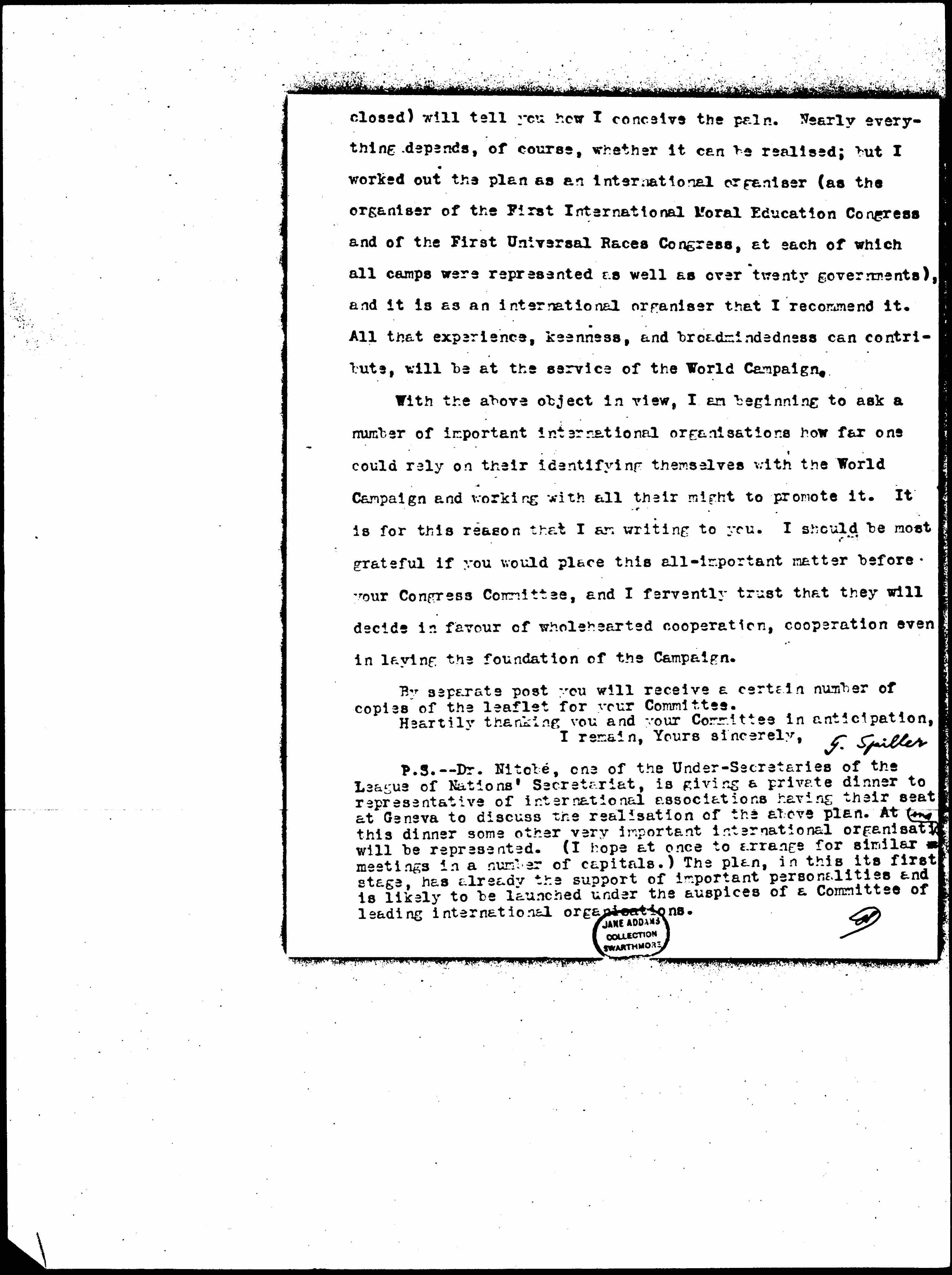 P.S. -- Dr. Nitobé, one of the Under-Secretaries of the League of Nations' Secretariat, is giving a private dinner to representative of international associations having their seat at Geneva to discuss the [realization] of the above plan. At this dinner some other very important international [organizations] will be represented. (I hope at once to arrange for similar meetings in a number of capitals.) The plan, in this its first stage, has already the support of important personalities and is likely to be launched under the auspices of a Committee of leading international [organizations].