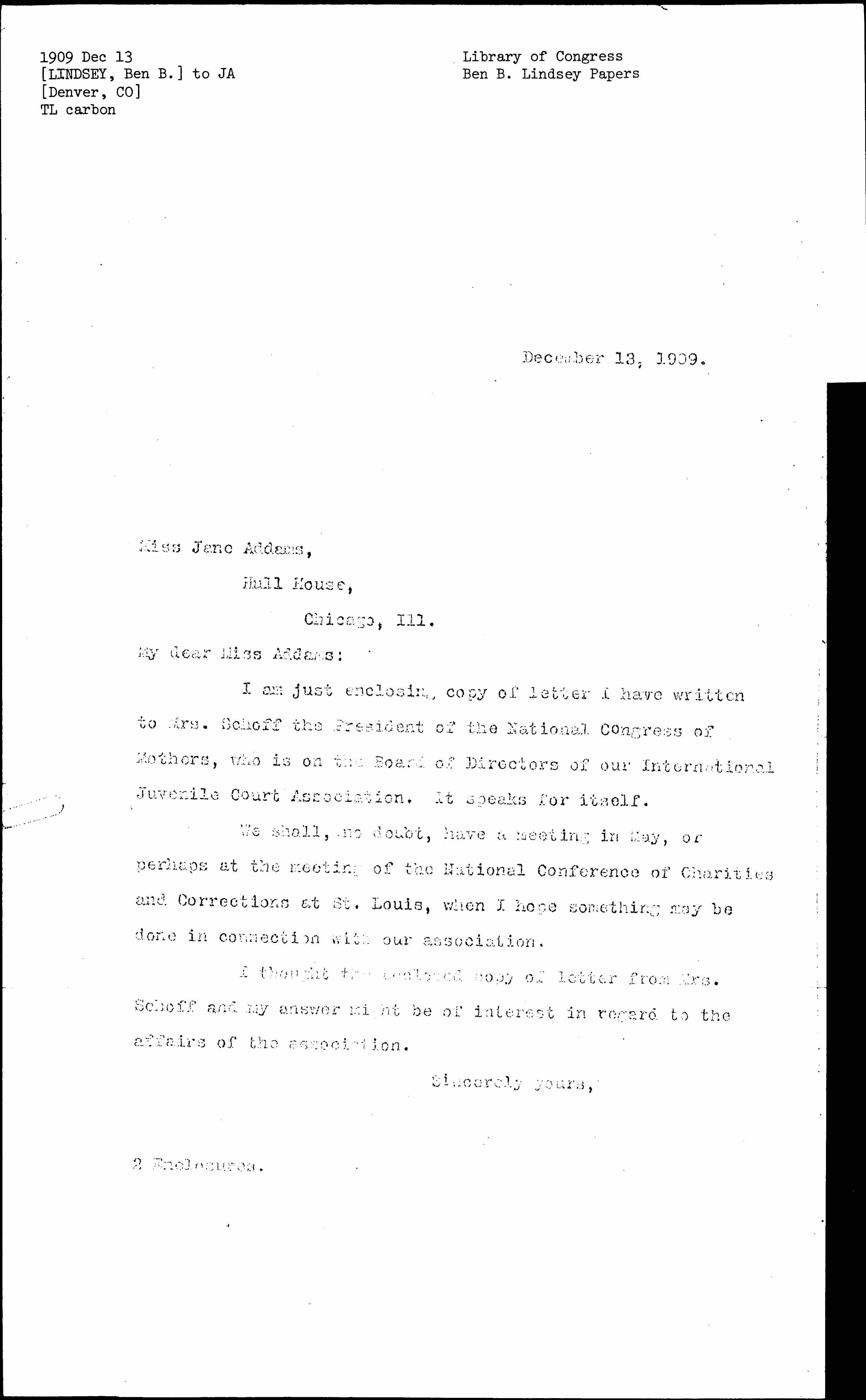 I am just enclosing copy of letter I have written to Mrs. Schoff the President of the National Congress of Mothers, who is on the Board of Directors of our International Juvenile Court Association. It speaks for itself.