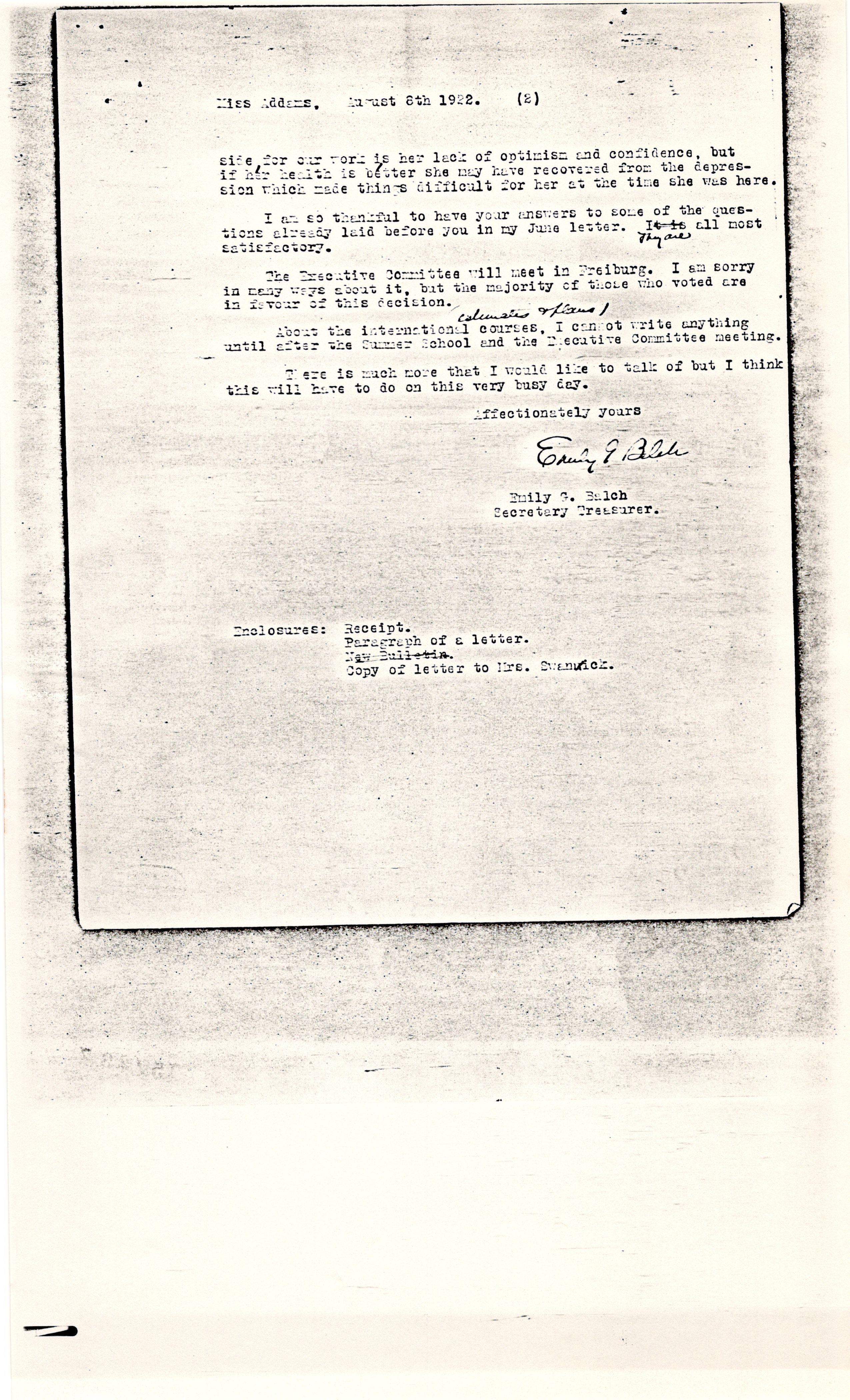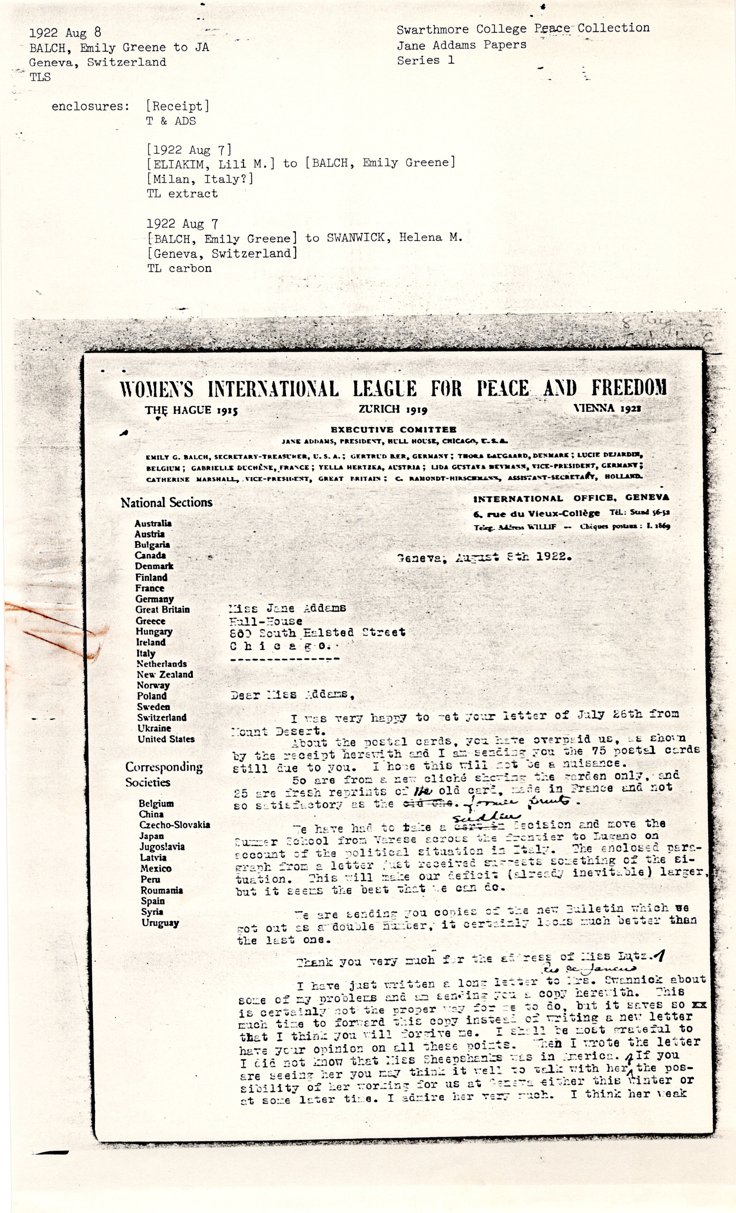 I have just written a long letter to Mrs. [Swanwick] about some of my problems and am sending you a copy herewith. This is certainly not the proper way for me to do, but it saves so much time to forward this copy instead of writing a new letter that I think you will forgive me. I shall be most grateful to have your opinion on all these points. When I wrote the letter I did not know that Miss Sheepshanks was in America. If you are seeing her you may think it well to talk with her ↑of↓ the possibility of her working for us at Geneva either this winter or at some later time. I admire her very much. I think her weak [page 2] side, for our work is her lack of optimism and confidence, but if her health is better she may have recovered from the depression which made things difficult for her at the time she was here.