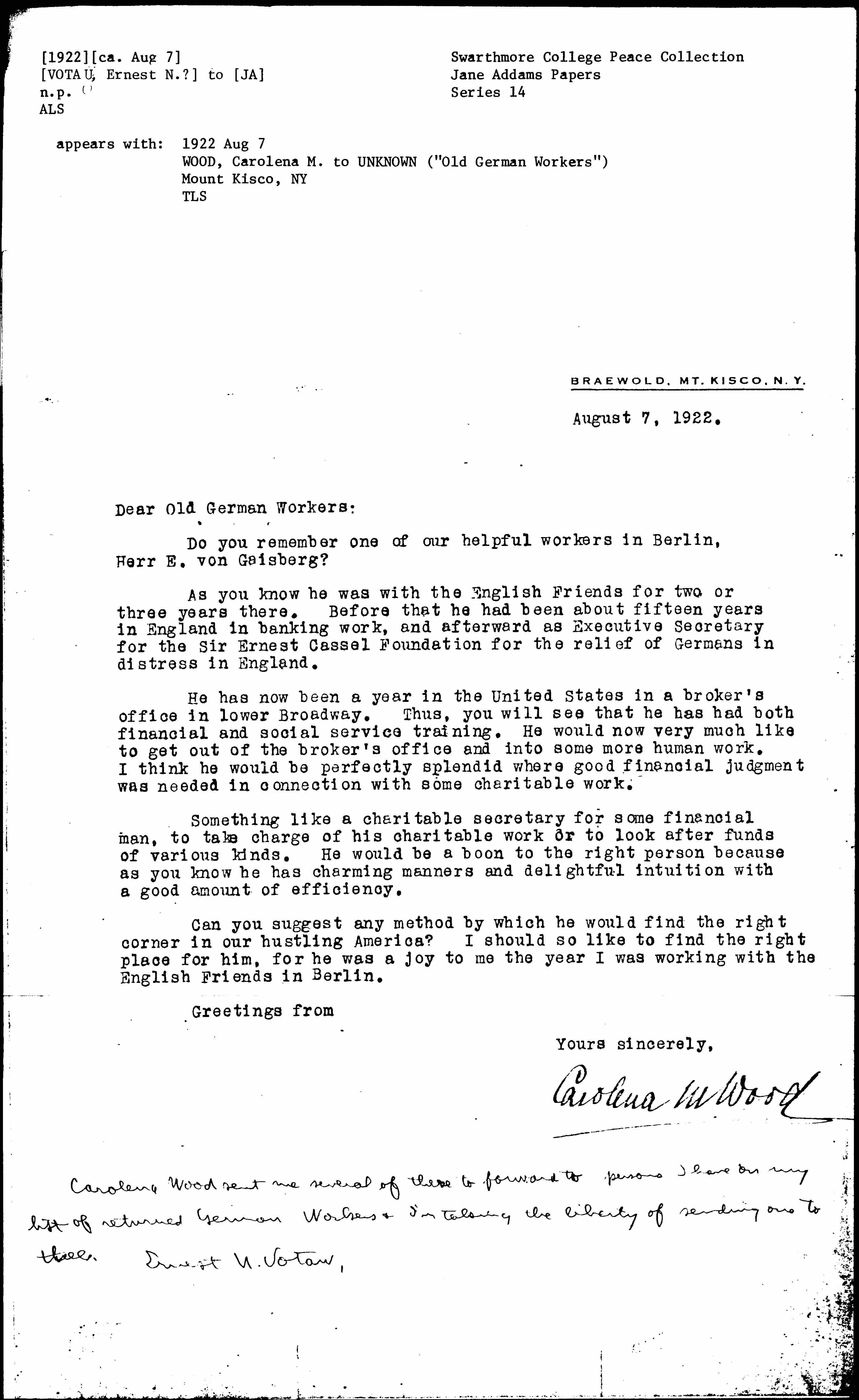 Can you suggest any method by which he would find the right corner in our hustling America? I should so like to find the right place for him, for he was a joy to me the year I was working with the English Friends in Berlin.