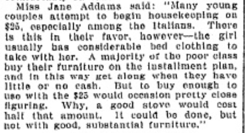 Miss Jane Addams said: "Many young couples attempt to begin housekeeping on $25, especially among the Italians. There is this in their favor, however -- the girl usually has considerable bed clothing to take with her. A majority of the poor class buy their furniture on the installment plan, and in this way get along when they have little or no cash. But to buy enough to use with the $25 would occasion pretty close figuring. Why, a good stove would cost half that amount, it could be done, but not with good, substantial furniture."