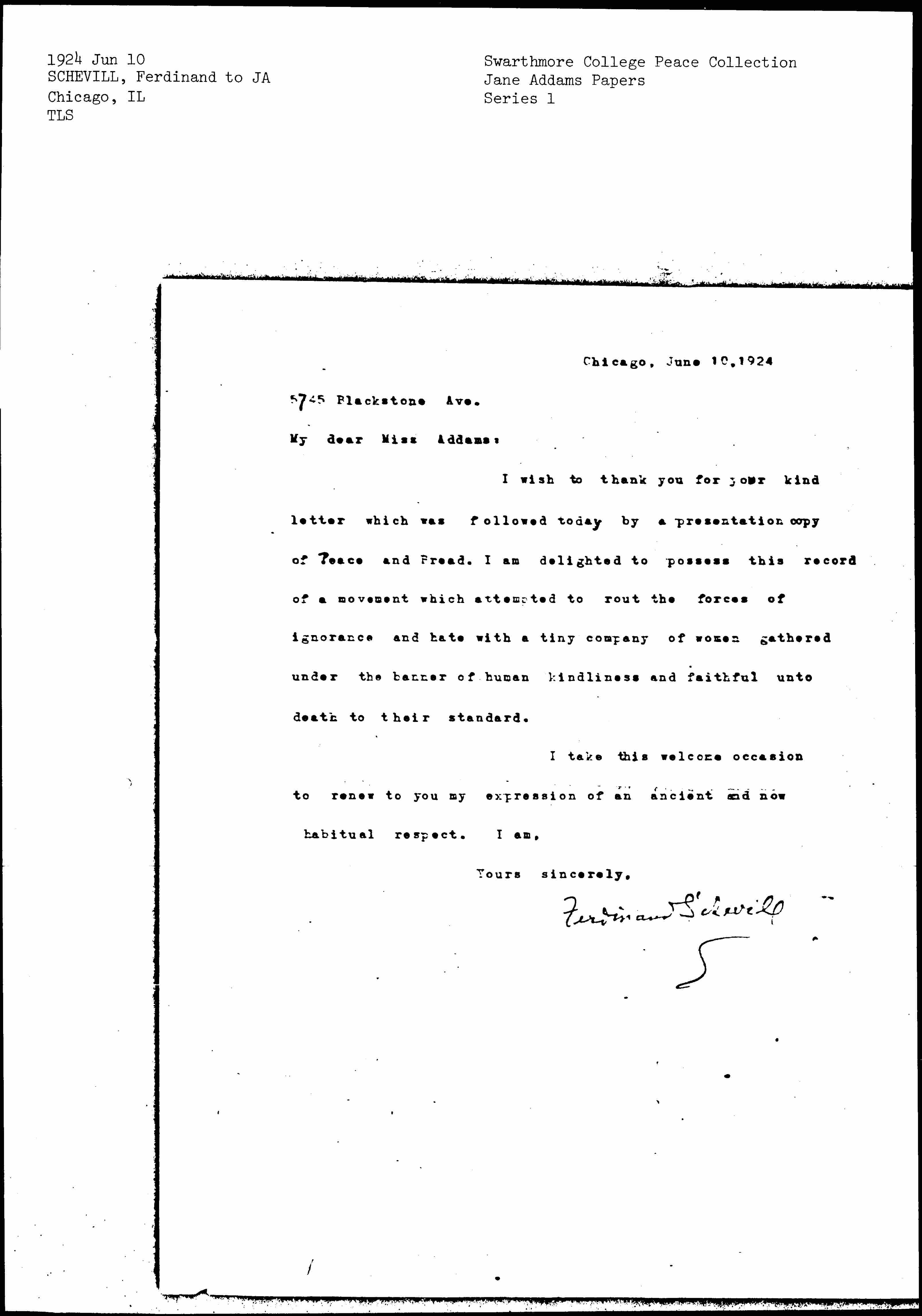 I wish to thank you for your kind letter which was followed today by a presentation copy of Peace and Bread. I am delighted to possess this record of a movement which attempted to rout the forces of ignorance and hate with a tiny company of women gathered under the banner of human kindliness and faithful unto death to their standard.
