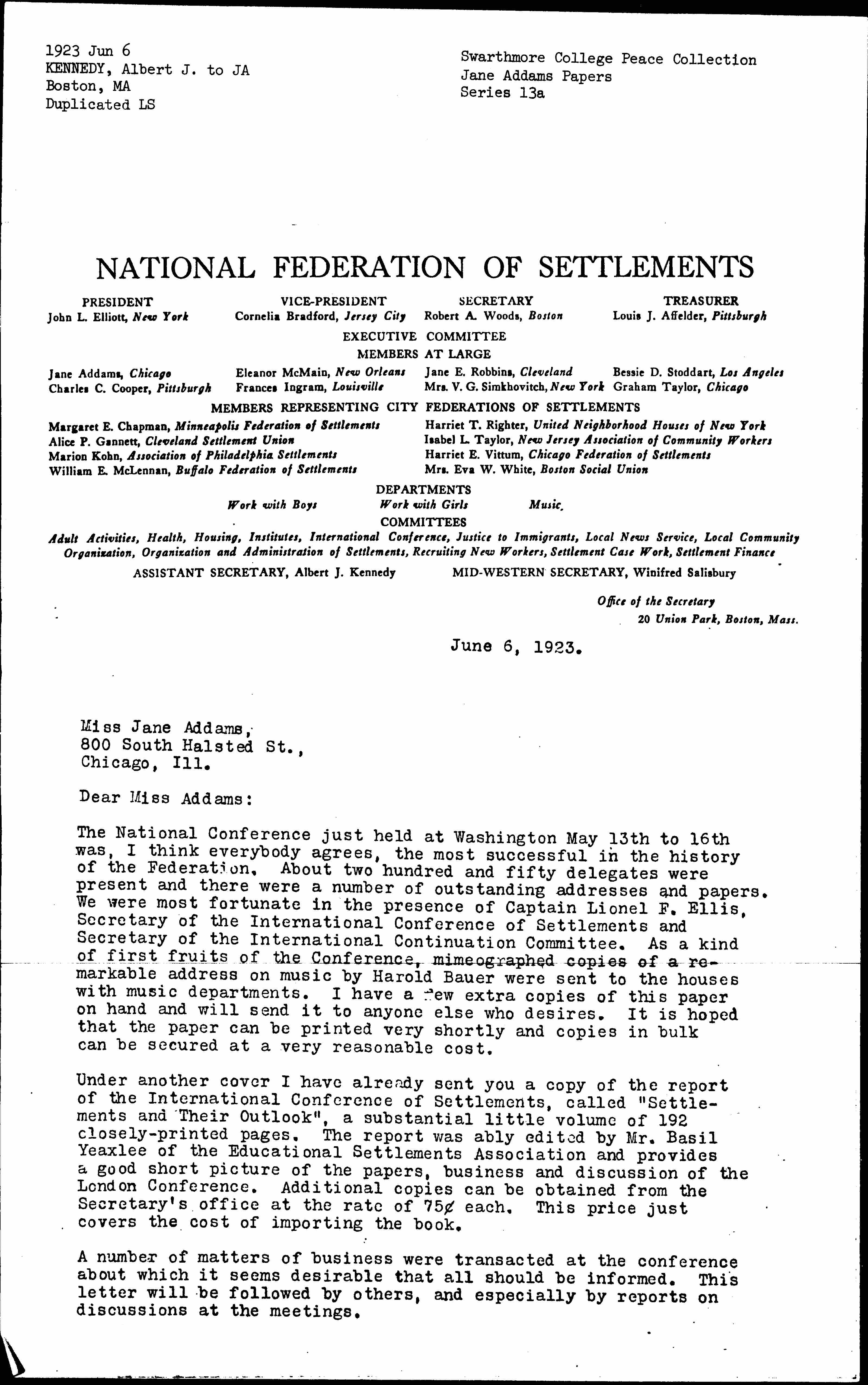 The National Conference just held at Washington May 13th to 16th was, I think everybody agrees, the most successful in the history of the Federation. About two hundred and fifty delegates were present and there were a number of outstanding addresses and papers. We were most fortunate in the presence of Captain Lionel F. Ellis, Secretary of the International Conference of Settlements and Secretary of the International Continuation Committee. As a kind of first fruits of the Conference, mimeographed copies of a remarkable address on music by Harold Bauer were sent to the houses with music departments. I have a few extra copies of this paper on hand and will send it to anyone else who desires. It is hoped that the paper can be printed very shortly and copies in bulk can be secured at a very reasonable cost.