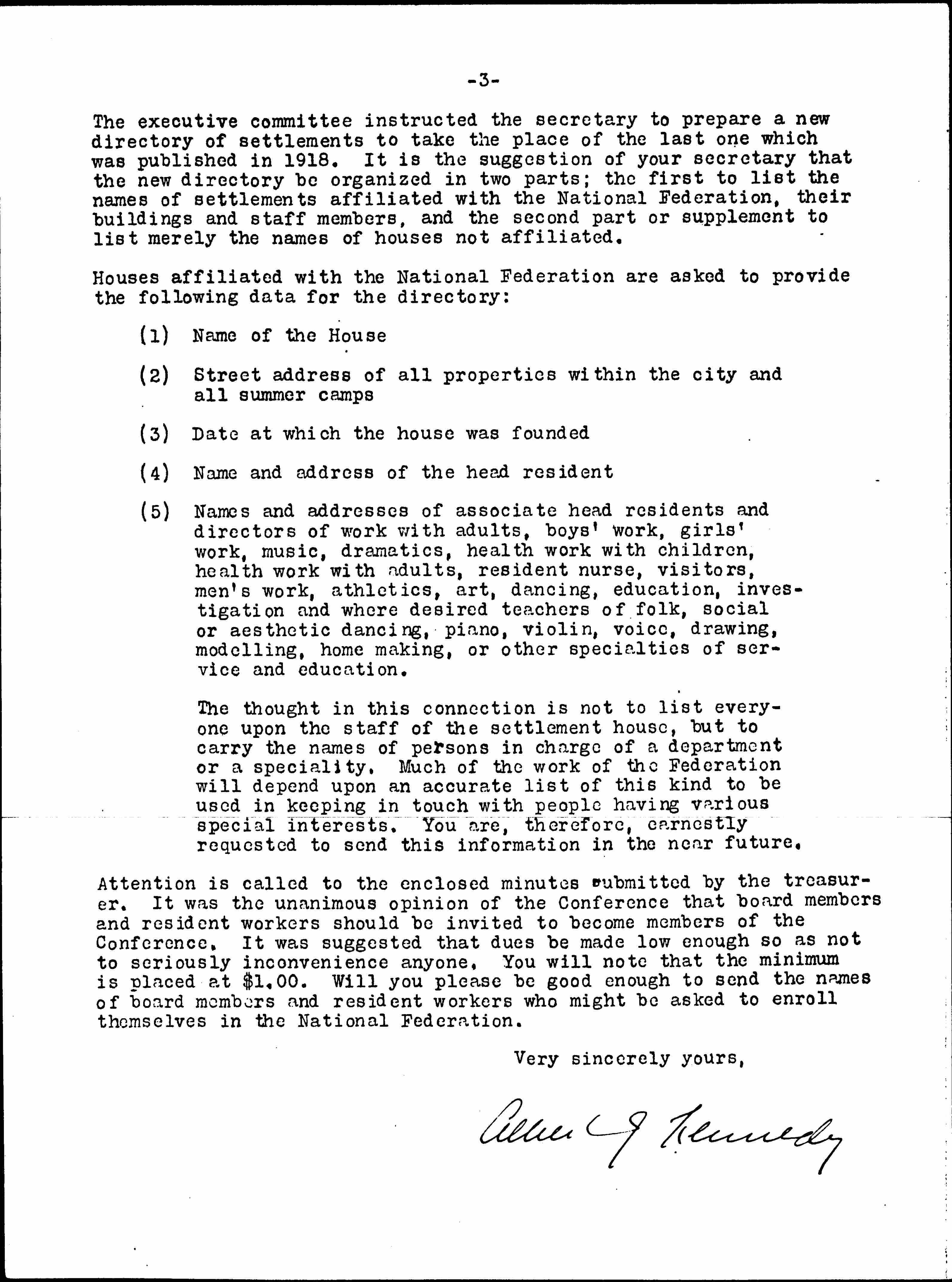 Attention is called to the enclosed minutes submitted by the treasurer. It was the unanimous opinion of the Conference that board members and resident workers should be invited to become members of the Conference. It was suggested that dues be made low enough so as not to seriously inconvenience anyone. You will note that the minimum is placed at $1.00. Will you please be good enough to send the names of board members and resident workers who might be asked to enroll themselves in the National Federation.