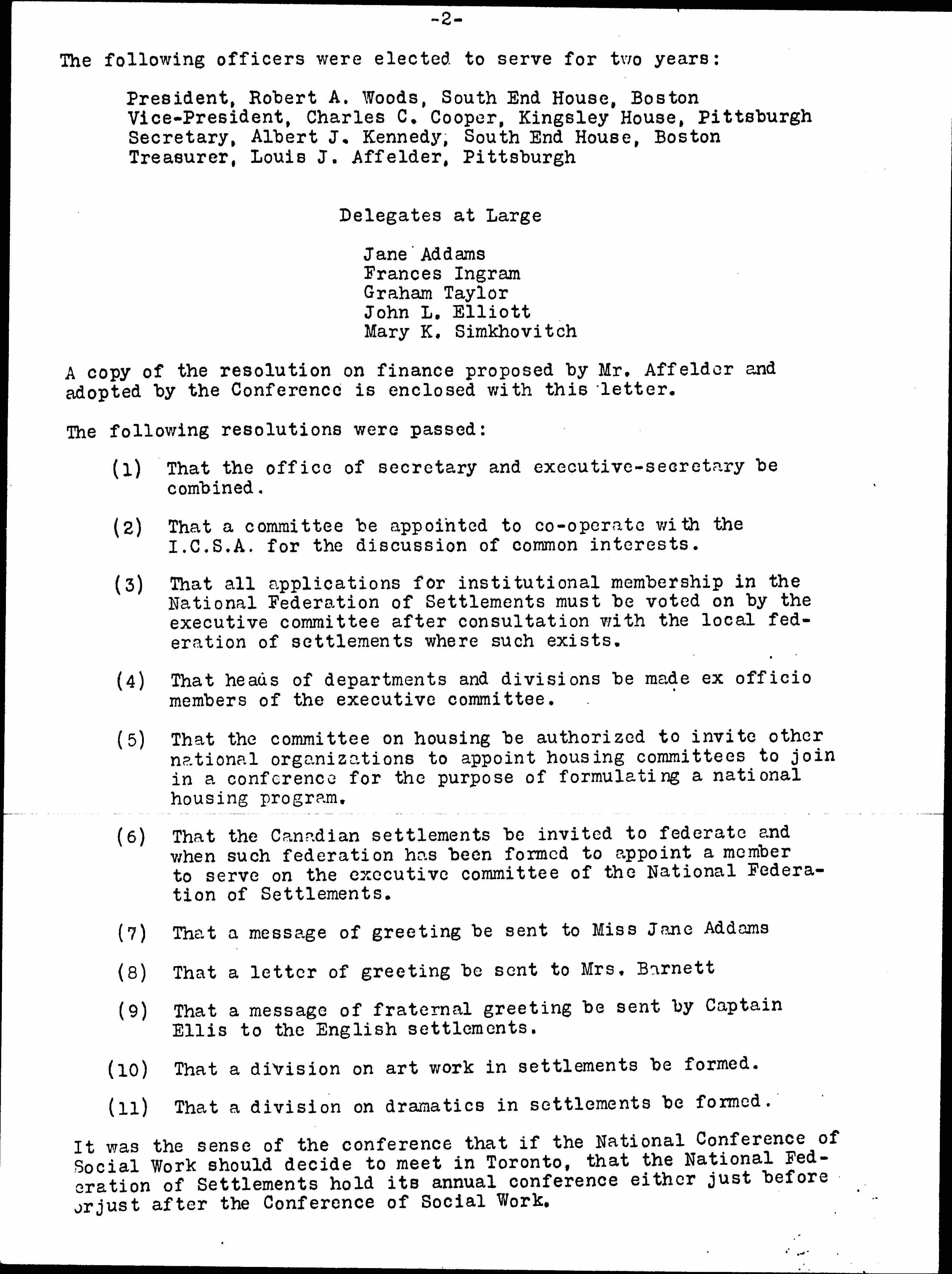 It was the sense of the conference that if the National Conference of Social Work should decide to meet in Toronto, that the National Federation of Settlements hold its annual conference either just before or just after the Conference of Social Work. [page 3]