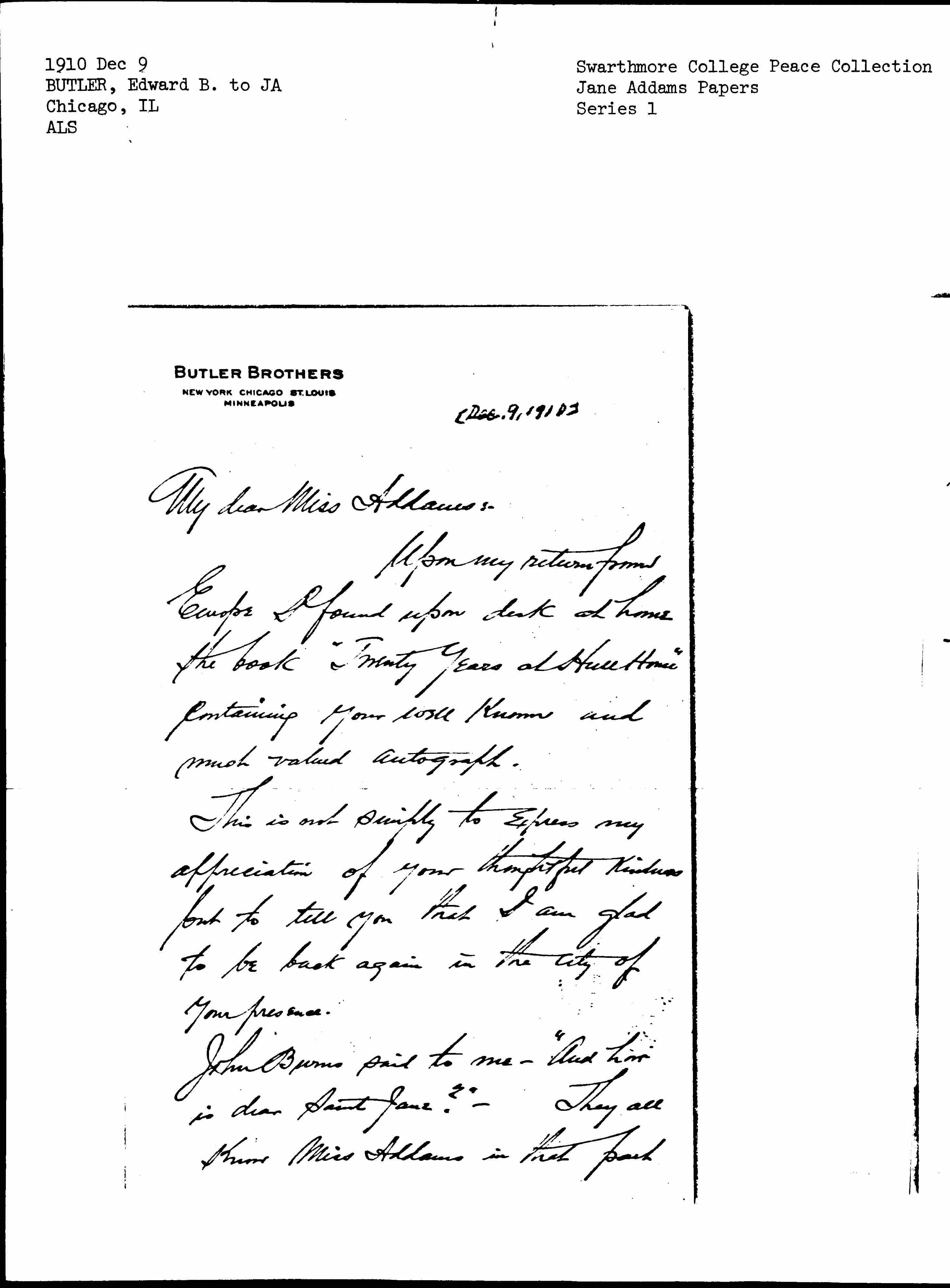 John Burns said to me -- "And how is dear Saint Jane?" -- They all know Miss Addams in that part [page 2] of the world just as they do in this.