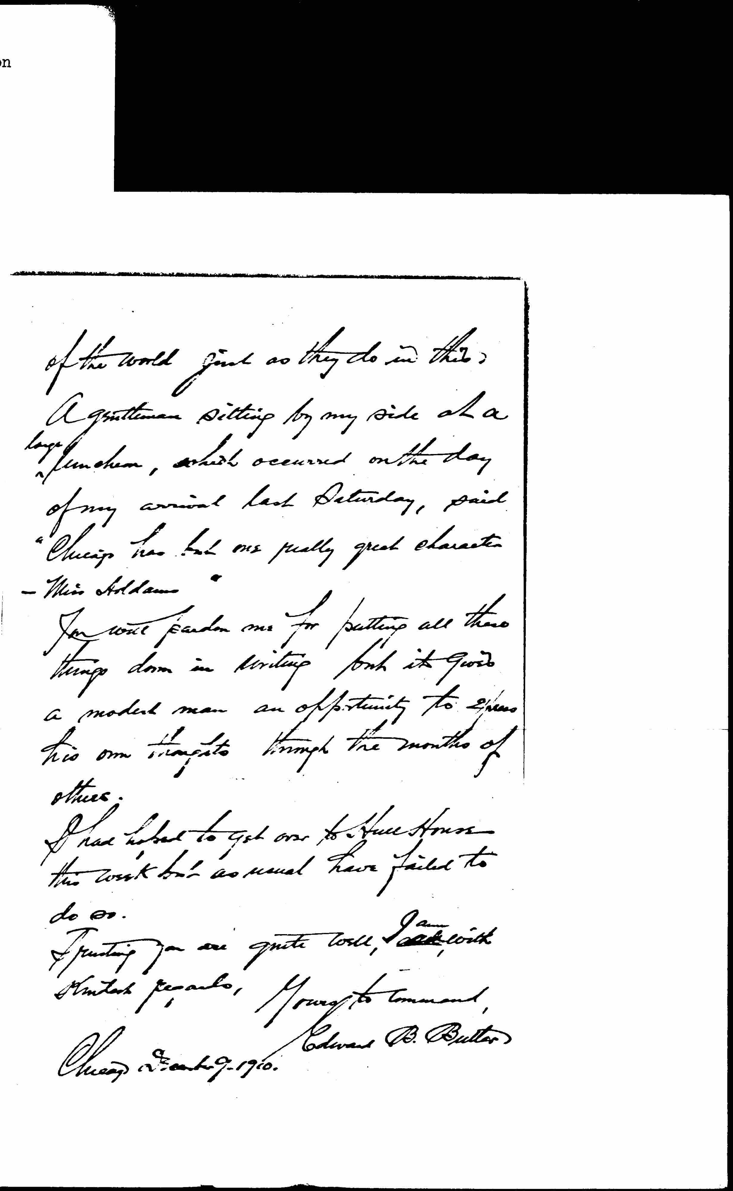 A gentleman sitting by my side at a <large> luncheon, which occurred on the day of my arrival last Saturday, said "Chicago has but one really great character -- Miss Addams."