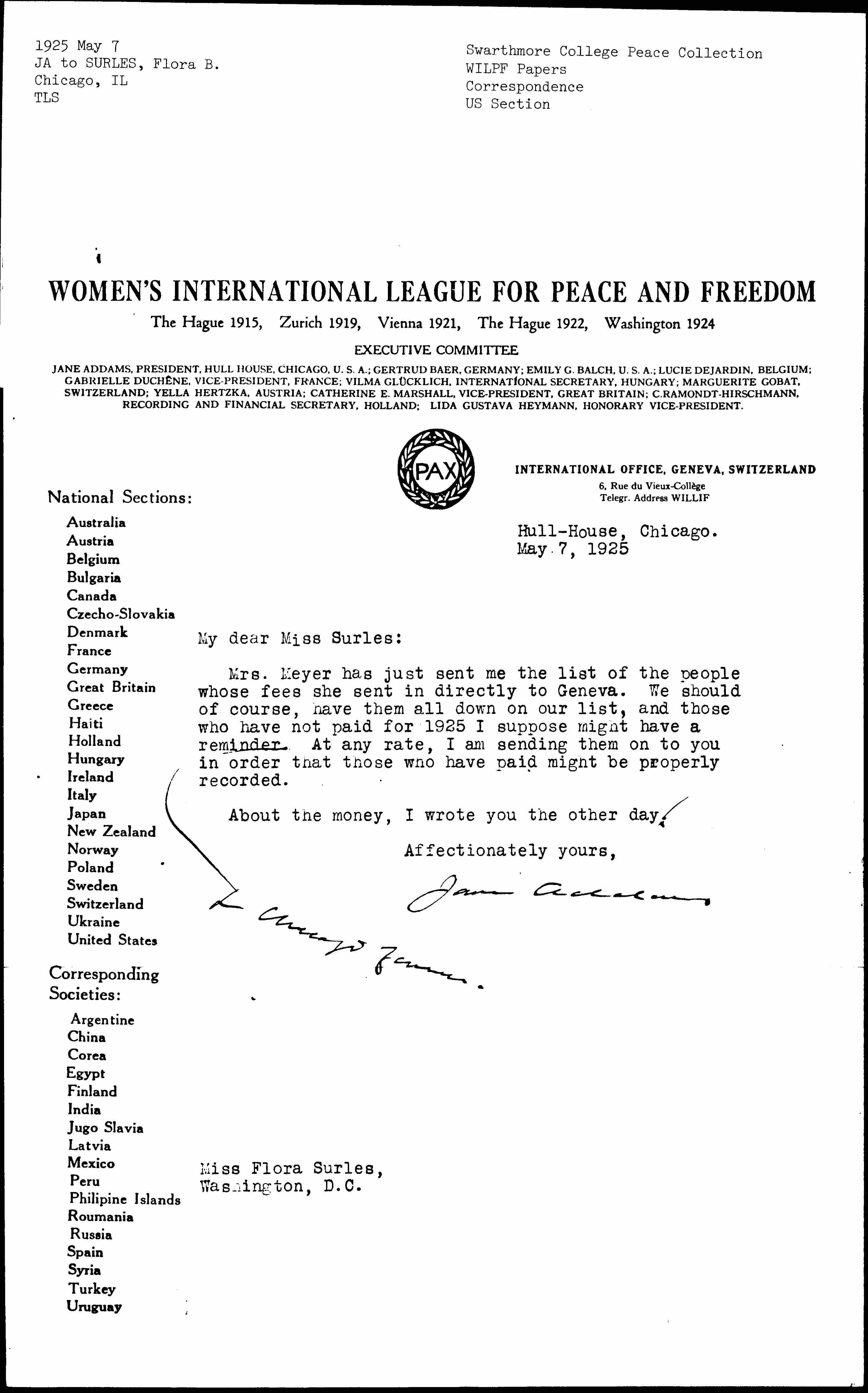 Mrs. Meyer has just sent me the list of the people whose fees she sent in directly to Geneva. We should of course, have them all down on our list, and those who have not paid for 1925 I suppose might have a reminder ↑from Chicago of course.↓ At any rate, I am sending them on to you in order that those who have paid might be properly recorded.