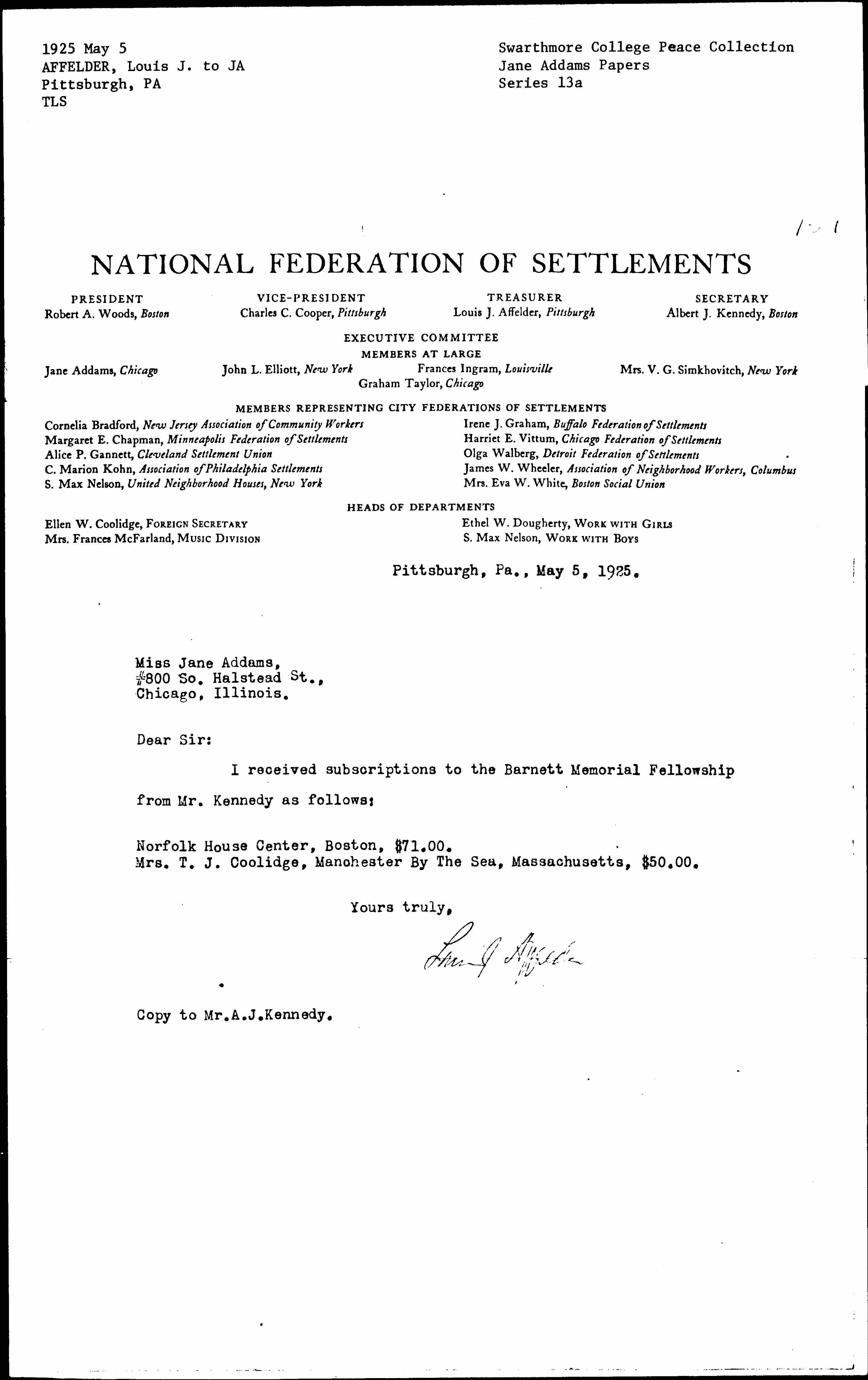 I received subscriptions to the Barnett Memorial Fellowship from Mr. Kennedy as follows: