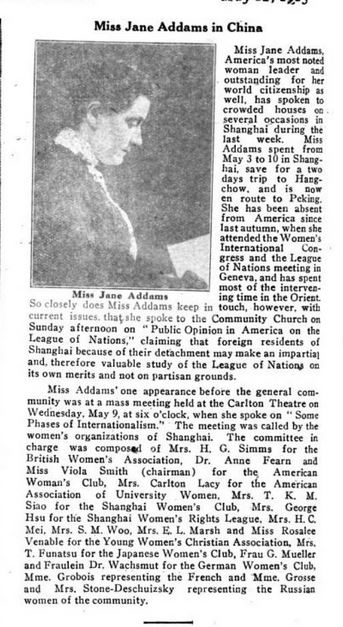 Miss Jane Addams, America's most noted woman leader and outstanding for her world citizenship as well, has spoken to crowded houses on several occasions in Shanghai during the last week. Miss Addams spent from May 3 to 10 in Shanghai, save for a two days trip to Hangchow, and is now en route to Peking. She has been absent from America since last autumn, when she attended the Women's International Congress and the League of Nations meeting in Geneva, and has spent most of the intervening time in the Orient. So closely does Miss Addams keep in touch, however, with current issues, that she spoke to the Community Church on Sunday afternoon on "Public Opinion in America on the League of Nations," claiming that foreign residents of Shanghai because of their detachment may make an impartial and therefore valuable study of the League of Nations on its own merits and not on partisan grounds.
