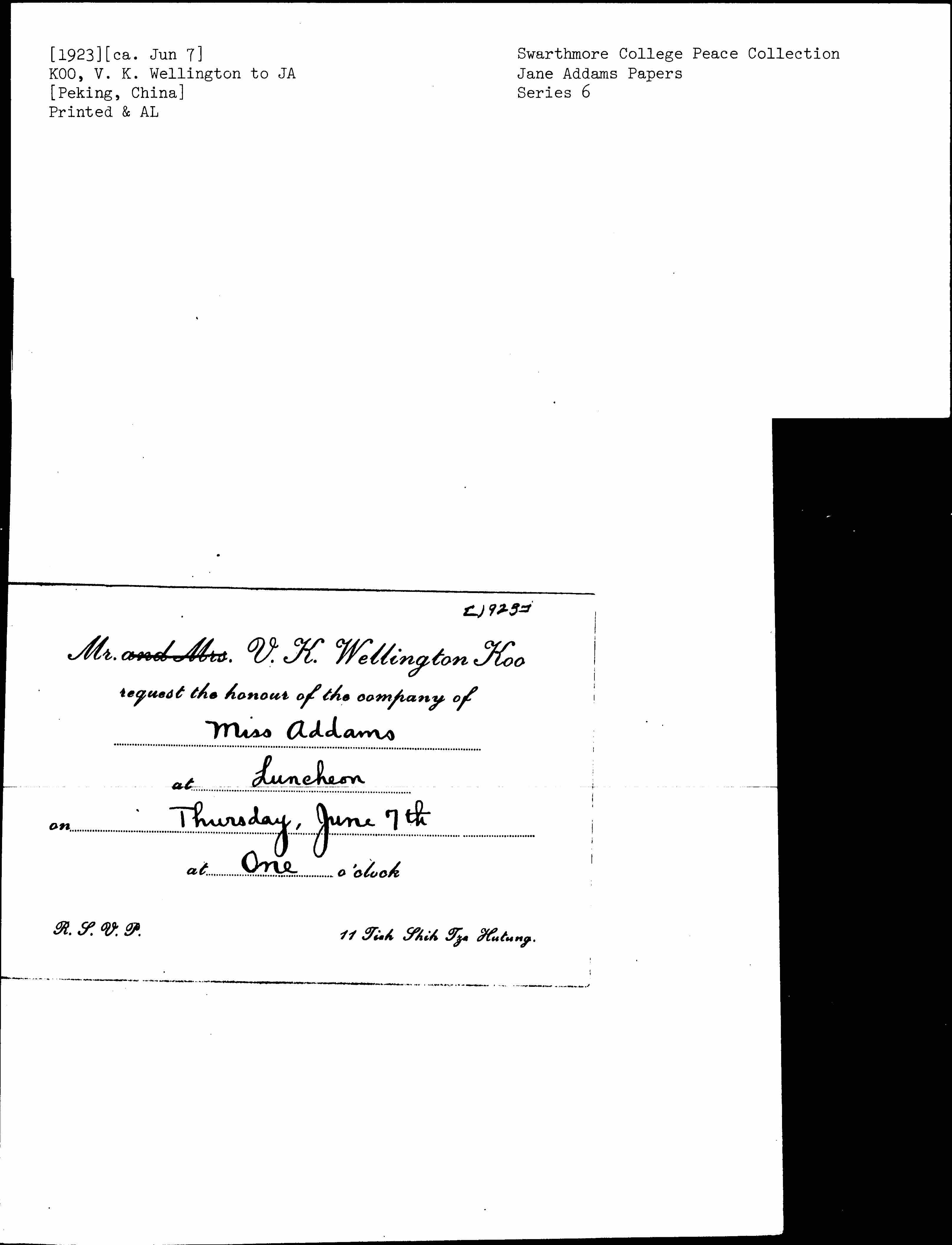 Mr. and Mrs. V. K. Wellington Koo request the [honor] of the company of ↑Miss Addams↓ at ↑Luncheon↓ on ↑Thursday, June 7th↓ at ↑One↓ o'clock