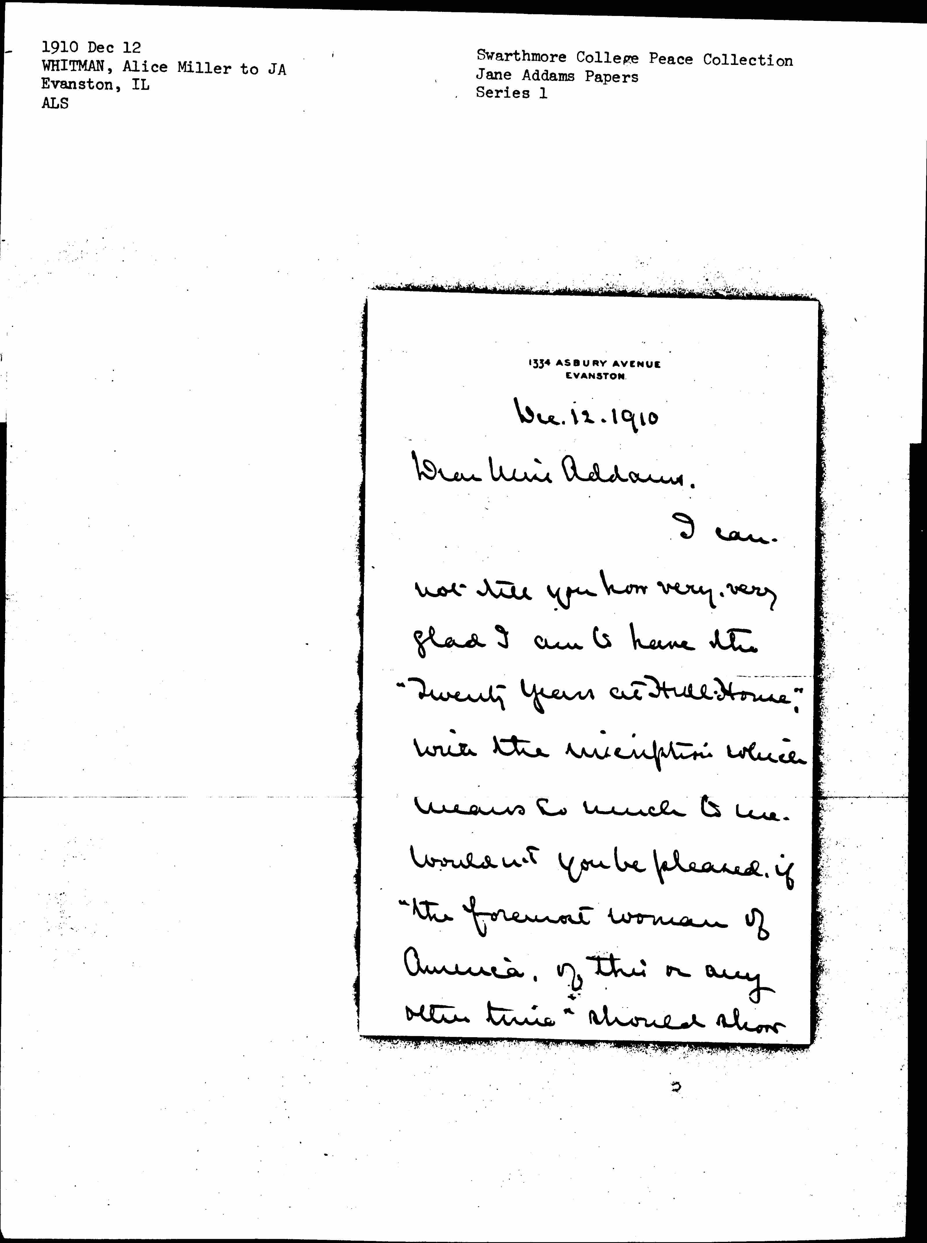 I cannot tell you how very, very glad I am to have the "Twenty Years at Hull House," with the inscription which means so much to me. Wouldn't you be pleased if "the foremost woman of America, of this or any other time" should show [page 2] you such an attention? From the nature of the case this pleasant [situation] can never be yours, & in this I have a decided advantage on you.