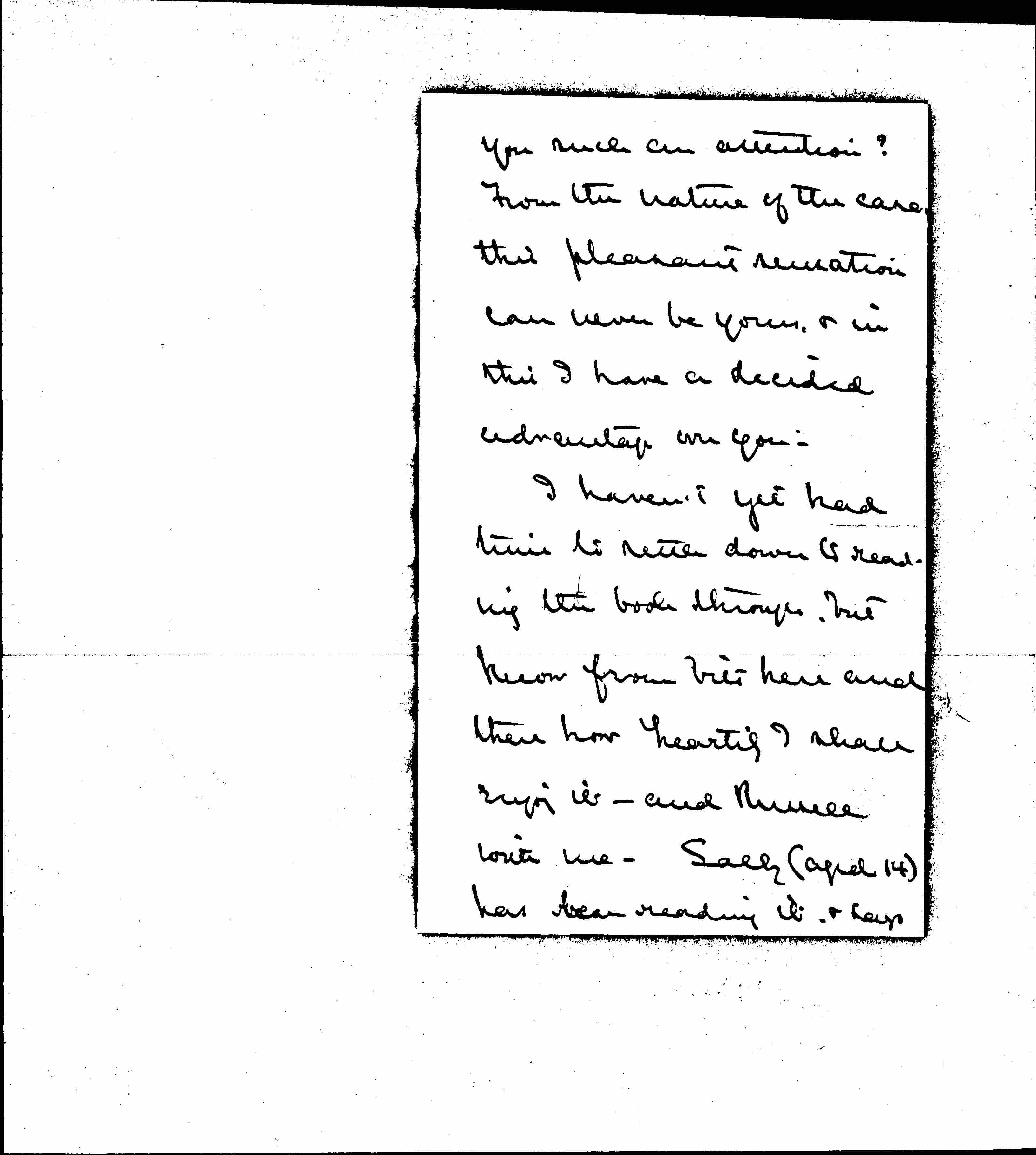 I haven't yet had time to settle down to reading the book through, but know from bits here and there how [heartily] I shall enjoy it -- and Russell with me. Sarah (aged 14) has been reading it & says [page 3] "Be sure to thank her like everything!" Mother has read it, & says "It's wonderful."