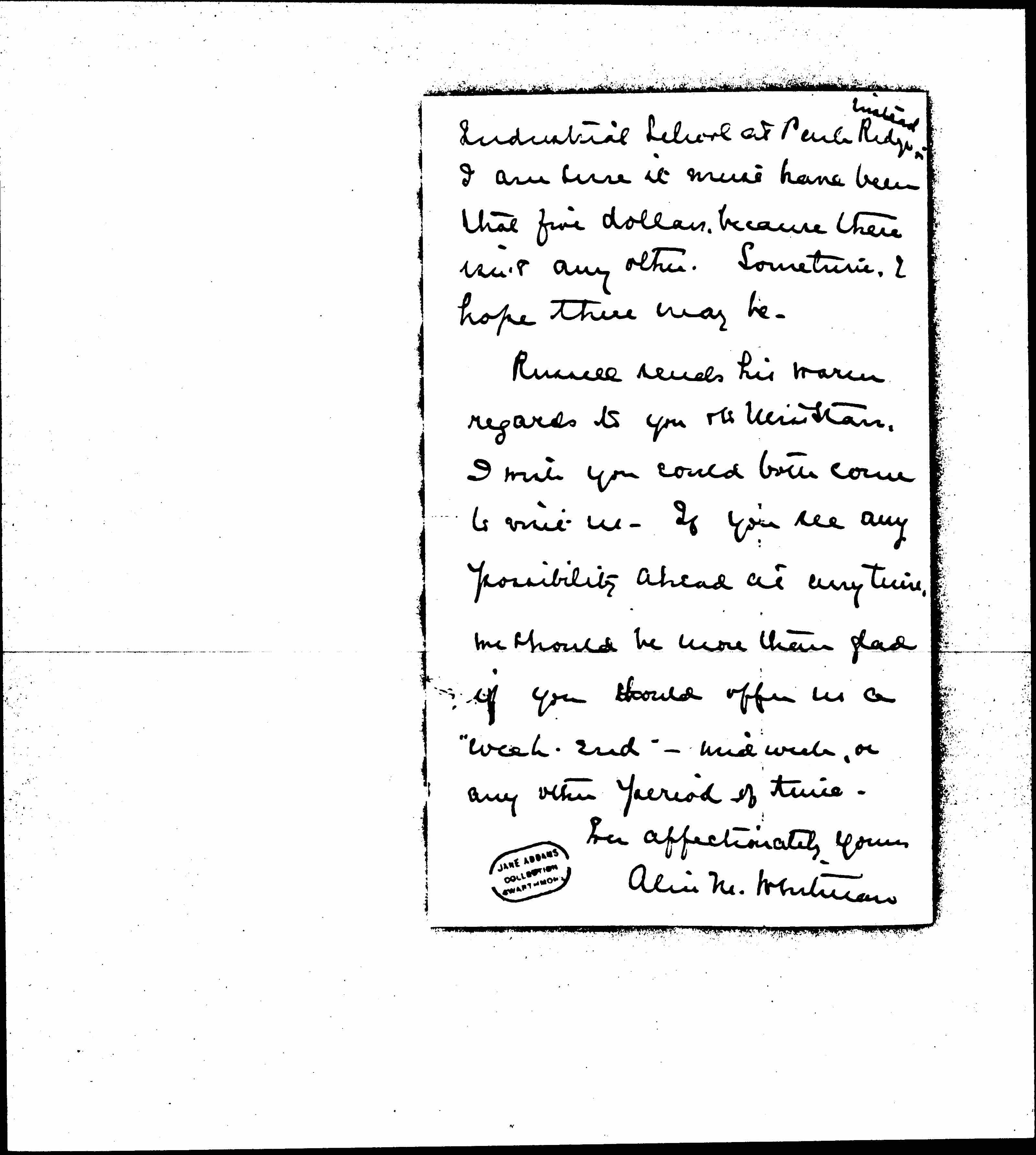 Russell sends his warm regards to you & to Miss Starr. I wish you could both come to visit us. If you see any possibility ahead at any time, we should be more than glad if should offer us a ["weekend"] -- mid week, or any other period of time.