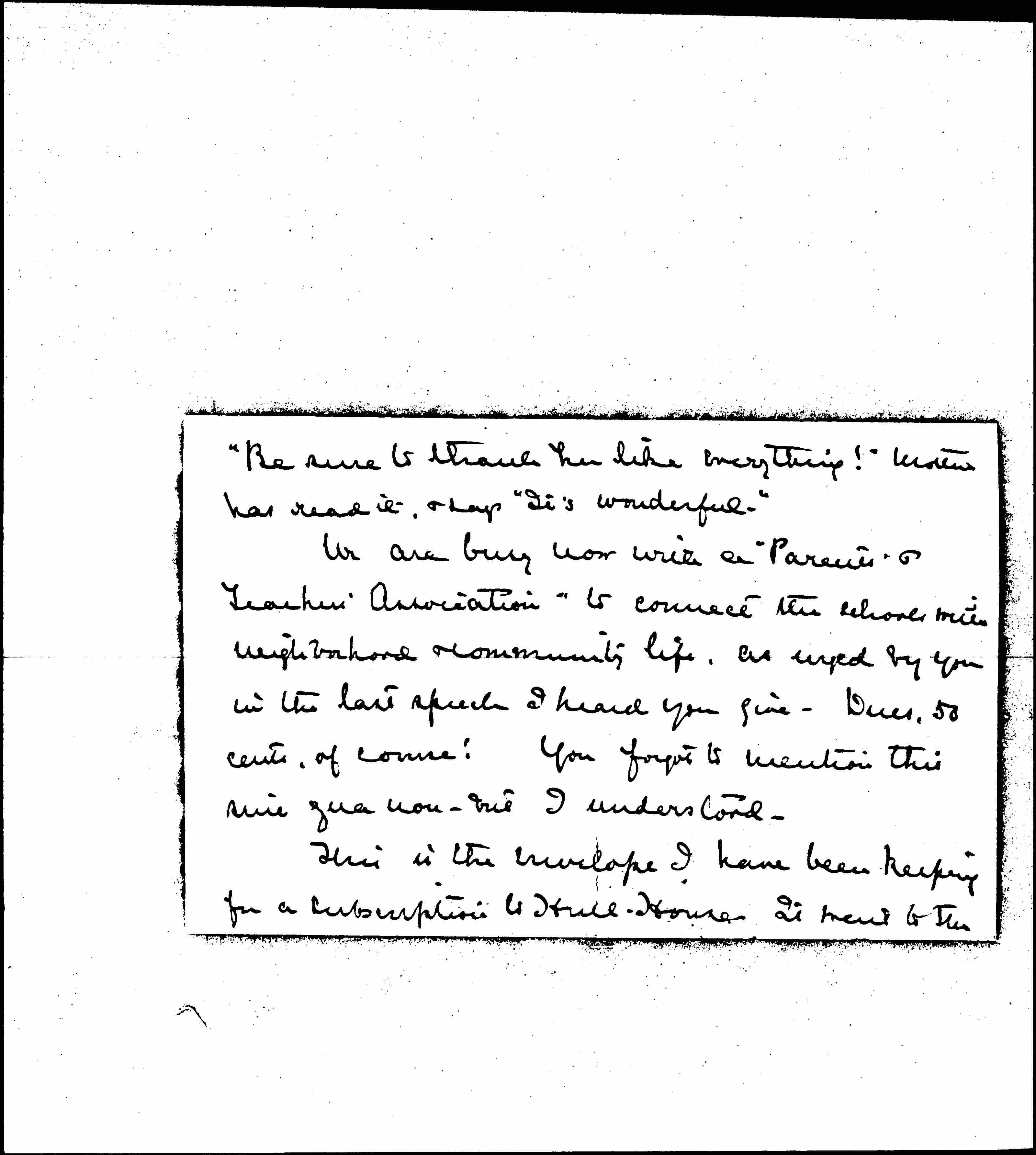 We are busy now with a "Parents & Teacher's Association" to connect the schools with neighborhood & community life. As urged by you in the last speech I heard you give, Dues, 50 cents of course! You forgot to mention this sine qua non -- but I understand.