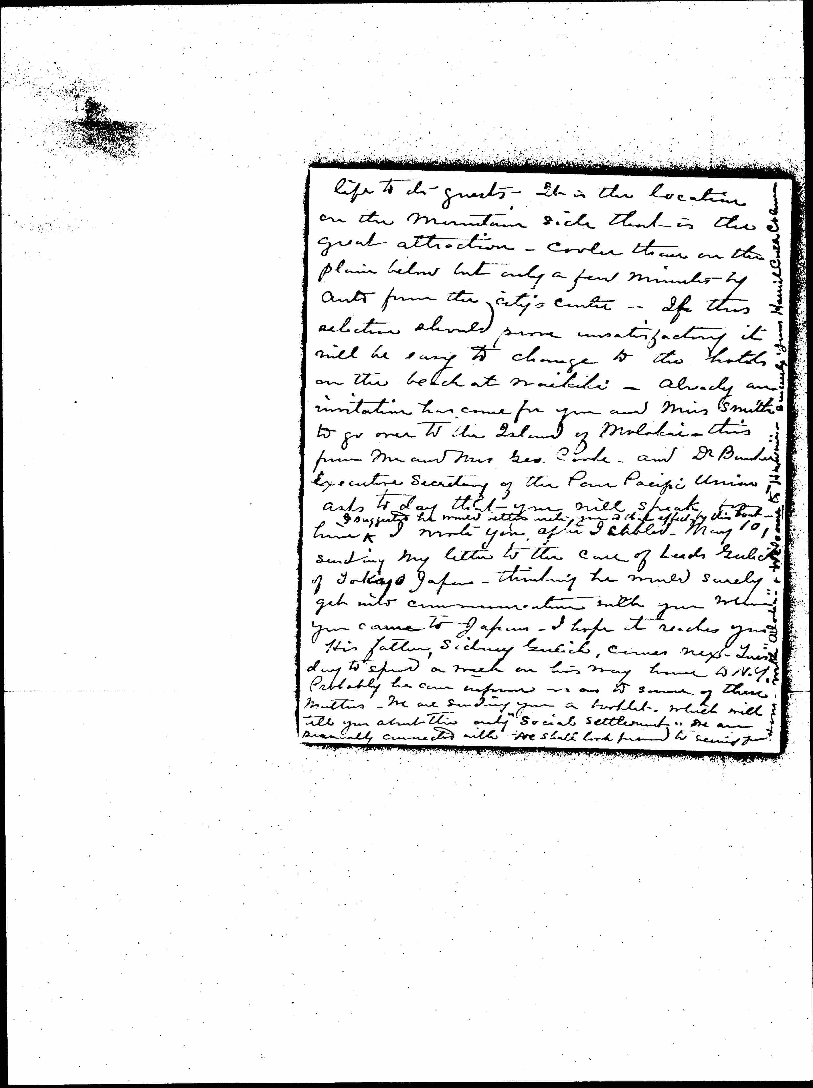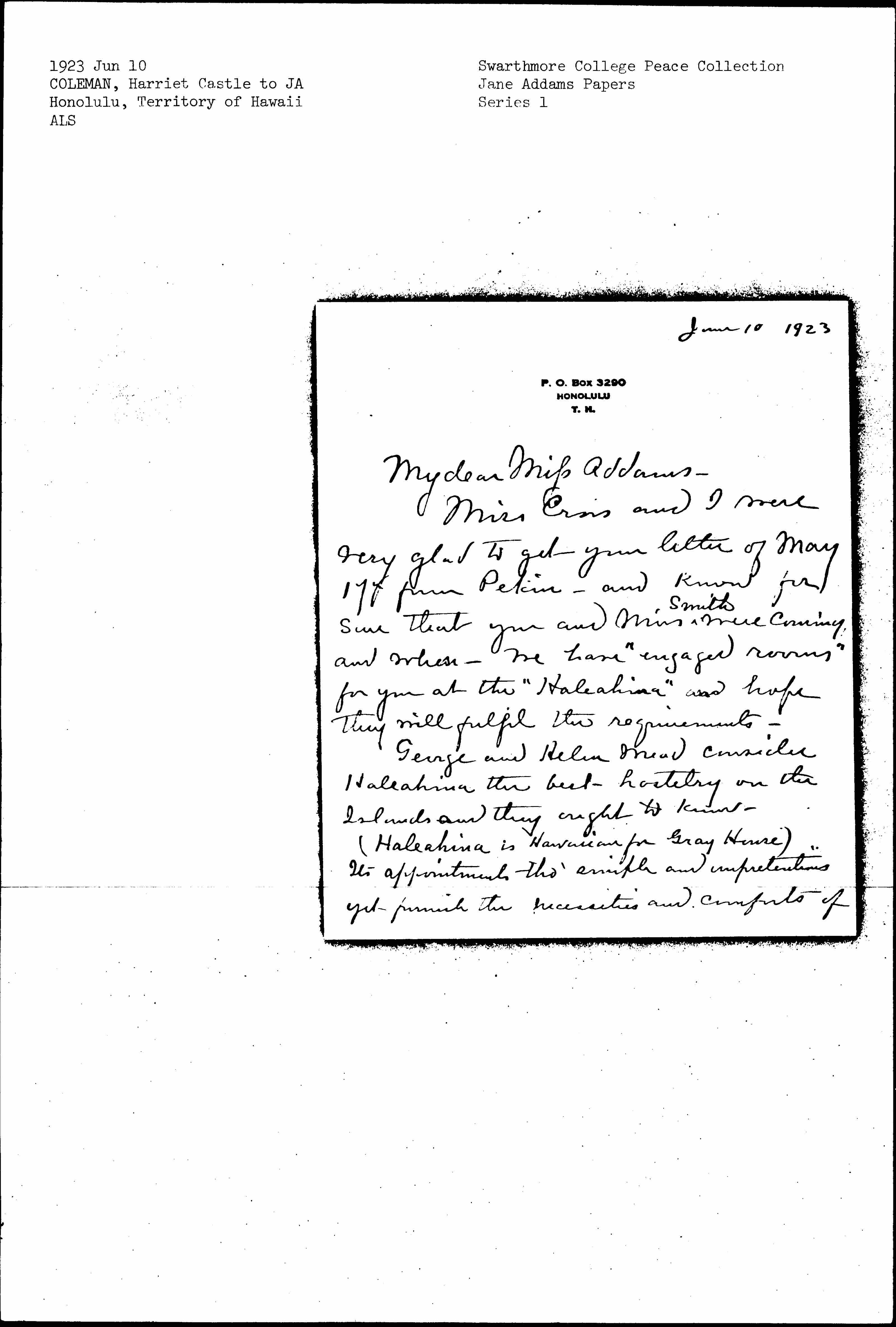 Its appointments [though] simple and unpretentious yet furnish the necessities and comforts of [page 2] life to its guests. It is the location on the mountain side that is the great attraction -- cooler than on the plain below but only a few minutes by auto from the city's center. If this selection should prove unsatisfactory it will be easy to change to the hotels on the beach at Waikiki -- already an invitation has come for you and Miss Smith to go over to the Island of Molokai -- this from Mr and Mrs Geo. Cooke -- and Dr Bunker Executive Secretary of the Pan Pacific Union asks [today] that you will speak for him. ↑I suggested he would better write you to the effect by this boat.↓ I wrote you after I cabled -- May 10, sending my letter to the care of Leeds Gulick of Tokyo Japan -- thinking he would surely get into communication with you when you came to Japan -- I hope it reaches you. His father, Sidney Gulick, comes next Tuesday to spend a week on his way home to N.Y. Probably he can inform us as to some of these matters. We are sending you a booklet -- which will tell you about this only "social settlement" we are personally connected with -- we shall look forward to seeing you [written up right margin] soon -- with "Alohas" & Welcome to Hawaii Sincerely Yours Harriet Castle Coleman [page 3]