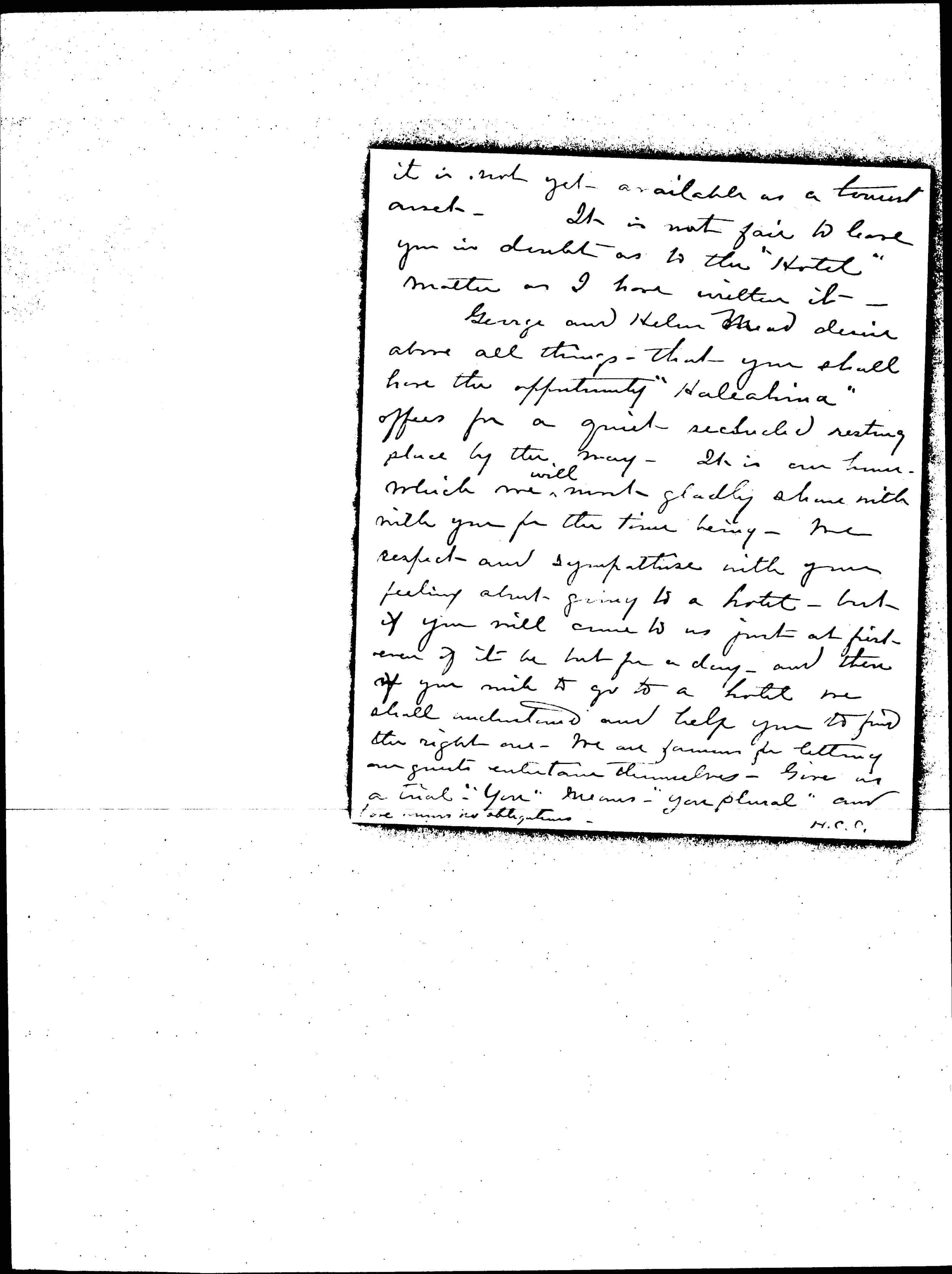 George and Helen Mead desire above all things -- that you shall have the opportunity "Haleahina" offers for a quiet secluded resting place by the way -- It is our [house] -- which we ↑will↓ most gladly share with you for the time being. We respect and sympathize with your feeling about going to a hotel -- but if you will come to us just at first even if it be but for a day -- and then if you wish to go to a hotel we shall understand and help you to find the right one. We are famous for letting our guests entertain themselves. Give us a trial -- "You" means "you plural" and love [means] no obligations.