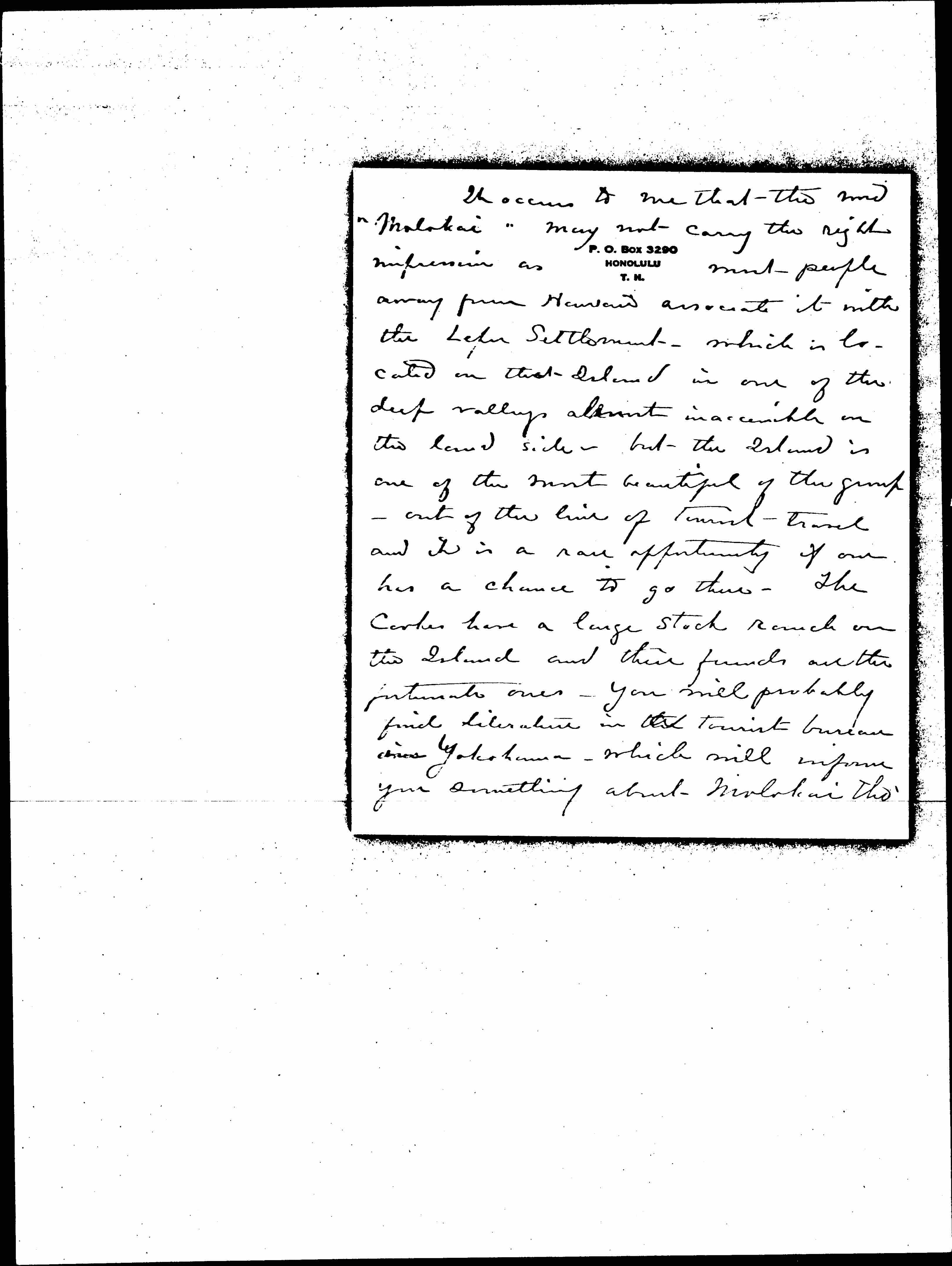 It occurs to me that the word "Molokai" may not carry the right impression as most people away from Hawaii associate it with the Leper Settlement -- which is located on that Island in one of the deep valleys almost inaccessible on the land side -- but the Island is one of the most beautiful of the group -- out of the line of tourist travel and it is a rare opportunity if one has a chance to go there. The Cookes have a large stock ranch on the Island and their friends are the fortunate ones. You will probably find literature in the tourist bureau [in] Yokohama -- which will inform you something about Molokai [though] [page 4] it is not yet available as a tourist asset. It is not fair to leave you in doubt as to the "Hotel" matter as I have written it.