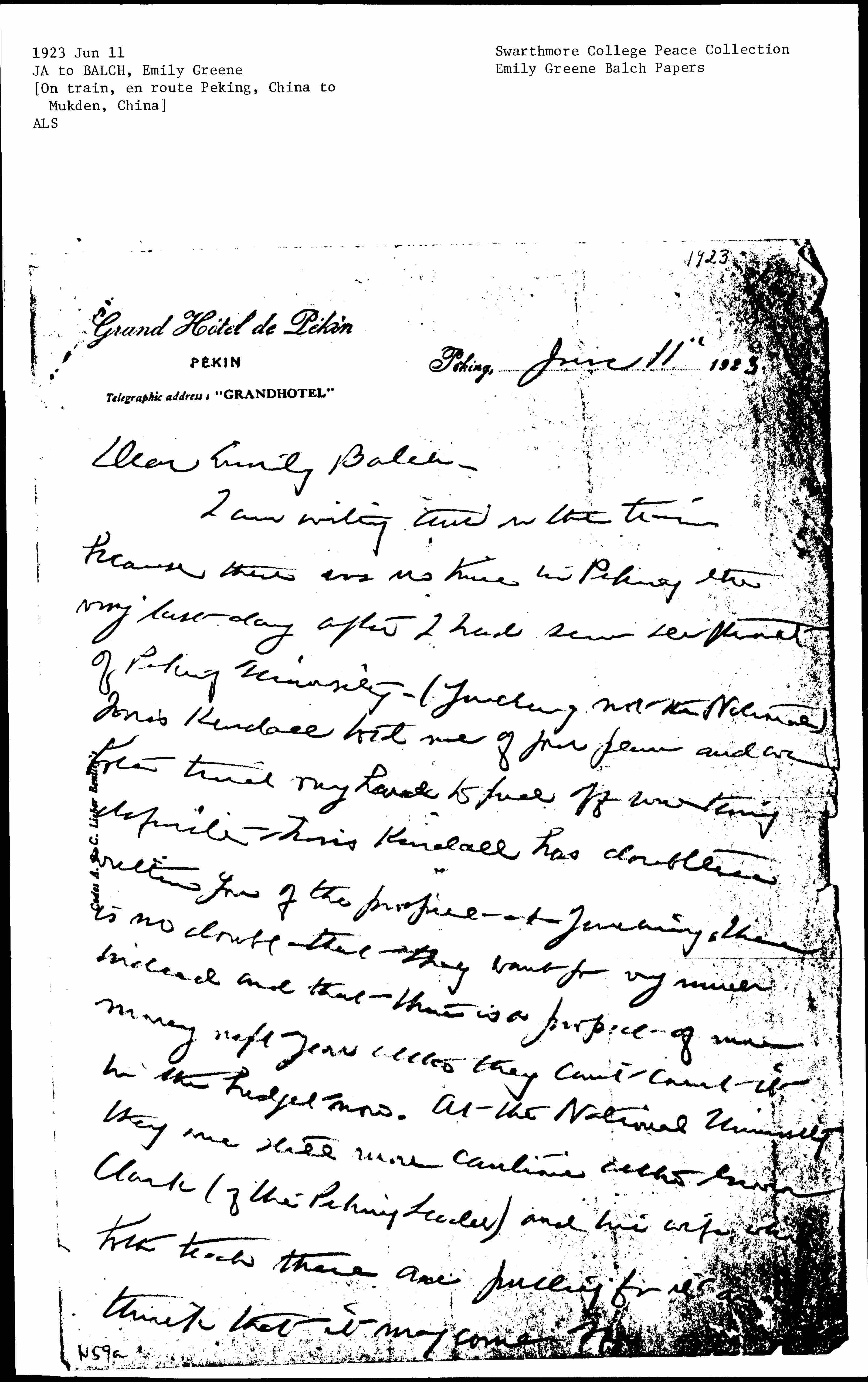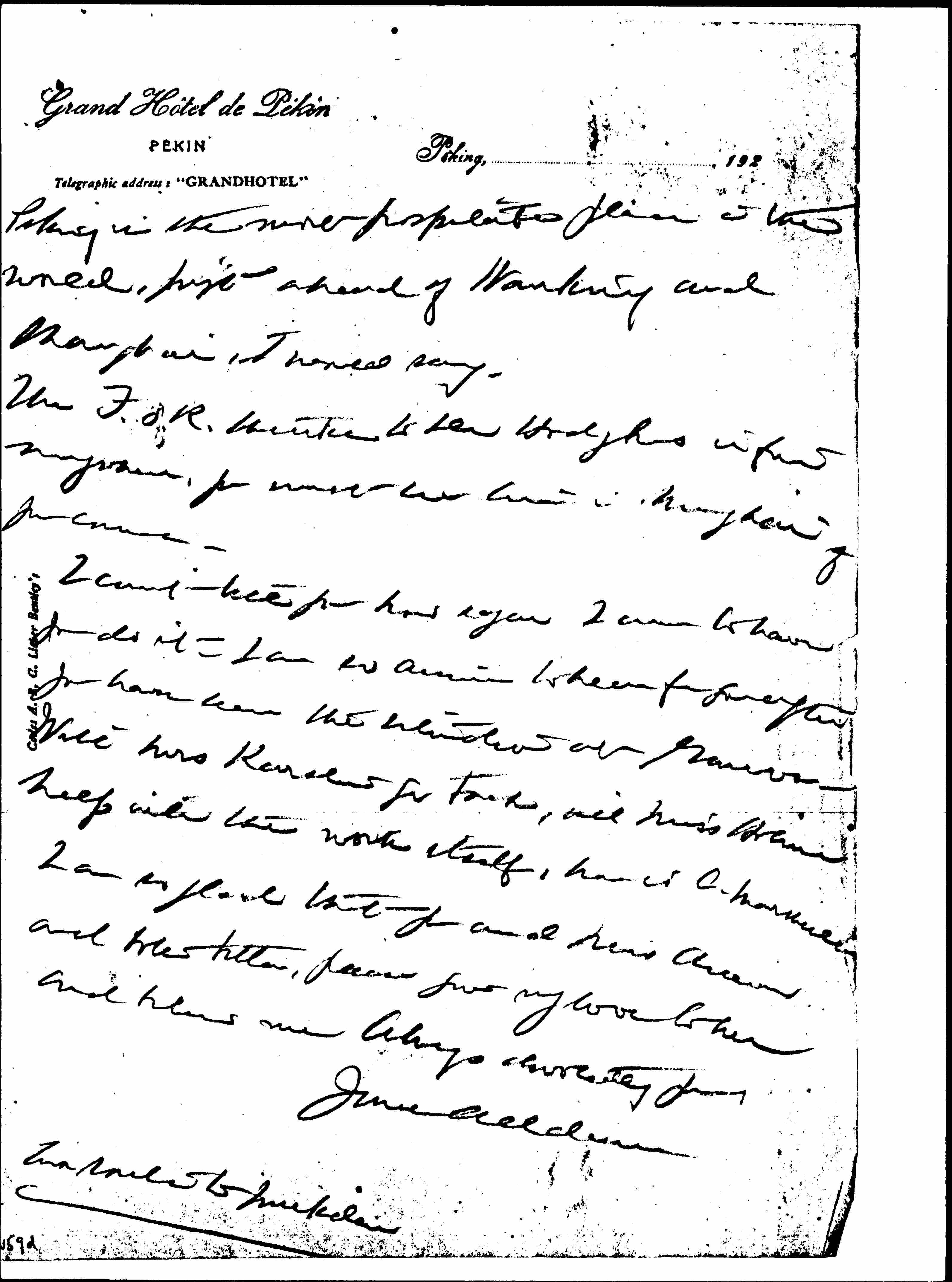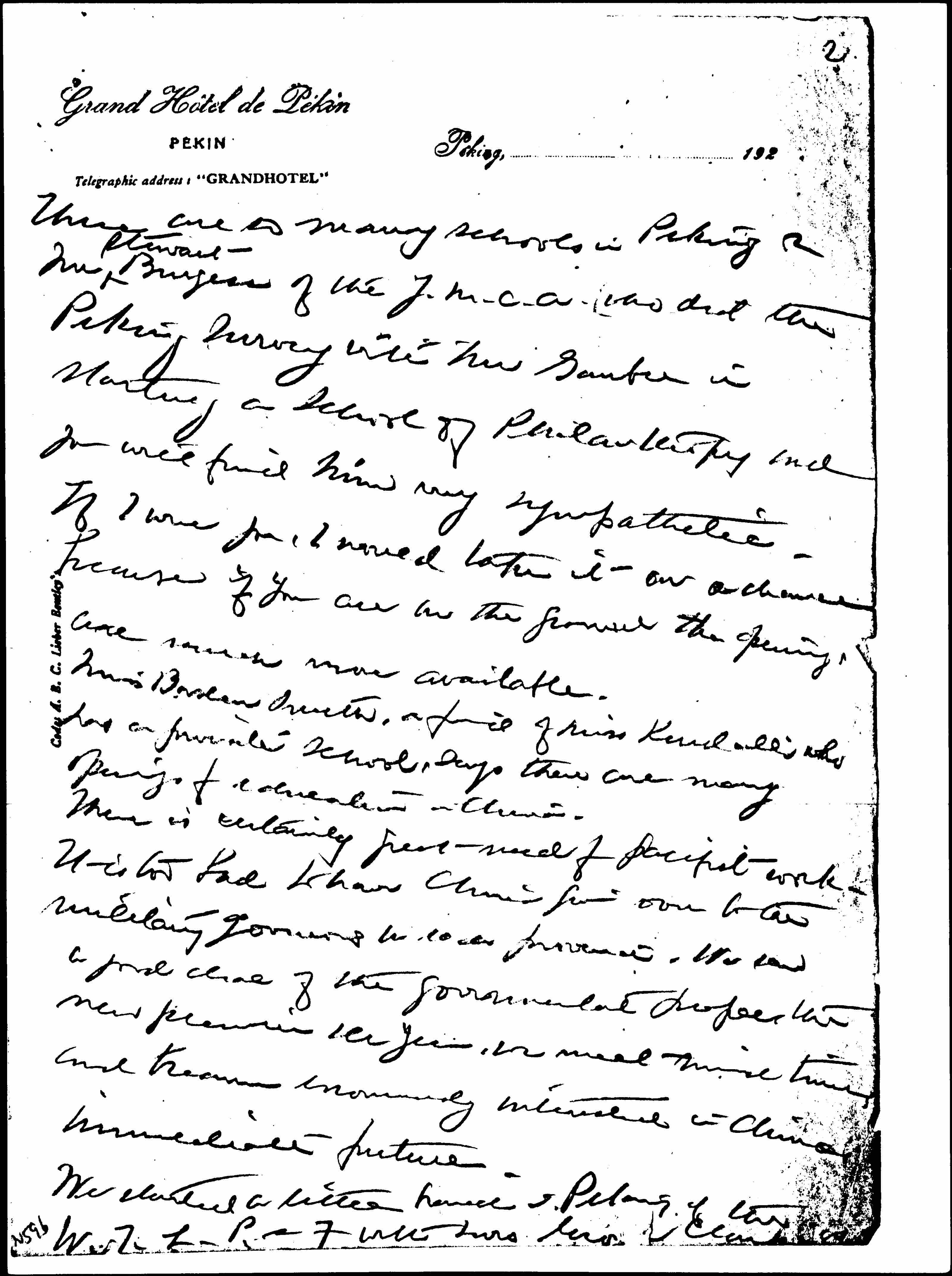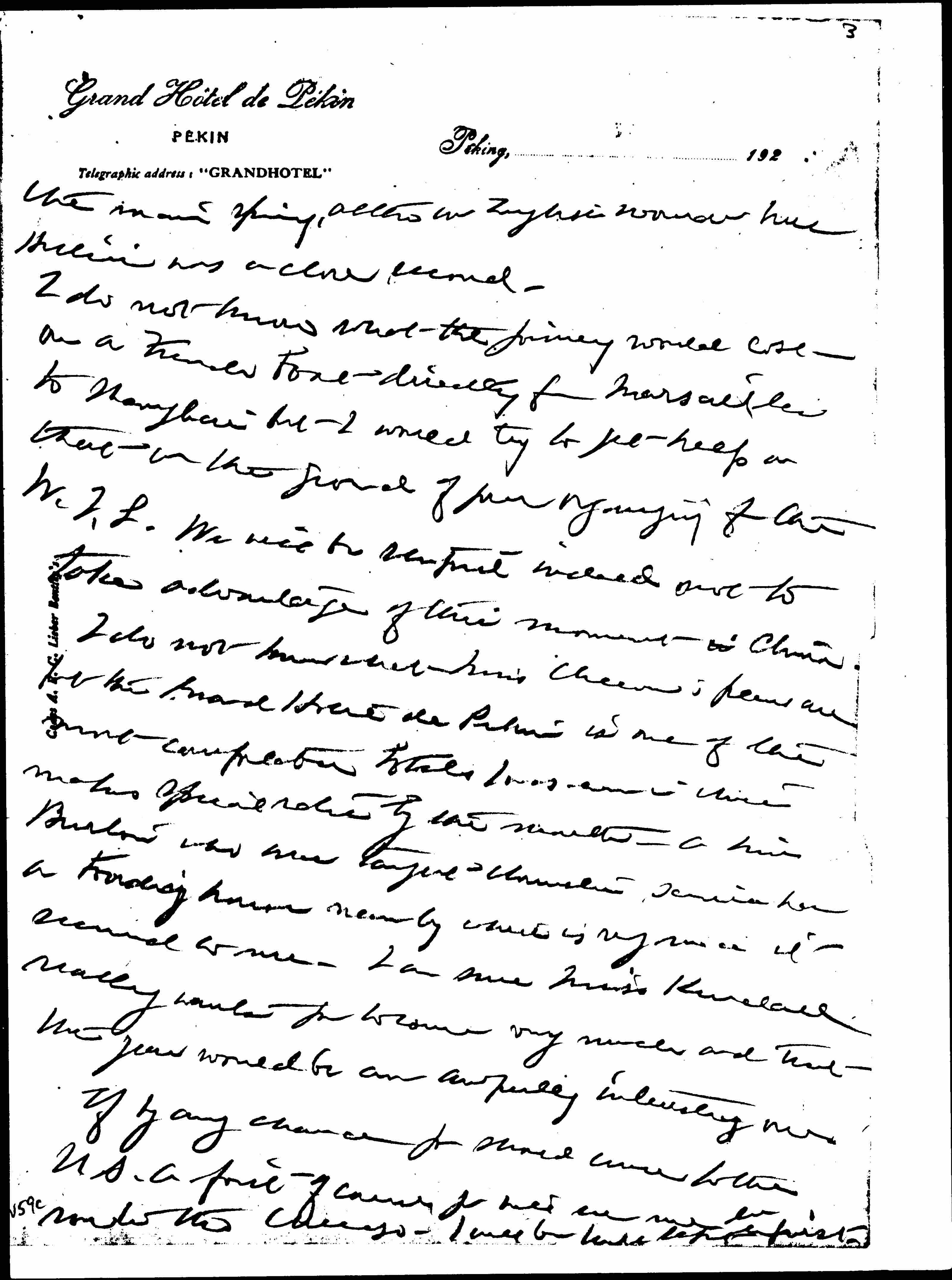 I do not know what the journey would cost on a French boat directly from Marseilles to Shanghai but I would try to get help on that on the ground of your organizing for the W.I.L. We will be stupid indeed not to take advantage of this moment in China. I do not know what Miss Cheever's plans are but the Grand Hotel de Pekin is one of the most comfortable hotels I was ever in which makes special rates by the month -- a Miss Burton who [runs?] [illegible] [services here?] a boarding house nearby which is very nice it seemed to me. I am sure Miss Kendall really wants you to come very much and that the year would be an awfully interesting one.