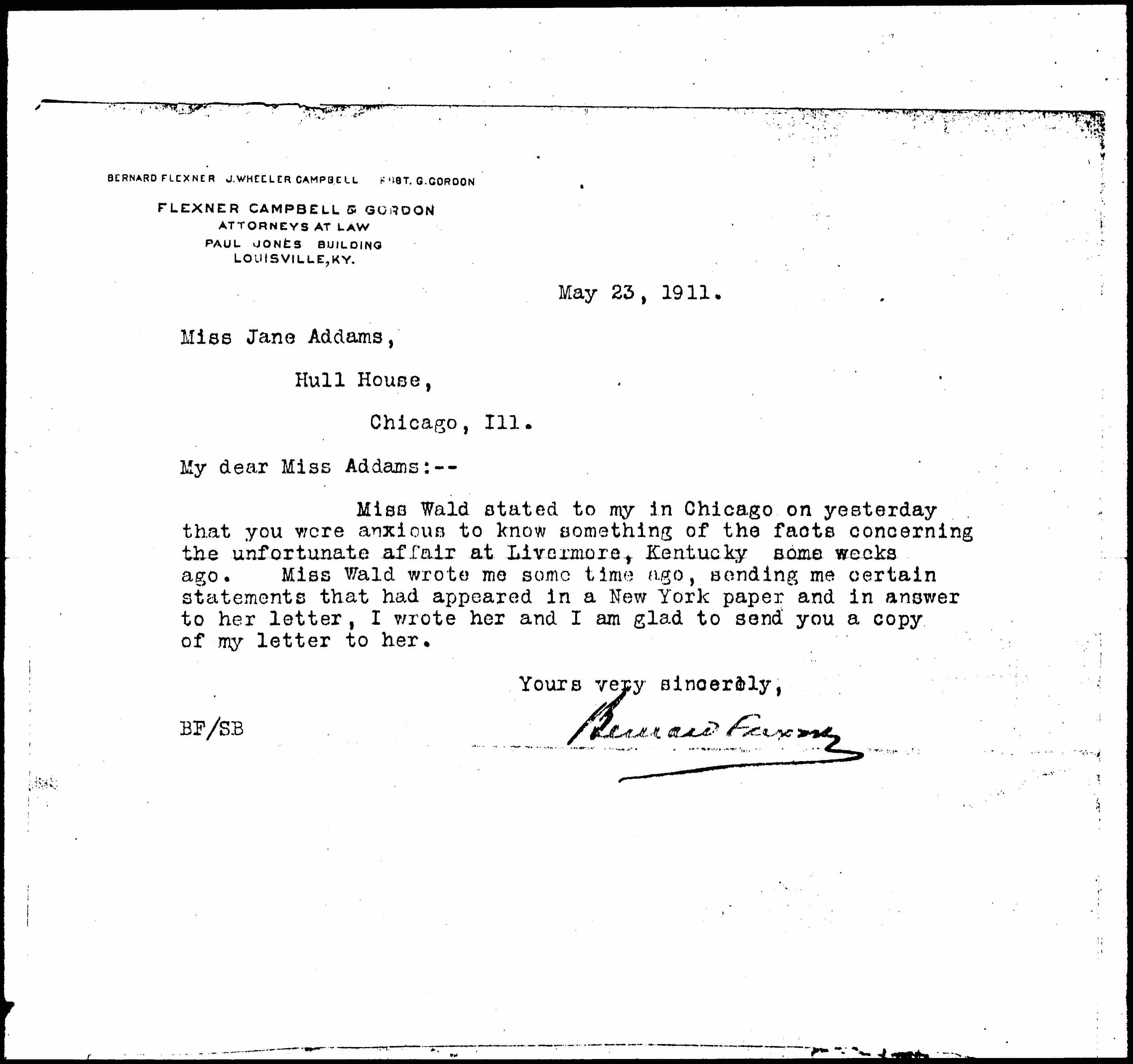 Miss Wald stated to [me] in Chicago on yesterday that you were anxious to know something of the facts concerning the unfortunate affair at Livermore, Kentucky some weeks ago. Miss Wald wrote me some time ago, sending me certain statements that had appeared in a New York paper in answer to her letter, I wrote her and I am glad to send you a copy of my letter to her.
