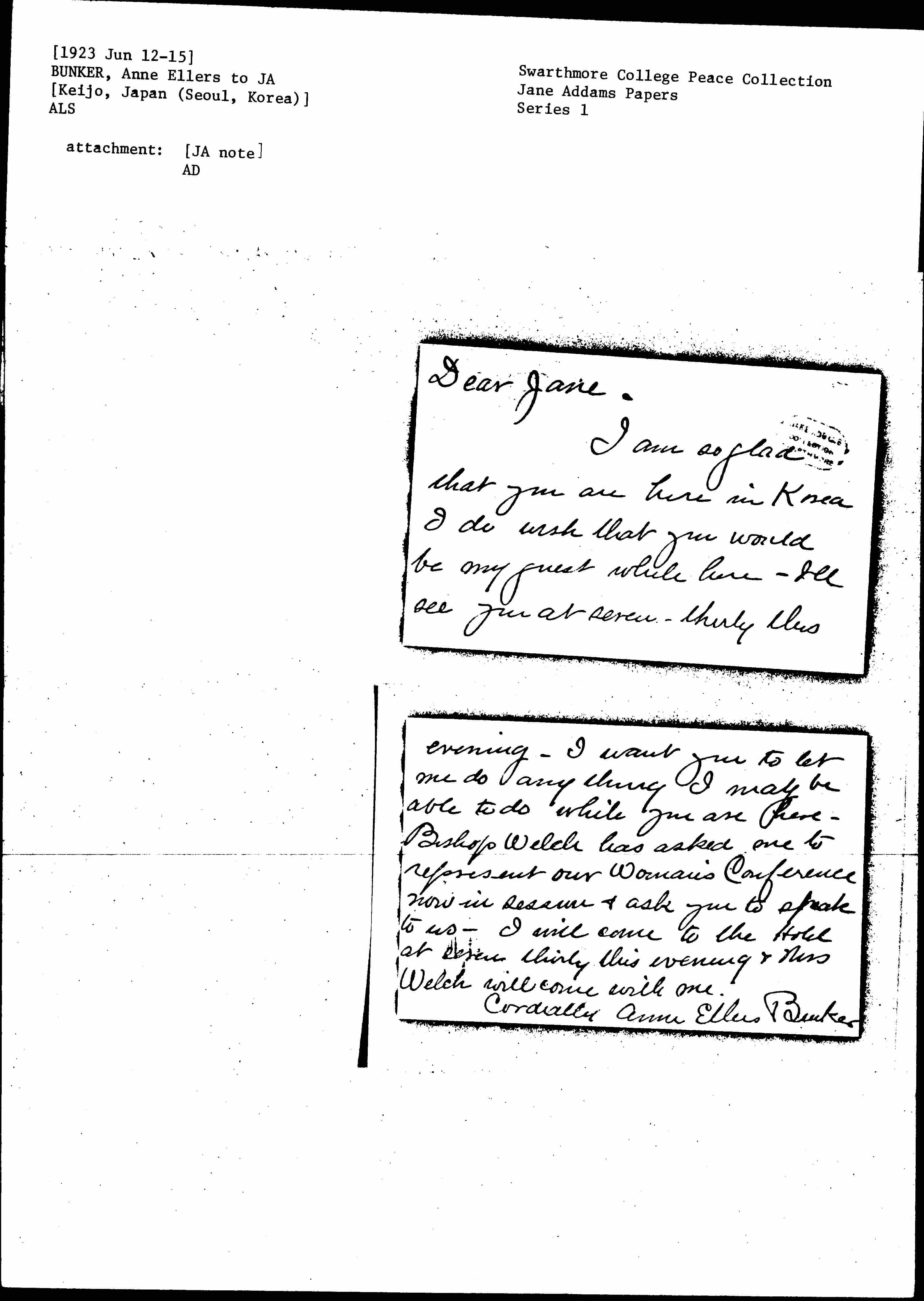 I am so glad that you are here in Korea I do wish that you would be my guest while here. I'll see you at seven-thirty this [page 2] evening. I want you to let me do anything I may be able to do while you are here. Bishop Welch has asked me to represent our Woman's Conference now in session & ask you to speak to us. I will come to the Hotel at seven thirty this evening & Mrs Welch will come with me.