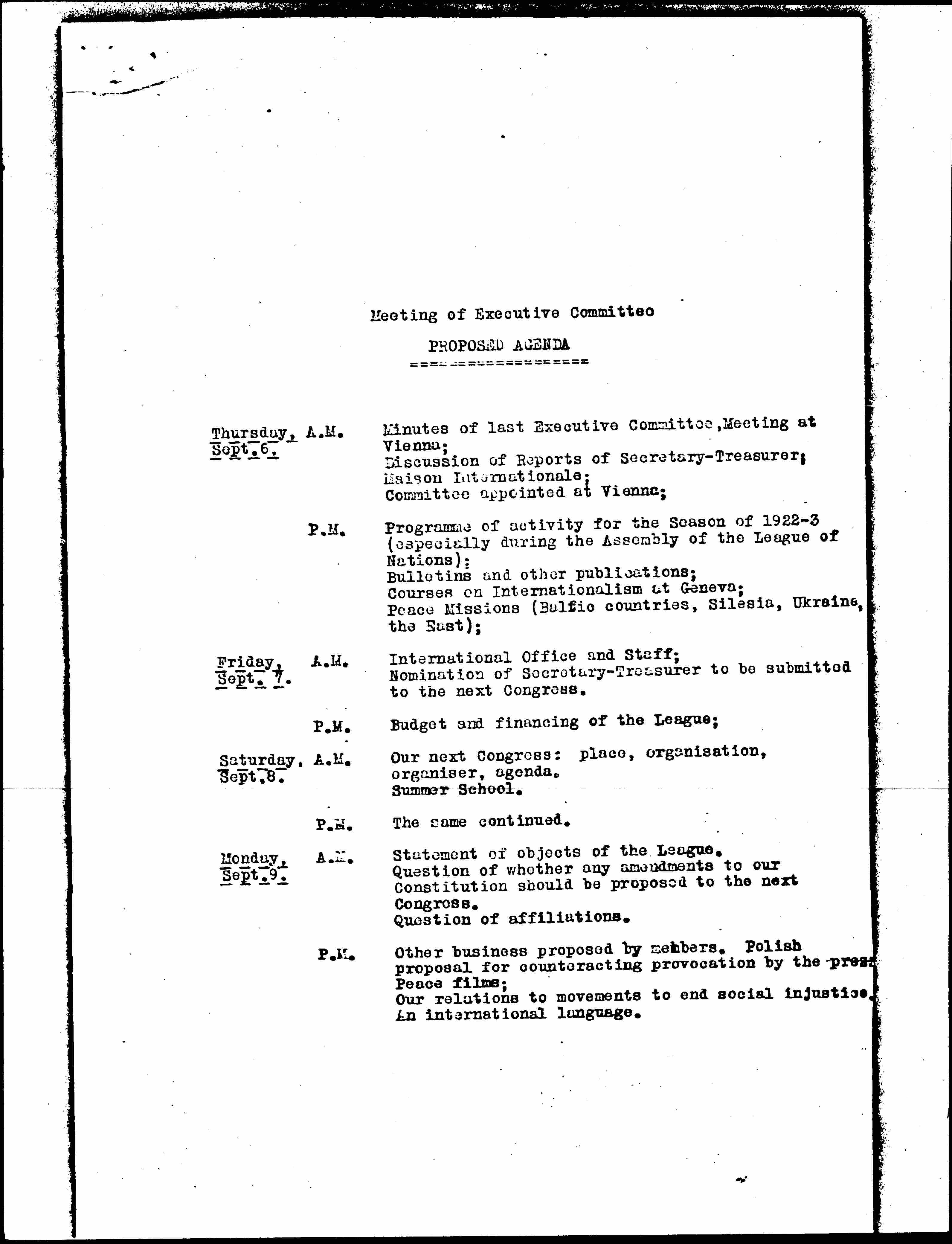 | Thursday, Sept. 6. | A.M. | Minutes of last Executive Committee, Meeting at Vienna; Discussion of Reports of Secretary-Treasurer; Maison Internationale; Committee appointed at Vienna; |