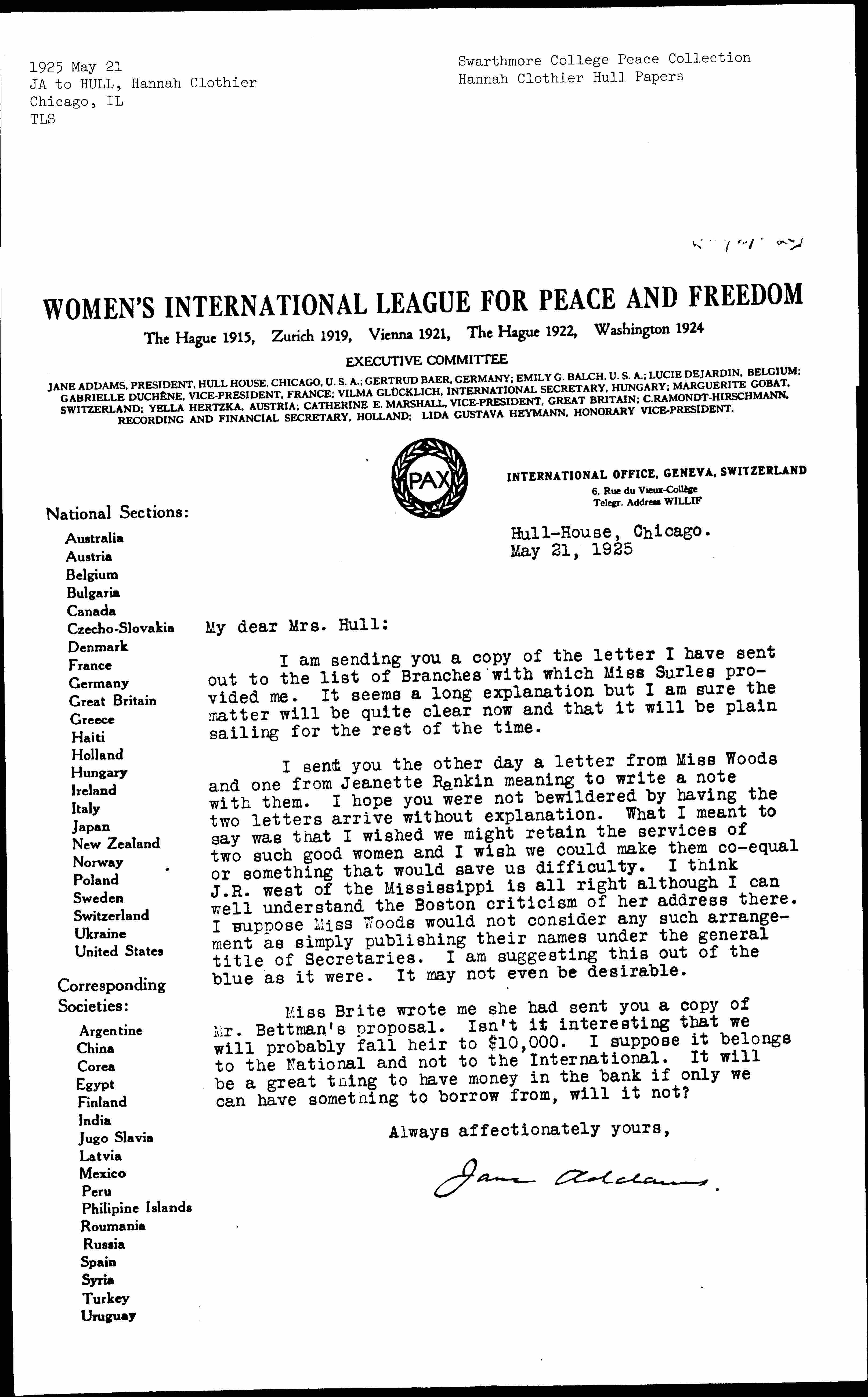 Miss Brite wrote me she had sent you a copy of Mr. Bettman’s proposal. Isn't it interesting that we will probably fall heir to $10,000. I suppose it belongs to the National and not to the International. It will be a great thing to have money in the bank if only we can have something to borrow from, will it not?