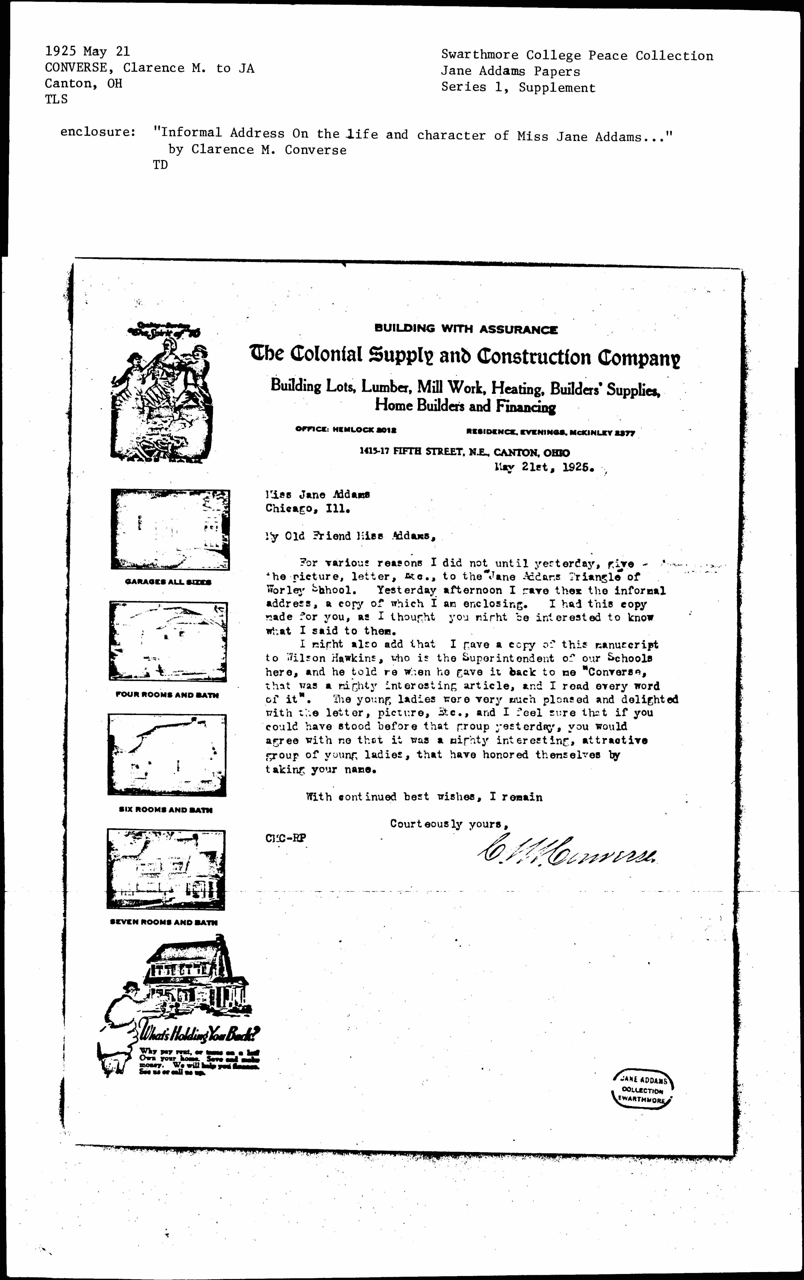 I might also add that I have a copy of this manuscript to Wilson Hawkins, who is the Superintendent of our Schools here, and he told me when he gave it back to me "Converse, that was a mighty interesting article and I read every word of it." The young ladies were very much pleased and delighted with the letter, picture, Etc., and I feel sure that if you could have stood before that group yesterday, you would agree with me that it was a mighty interesting, attractive group of young ladies that have honored themselves by taking your name.With continued best wishes, I remain