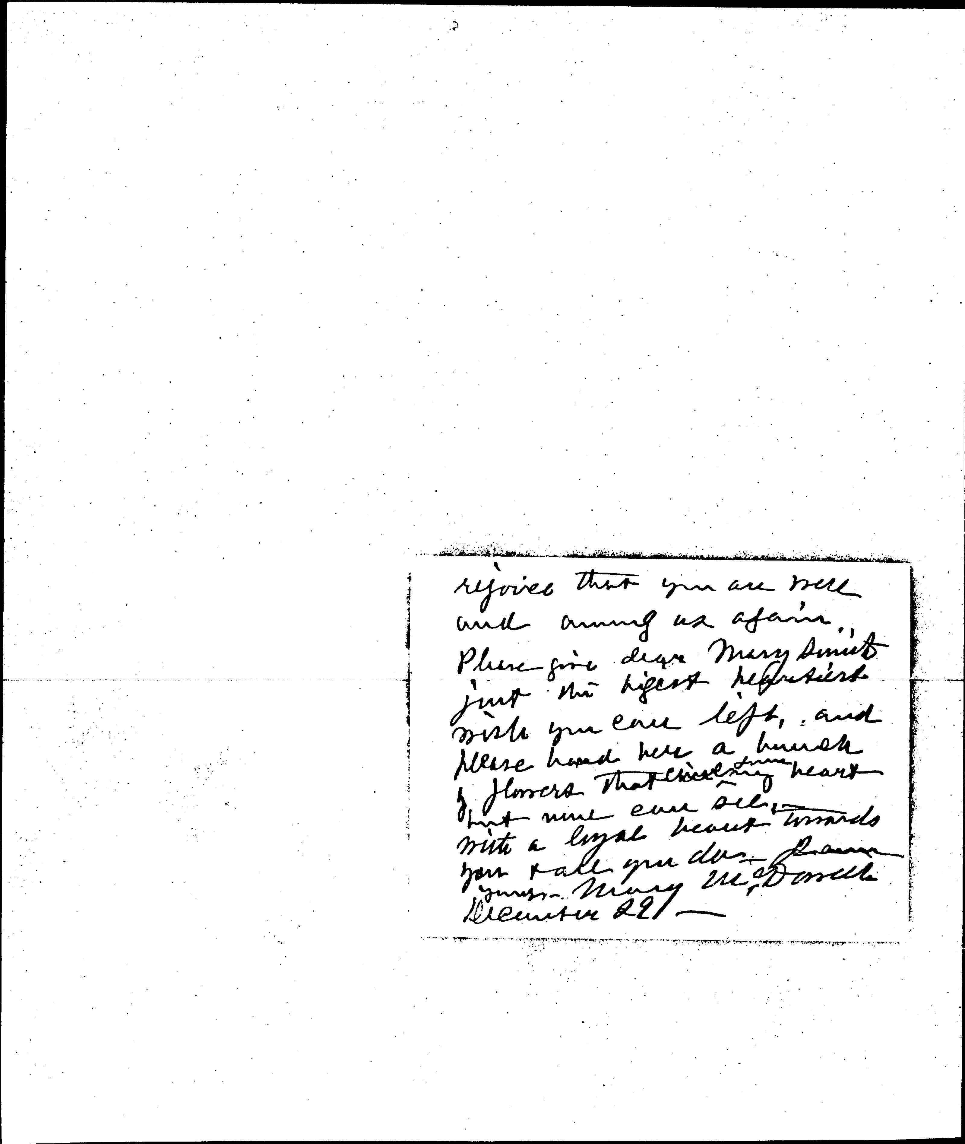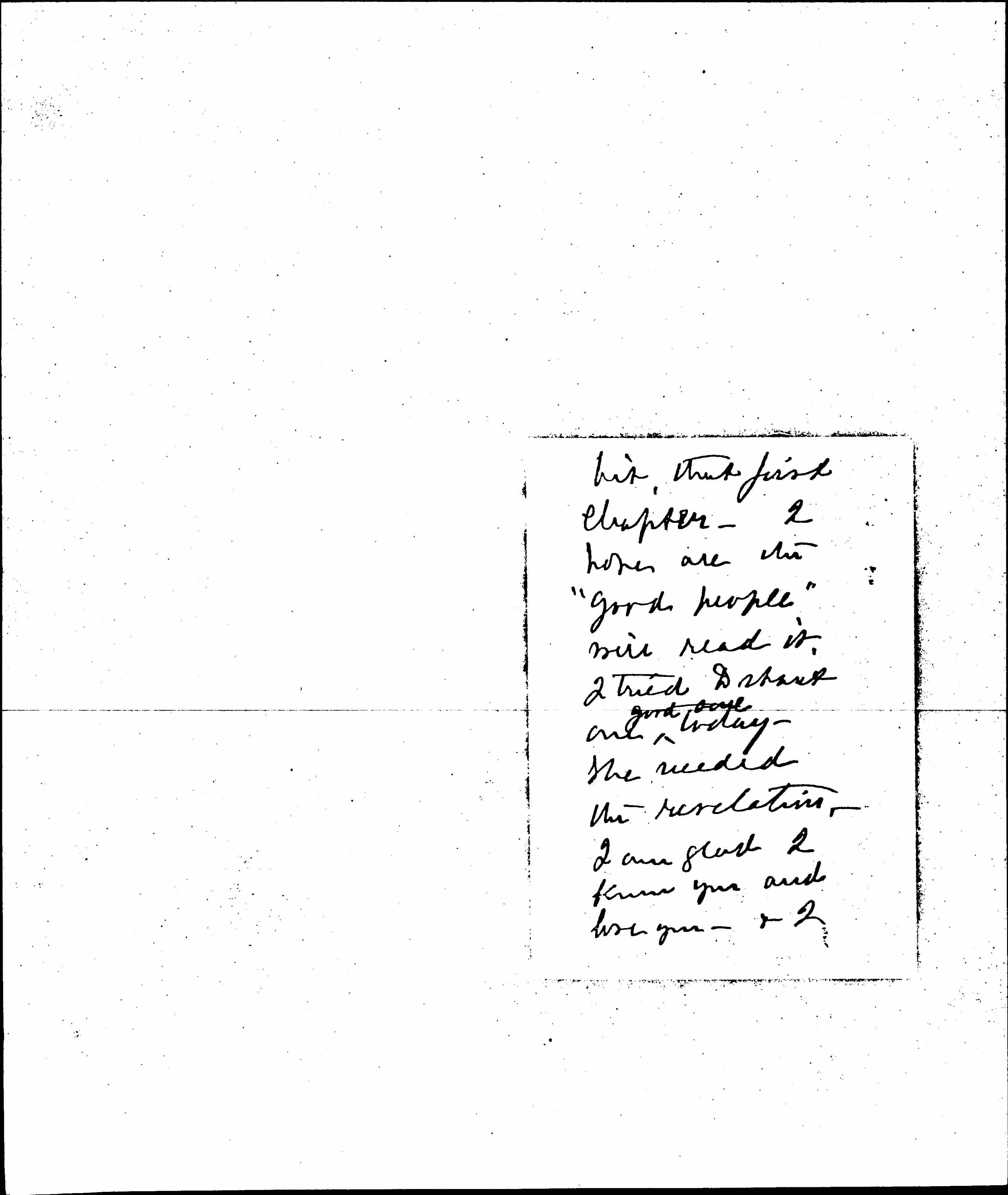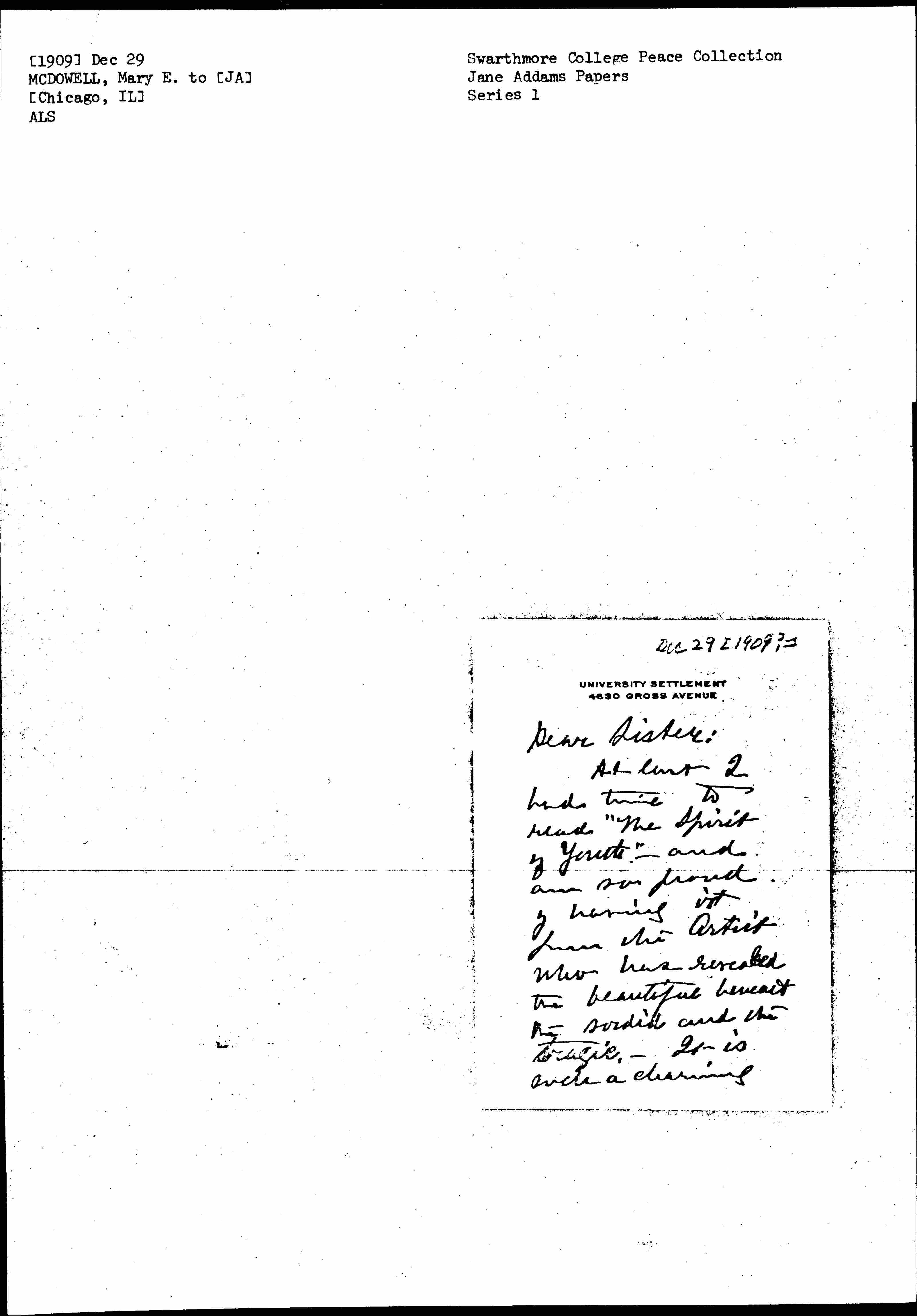 At last I had time to read "The Spirit of Youth" -- and am so proud of having it from the Artist who has revealed the beautiful beneath the sordid and the tragic. It is such a charming [page 2] bit, that first chapter. I hope all the "good people" will read it. I tried to [illegible] one ↑good soul↓ today. She needed the revelation. I am glad I know you and love you -- & I [page 3] rejoice that you are well and among us again. Please give dear Mary Smith just the highest [heartiest] wish you can lift, and please hand here a bunch of flowers that [illegible] ↑from↓ my heart but mine can see with a loyal heart towards you & all you do. I am yours