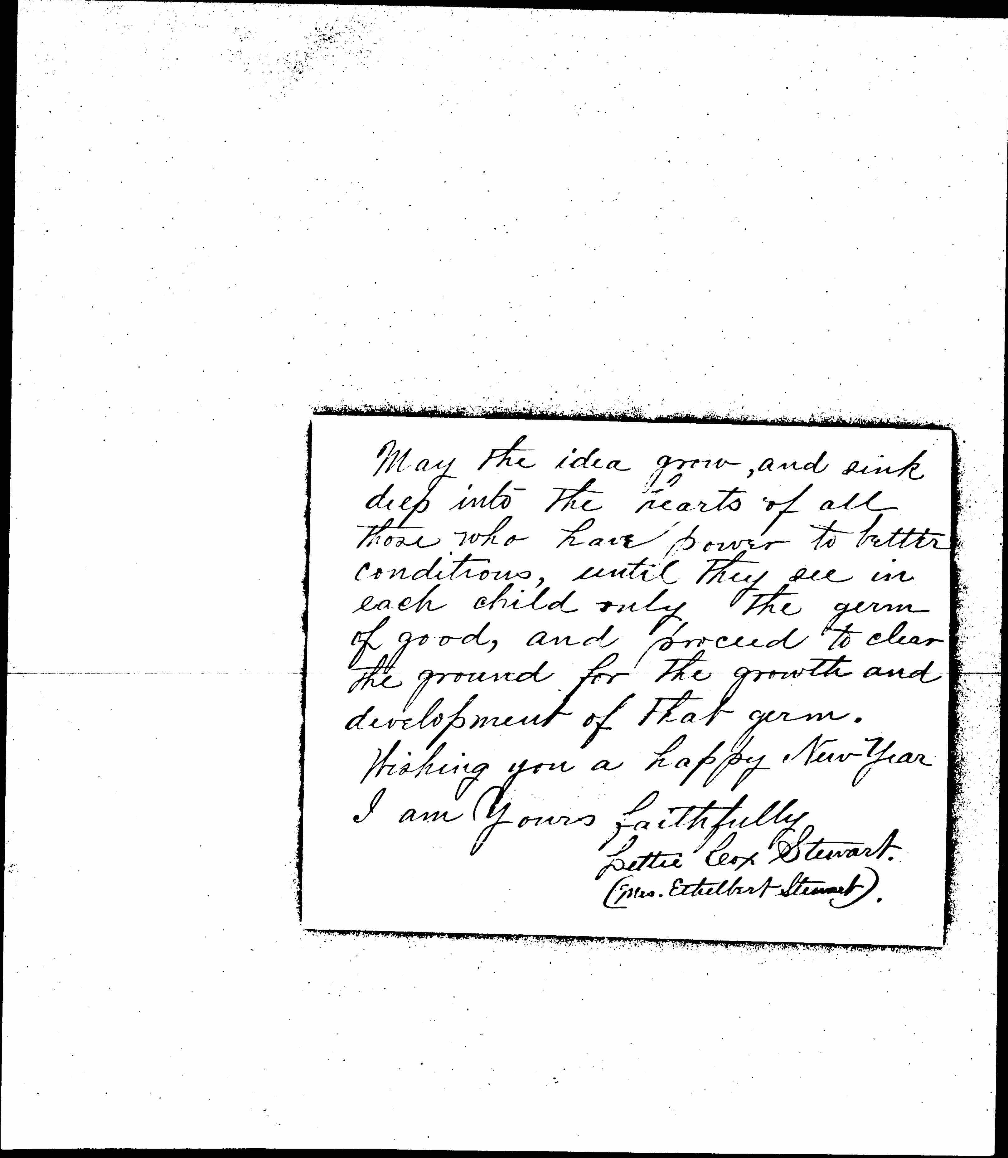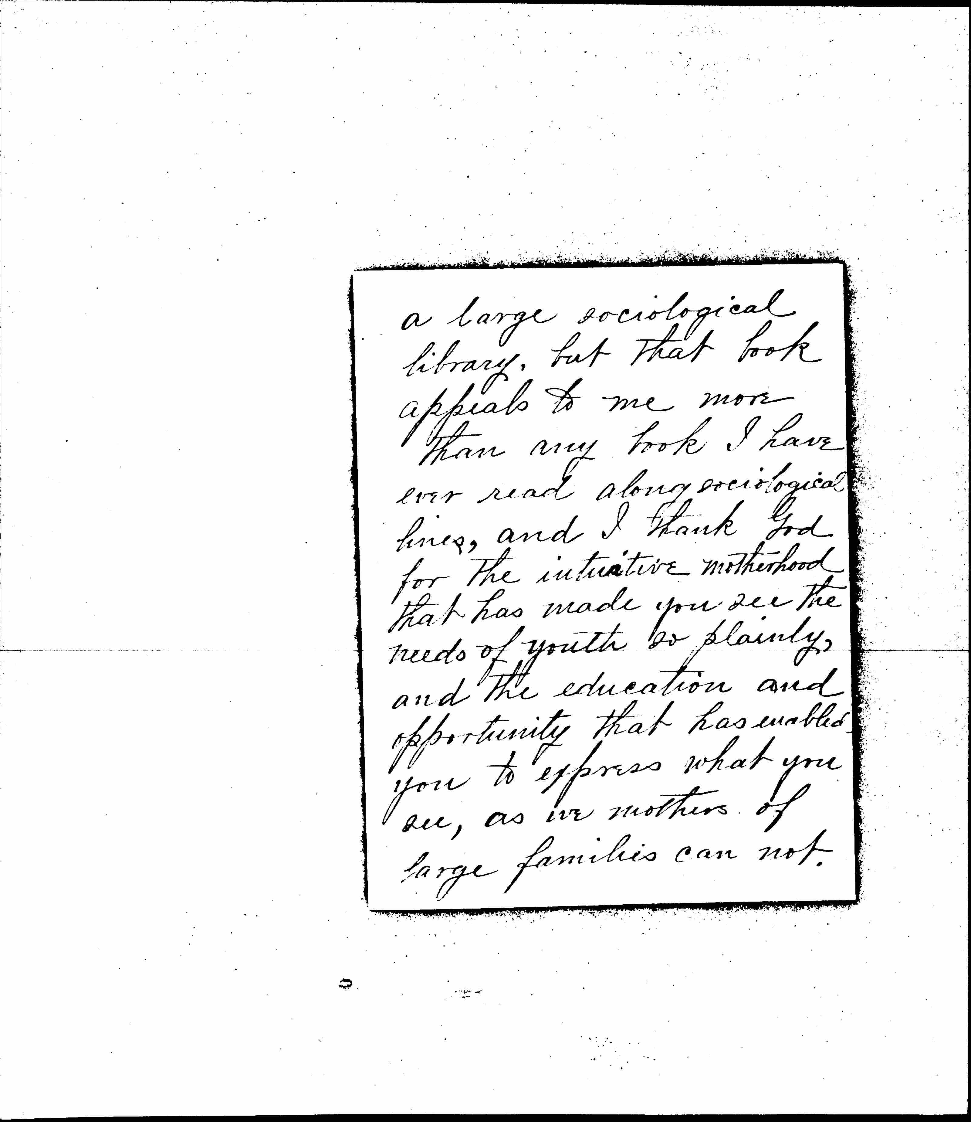I want to thank you for the new book you sent to Mr Stewart and me. I read it to him and we both enjoyed it immensely. We have [page 2] a large sociological library, but that book appeals to me more than any book I have ever read along sociological lines, and I thank God for the intuitive motherhood that has made you see the needs of youth so plainly, and the education and opportunity that has enabled you to express what you see, as we mothers of large families can not. [page 3] May the idea grow, and sink deep into the hearts of all those who have power to better conditions, until they see in each child only, the germ of good, and proceed to clear the ground for the growth and development of that germ.