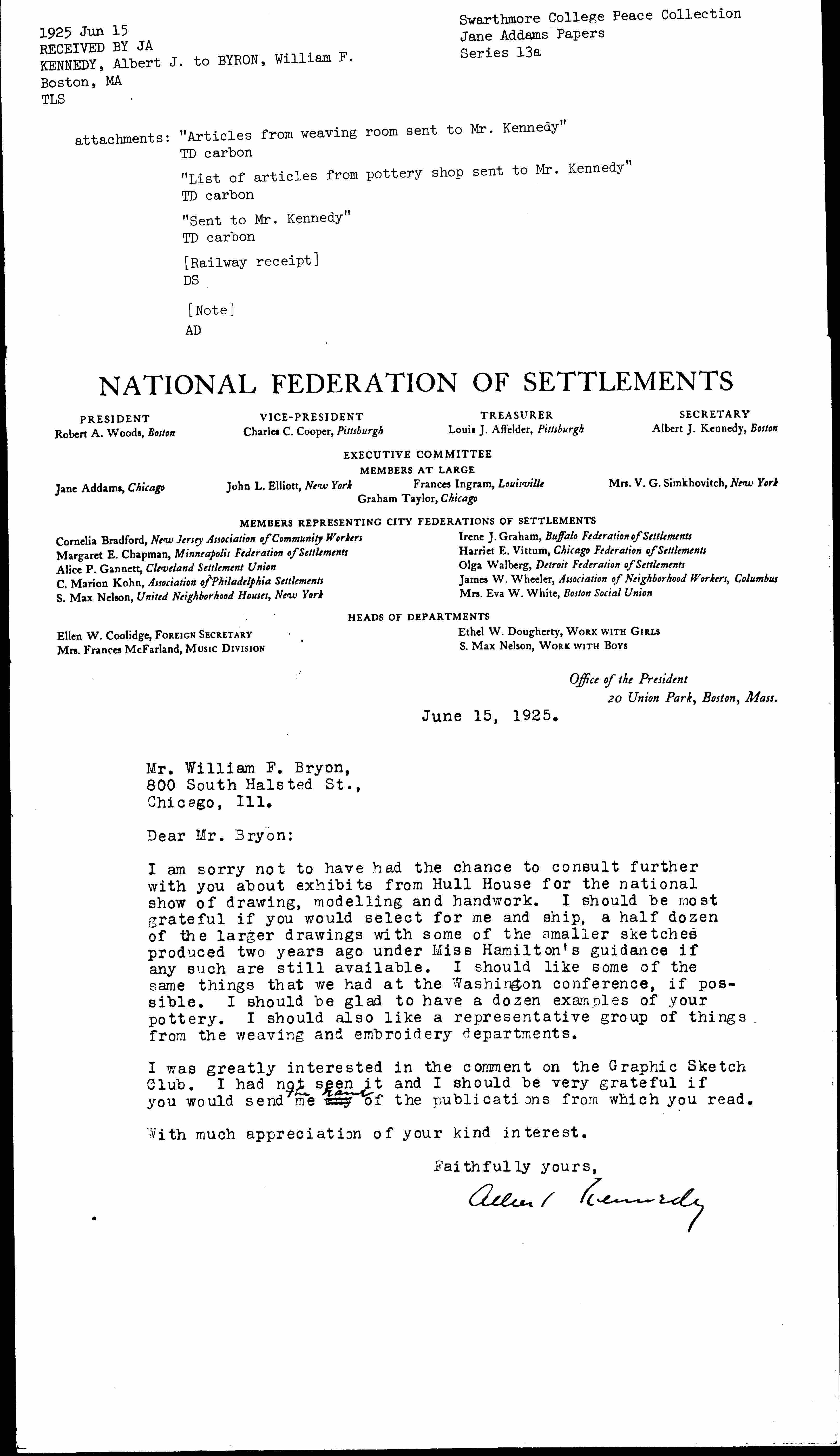 I am sorry not to have had the chance to consult further with you about exhibits from Hull House for the national show of drawing, [modeling] and handwork. I should be most grateful if you would select for me and ship, a half dozen of the larger drawings with some of the smaller sketches produced two years ago under Miss Hamilton's guidance if any such are still available. I should like some of the same things that we had at the Washington conference, if possible. I should be glad to have a dozen examples of your pottery. I should also like a representative group of things from the weaving and embroidery departments.