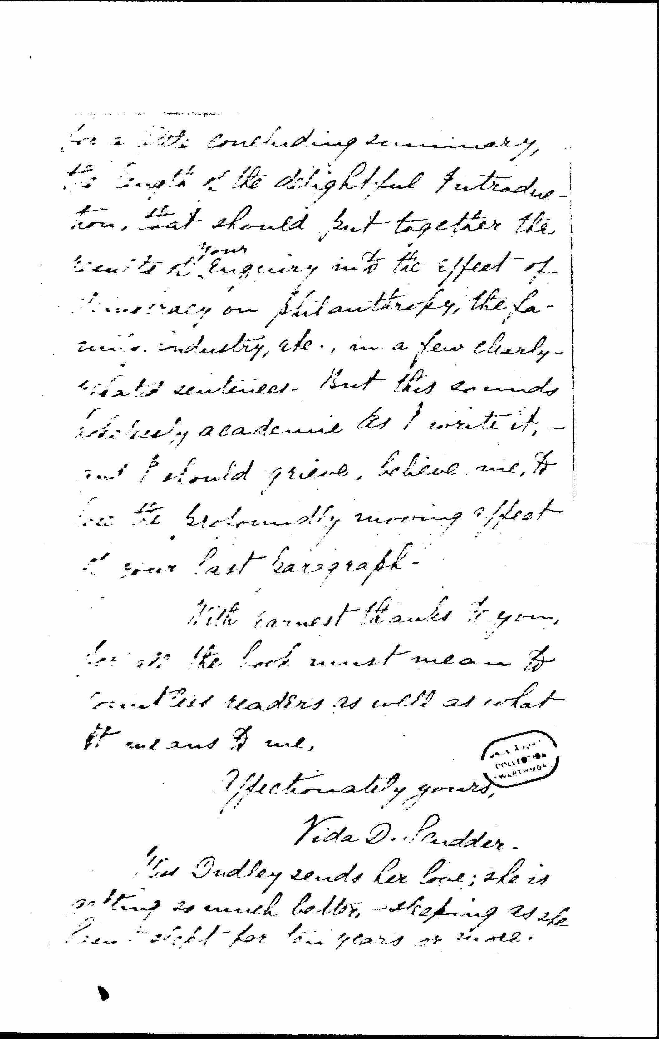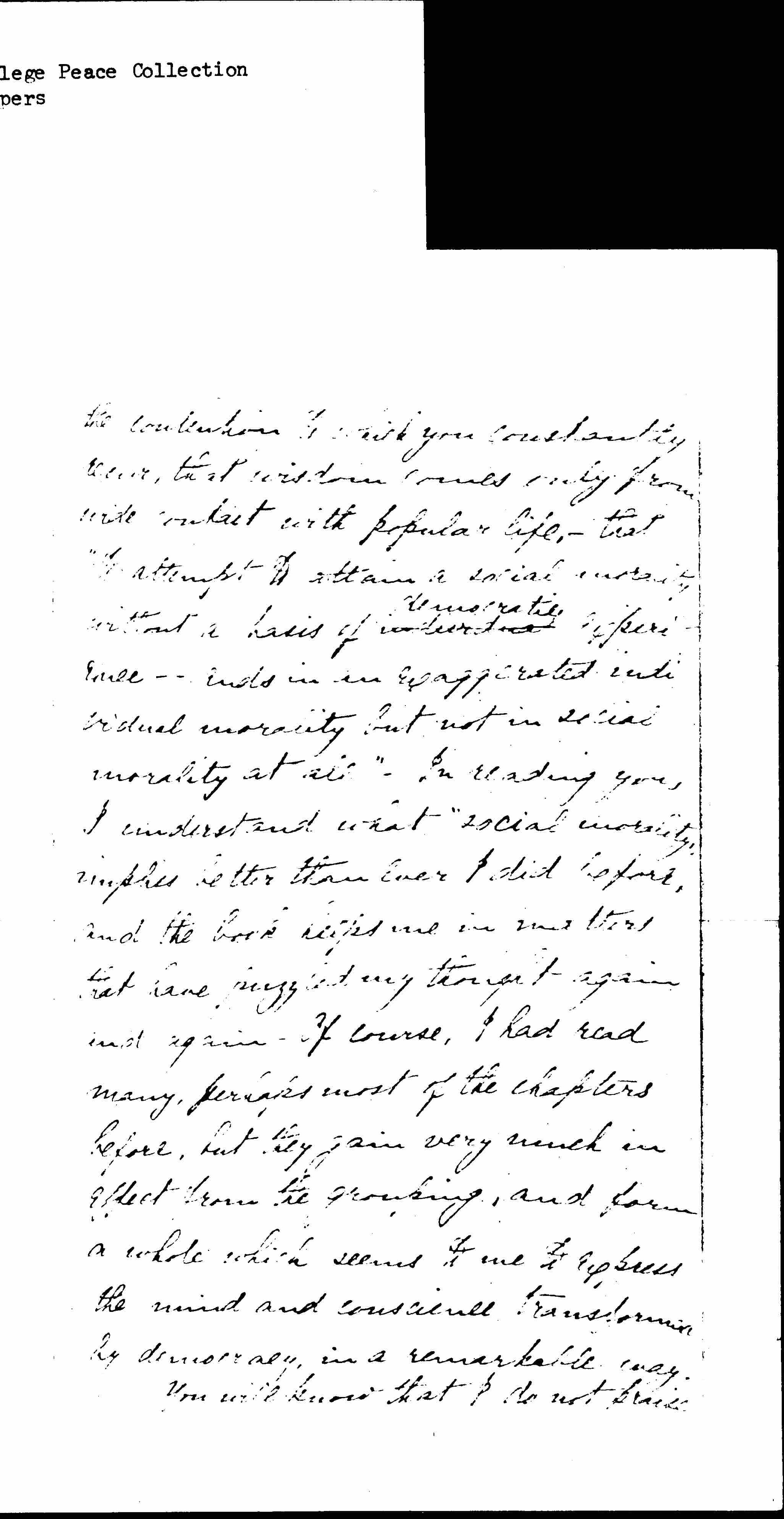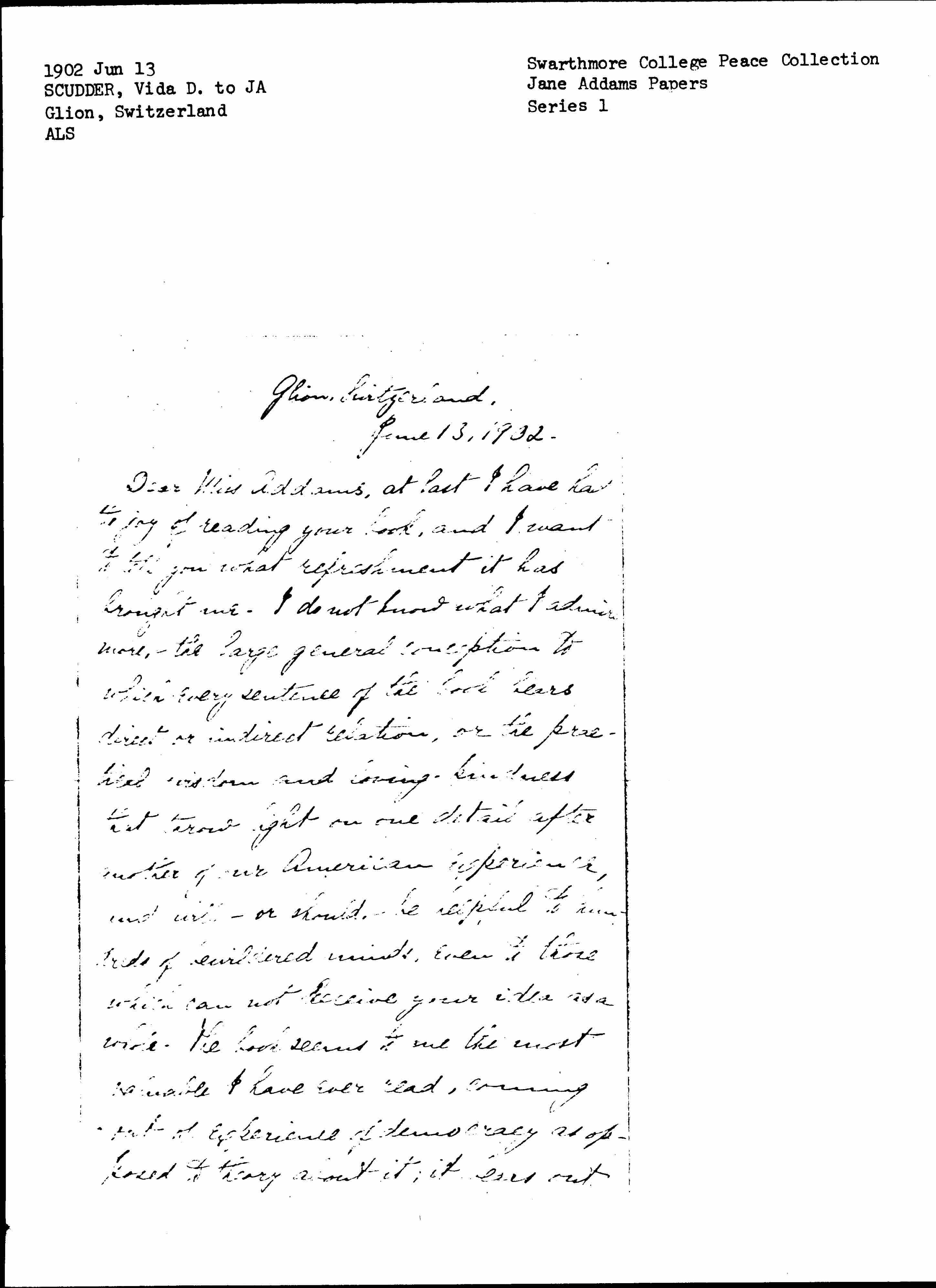 Dear Miss Addams, at last I have had the joy of reading your book, and I want to tell you what refreshment it has brought me. I do not know what I admire more,--the large general conception to which every sentence of the book bears direct or indirect relation, or the practical wisdom and loving kindness that throws light on one detail after another of our American Experience, and will--or should--be helpful to hundreds of bewildered minds, even to those which cannot conceive your idea as a whole. The book seems to me the most valuable I have ever read, coming out of experience of democracy as opposed to theory about it, it leaves out [page 2] the contention to which you constantly [refer?], that wisdom comes only from wide contact with popular life,--that "to attempt to attain a social certainty without a basis of [illegible] ↑democratic↓ experience--ends in an exaggerated individual morality but not in social morality at all"-- In reading you, I understand what "social morality" implies better than ever I did before, and the book helps me in matters that have puzzled my thought again and again-- Of course, I had read many, perhaps most of the chapters before, but they gain very much in effect from the grouping, and form a whole which seems to me to express the mind and conscience transformed by democracy, in a remarkable way.