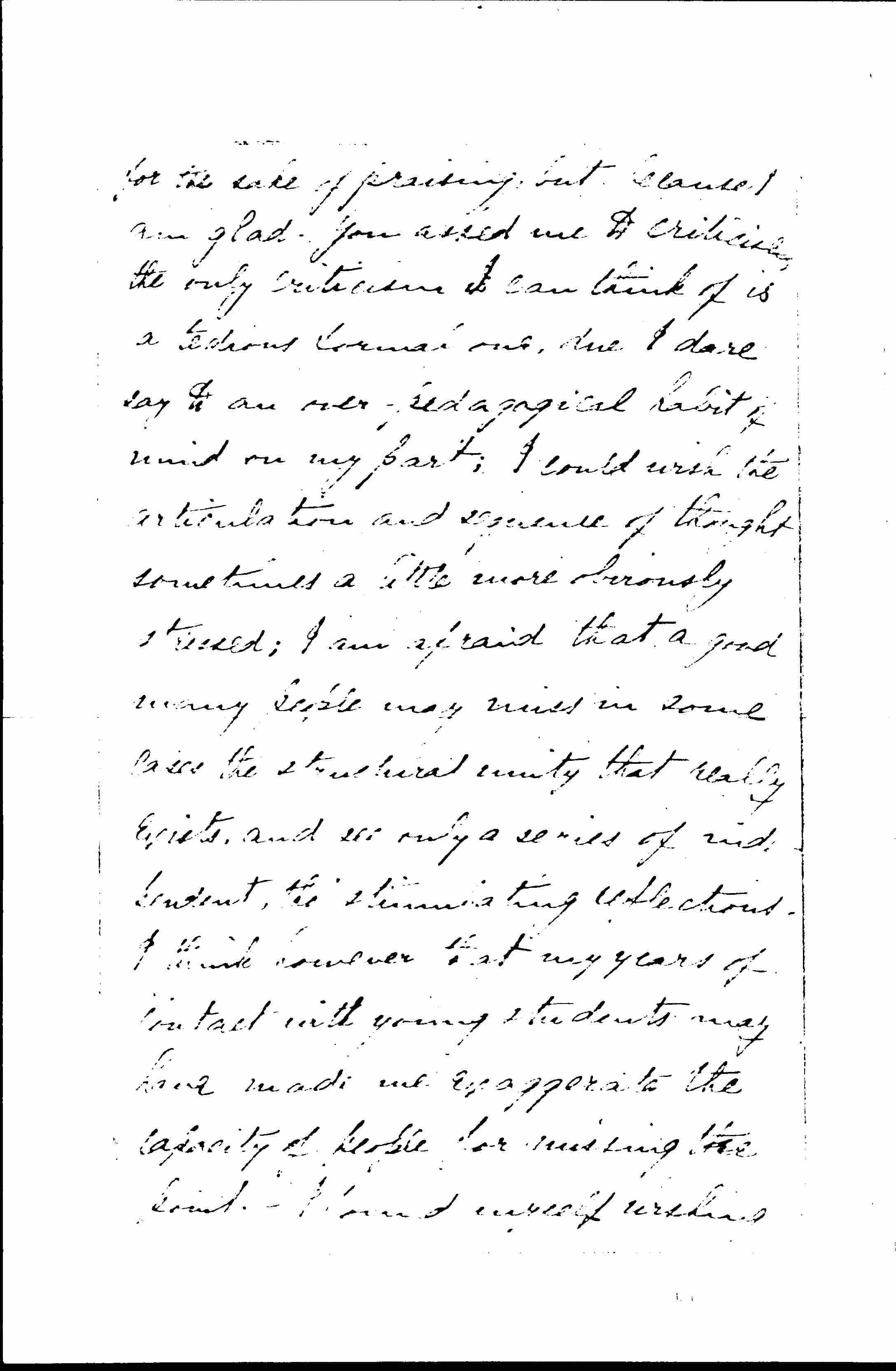 You will know that I do not praise [page 3] for the sake of praising, but because I am glad. You asked me to criticize, the only criticism I can think of is a tedious formal one, due I dare say to an over-pedagogical habit of mind on my part; I could wish the articulation and sequence of thought sometimes a little more obviously stressed; I am afraid that a good many people may miss in some cases the structural unity that really exists, and see only a series of independent, [though] stimulating reflections. I think however that my years of contact with young students may have made me exaggerate the capacity of people for missing the point. I found myself wishing [page 4] for a [little] concluding summary, the length of the delightful introduction, that should put together the results of ↑your↓ enquiry into the effect of democracy on philanthropy, the family, industry, etc., in a few clearly related sentences. But this sounds helplessly academic as I write it,--and I should grieve, believe me, to lose the profoundly moving effect of your last paragraph.
