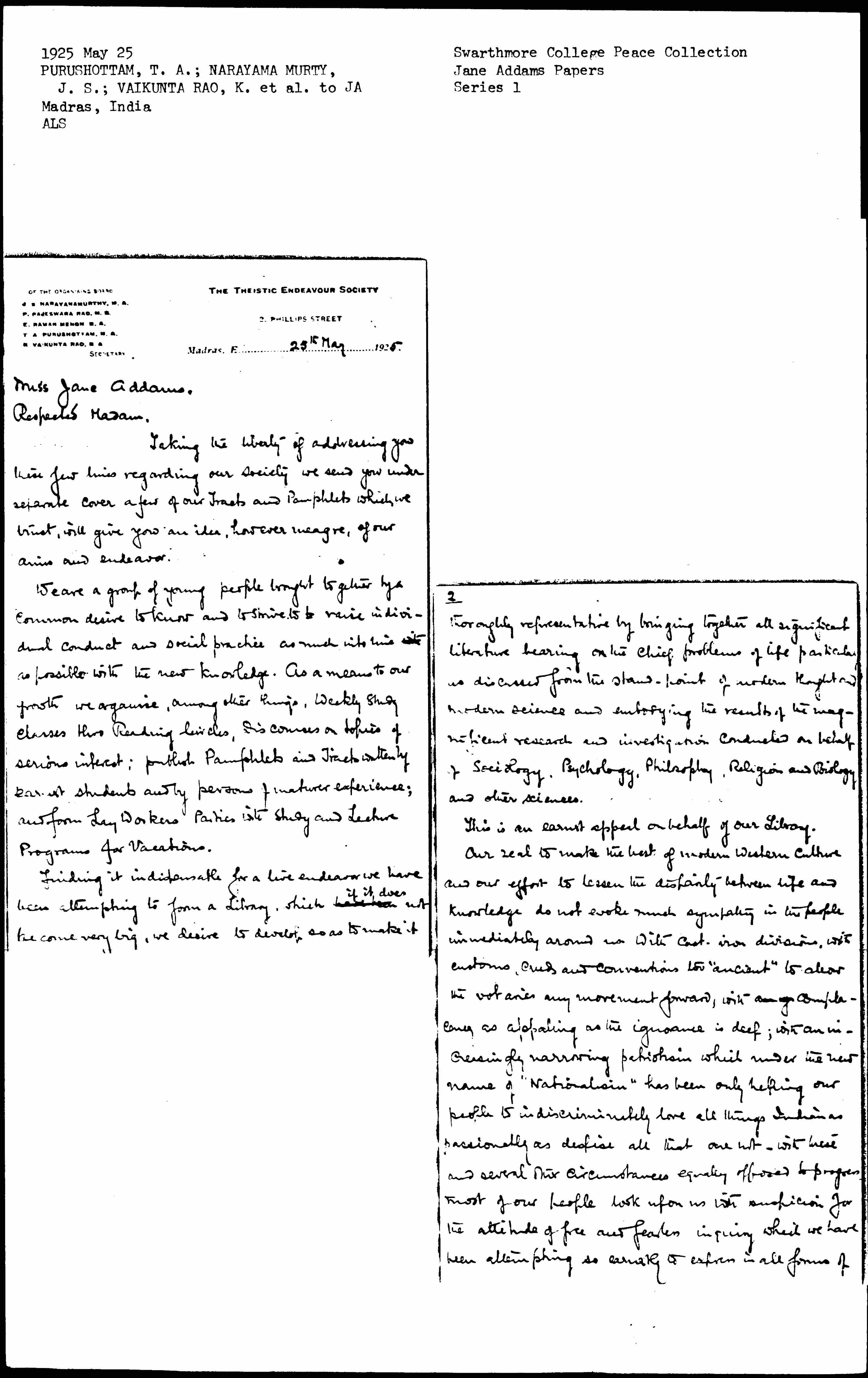 Our zeal to make the best of modern Western Culture and our effort to lessen the disparity between life and knowledge do not evoke much sympathy in the people immediately around us with cast-iron divisions, with customs, creeds and conventions too "ancient" to allow the votaries any movement forward, with [illegible]complacency as appalling as the ignorance is deep; with an increasingly narrowing patriotism which under the new name of "Nationalism" has been only helping our people to indiscriminately love all things Indian as passionately as despise all that are not. With these and several circumstances equally opposed to progress most of our people look upon us with suspicious for the attitude of the free and fearless inquiry which we have been attempting so earnestly to express in all forms of [page 3] action and which, also, we have been encouraging in others in the measure of our opportunities. An uncompromising attitude with which we endeavor is worth the making these means an inadequate support. Hence this appeal across this distance to you as a friend of culture and progressive endeavor.